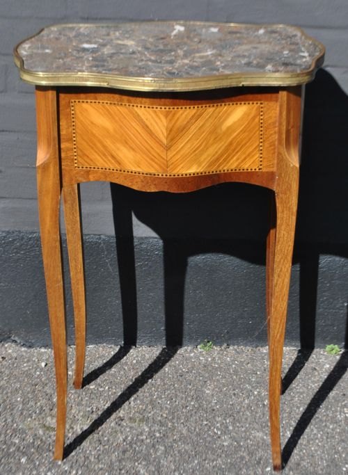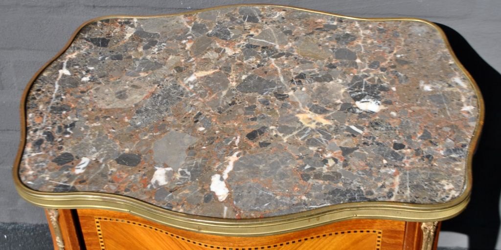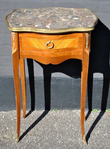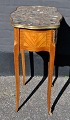 Französischer Lampentisch, 20. Jahrhundert. Mit Intarsien. Mit Messingkante und bunter Marmorplatte. Mit Bronzeschuh. H: 69 cm. B: 47 cm. T: 36 cm.Perfekter Zustand!