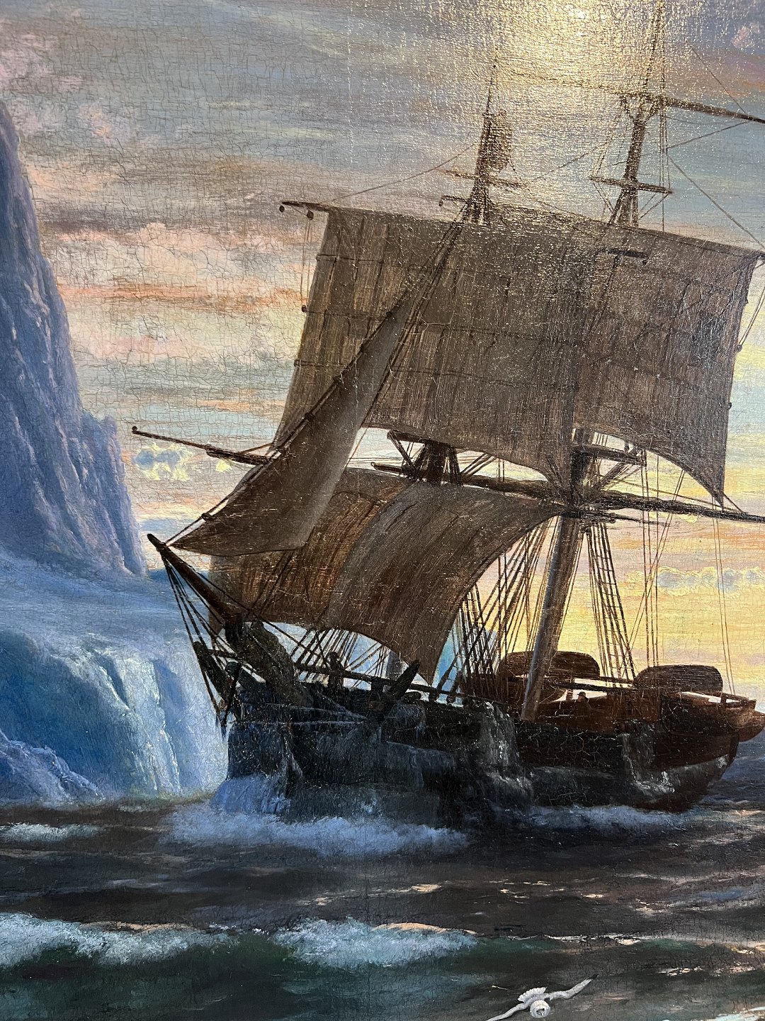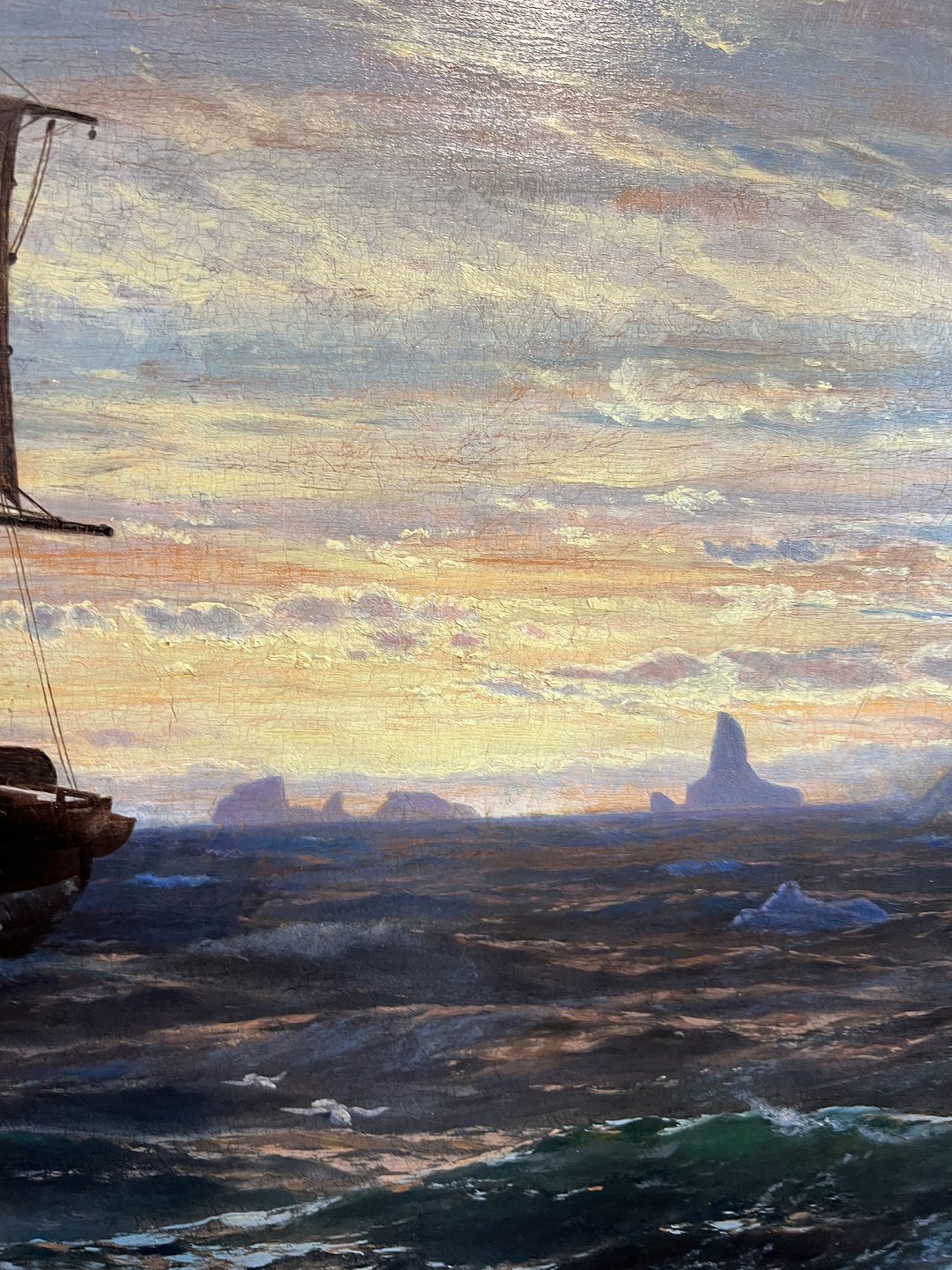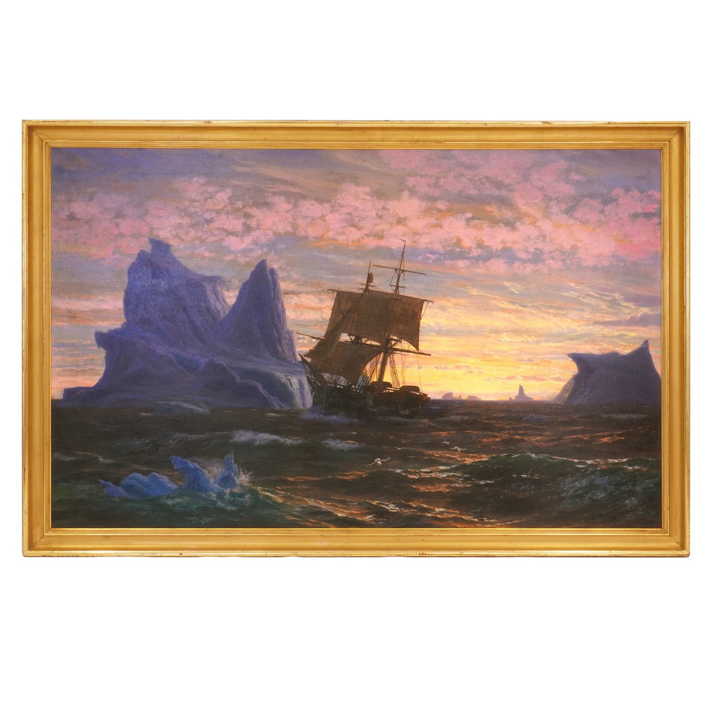 I E C Rasmussen parti fra Grønland med skib, isbjerge og solnedgangJens Erik Carl Rasmussen, 1841-93, olie på lærred