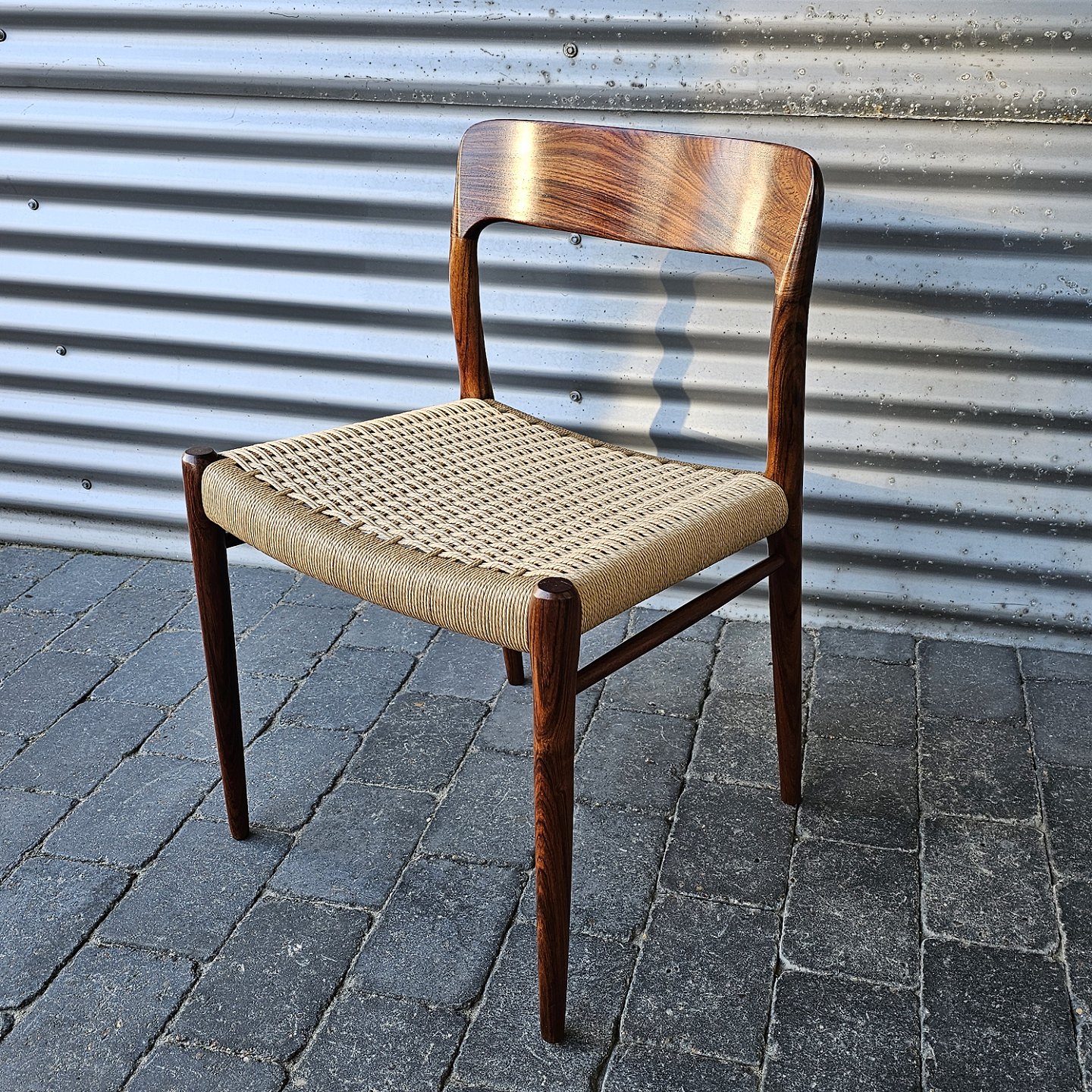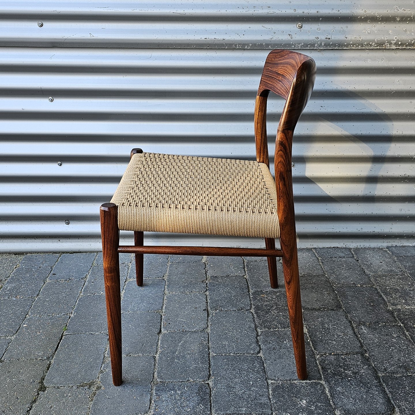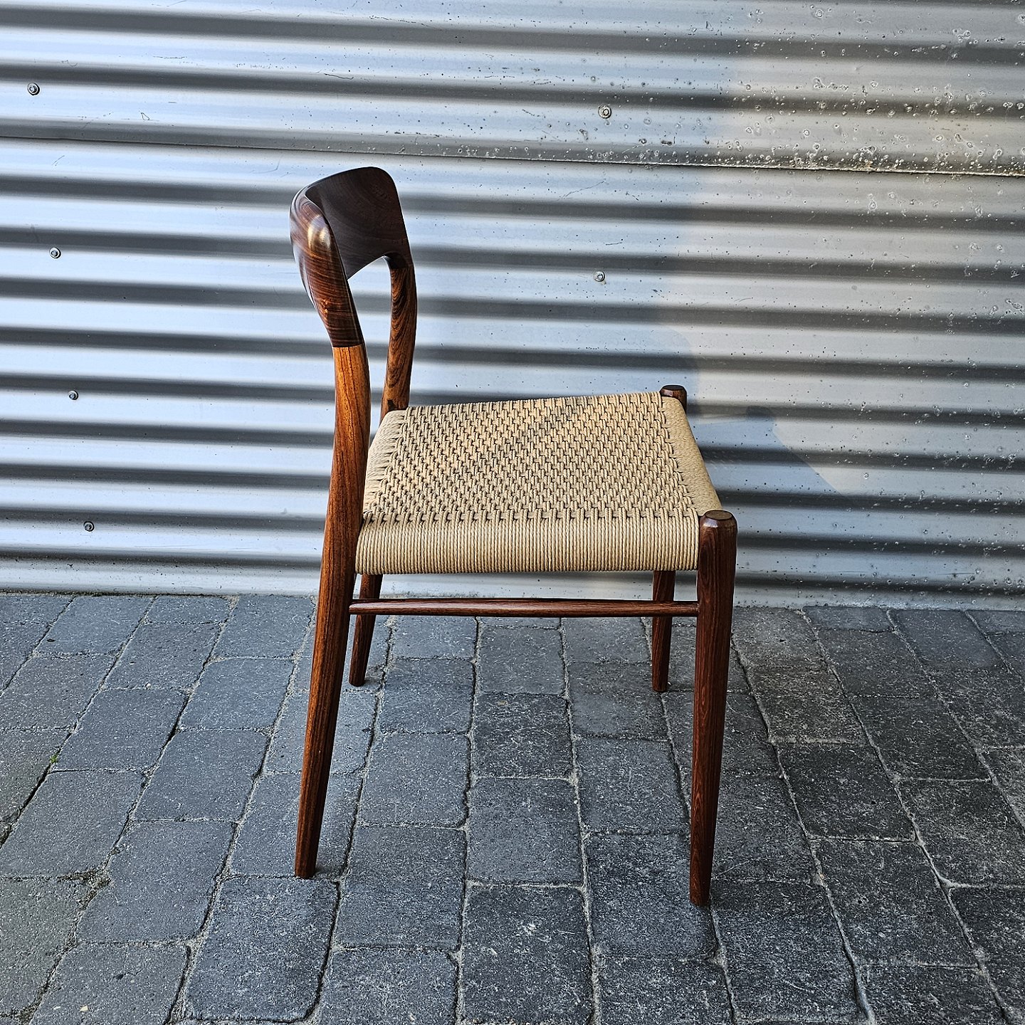 Sæt med seks styk spisebordsstole model 75 i palisander med ny flettede sæder. Et sjældent sæt med meget flot palisander træ.Design Niels O. Møller