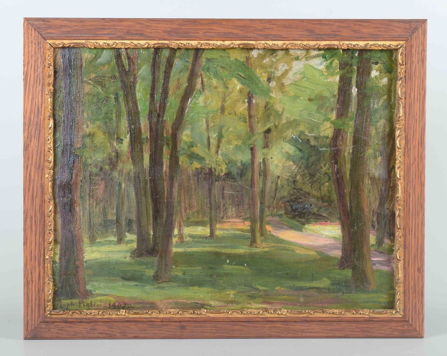 Et stemningsfuldt naturmotiv med en sti gennem en tætbevokset skov, malet i grønne og gyldne toner. Værket fanger lysets spil i løvtaget og skaber en rolig atmosfære, hvor naturens rytme træder tydeligt frem.