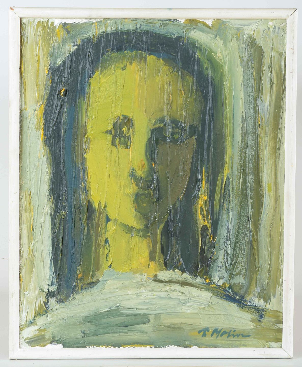 Et ekspressivt portræt udført i en kraftig og pastos penselføring, hvor grønne, gule og blå nuancer dominerer. Figuren fremstår både stiliseret og rå, med en nærmest drømmeagtig karakter, understreget af de stærke kontraster og den stoflige overflade.