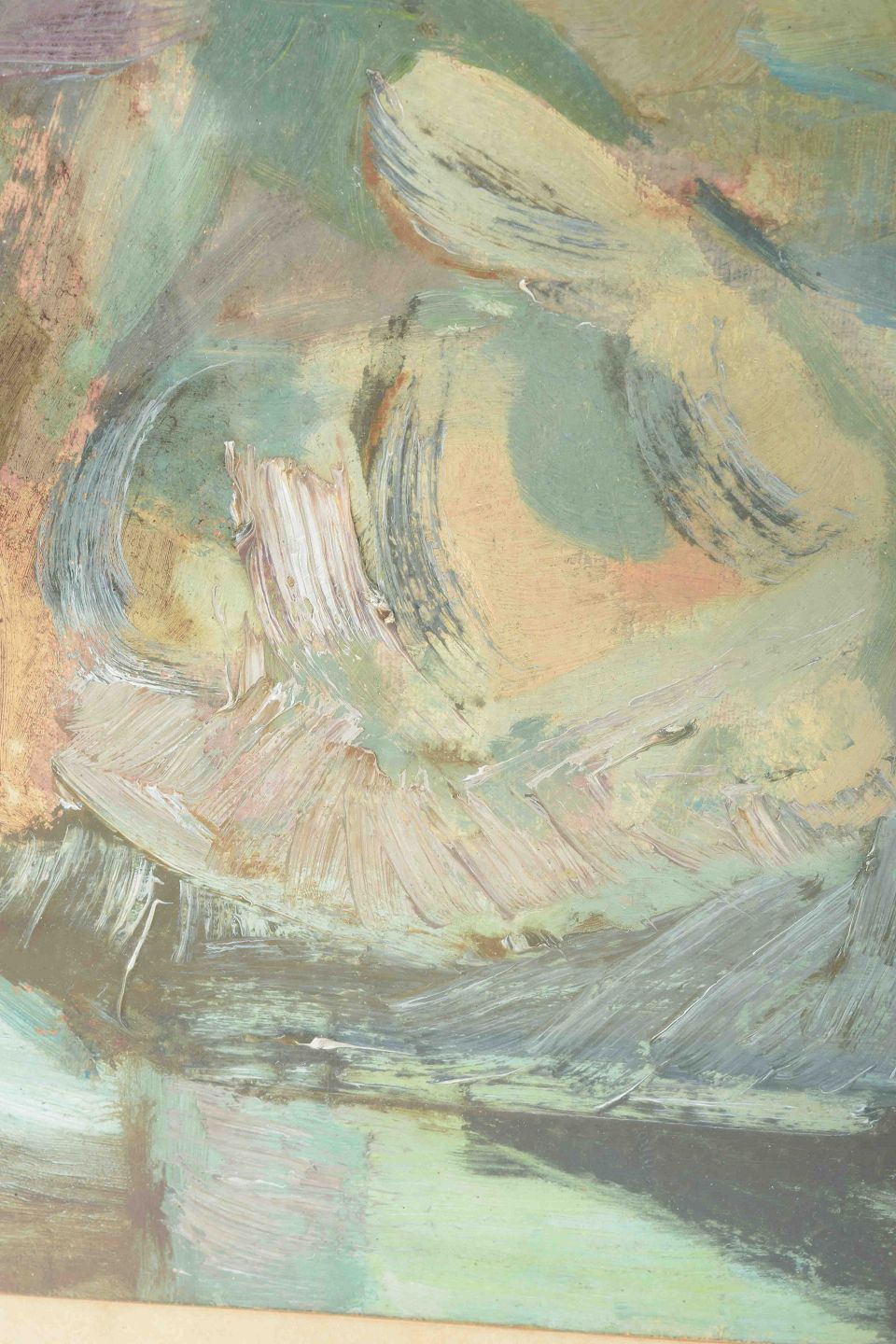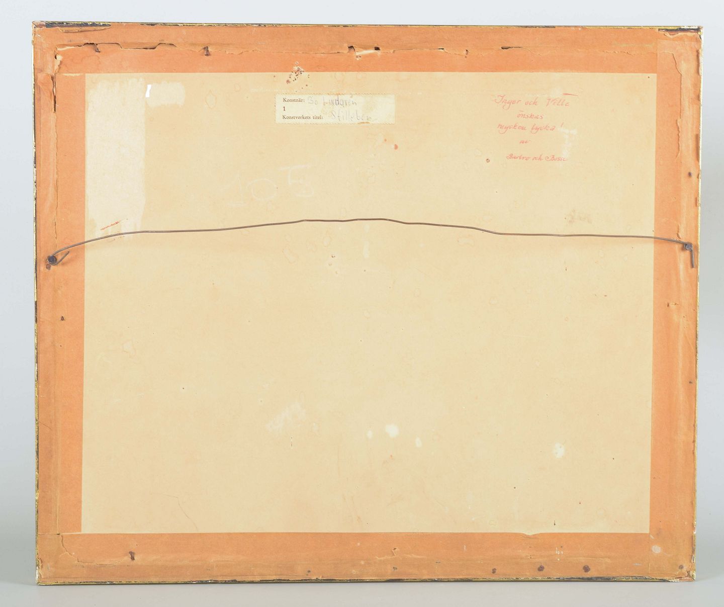 Et ekspressivt abstrakt værk med fejede penselstrøg i grønne, blå og brune toner, der skaber en levende fornemmelse af rytme og bevægelse. Malet under Lindgrens tidlige udforskninger af abstraktion i slutningen af 1950’erne, afspejler værket hans fokus på farvens materialitet og den dynamiske komposition.