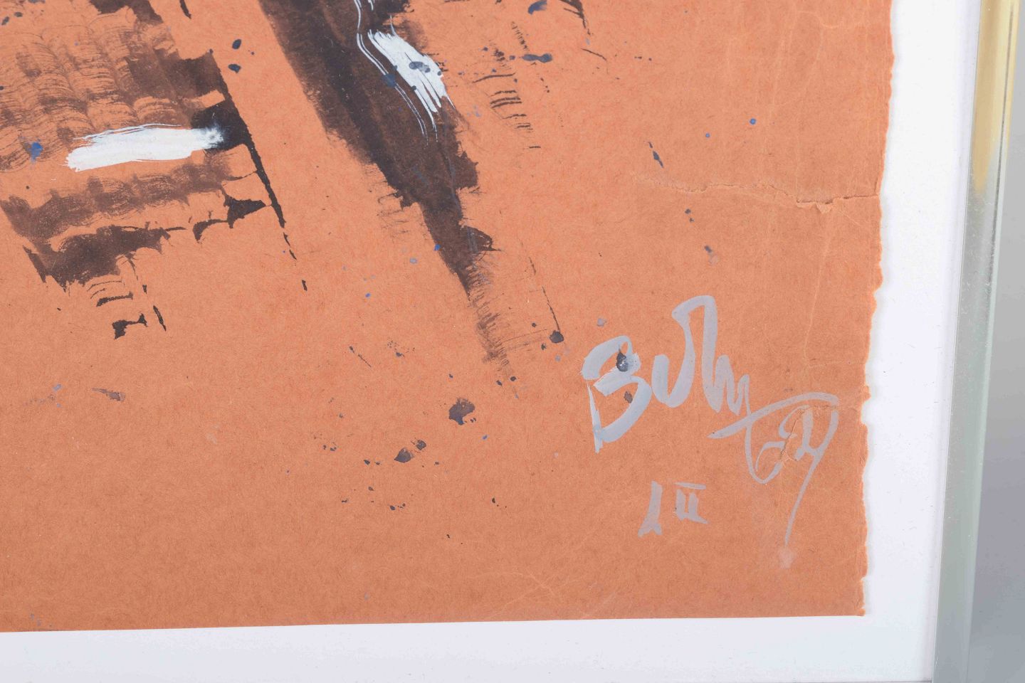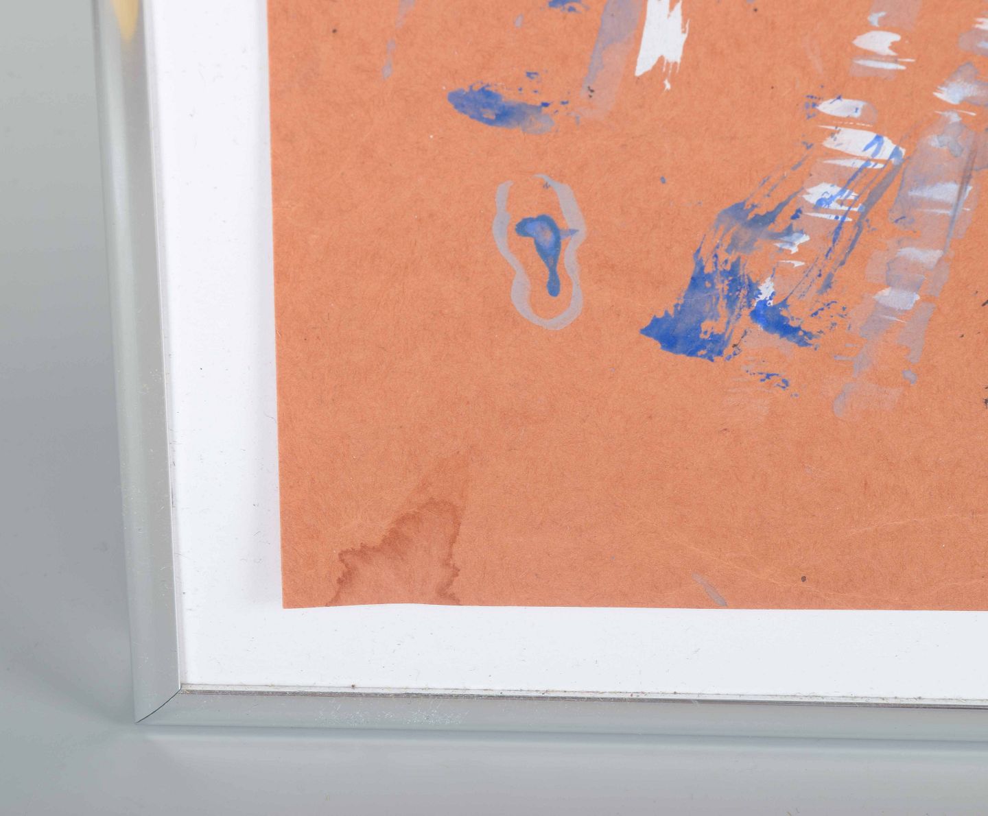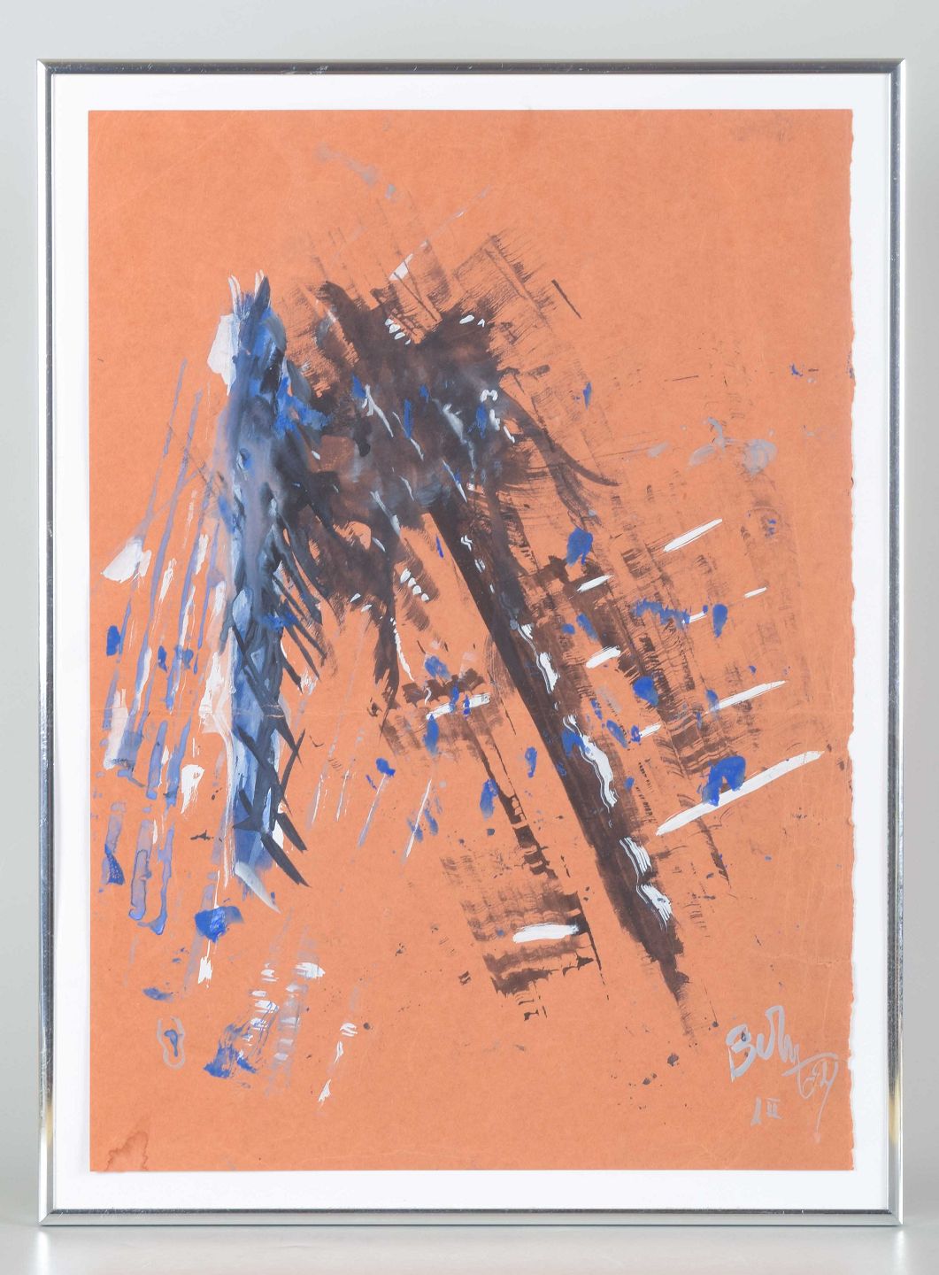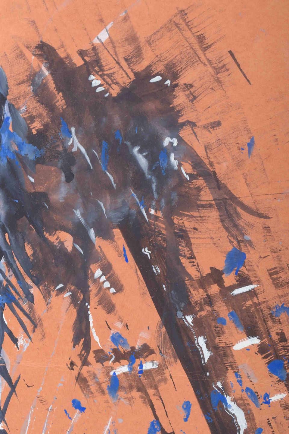 Et ekspressivt abstrakt værk udført på rustrødt papir med kraftige penselstrøg i blå, sort og hvid. Kompositionen er præget af dynamiske bevægelser og kontrasterende farvefelter, hvor spor af lagdeling og spontane markeringer giver en energisk og rå karakter. Værket bærer tydelige tegn på kunstnerens umiddelbare gestiske udtryk.