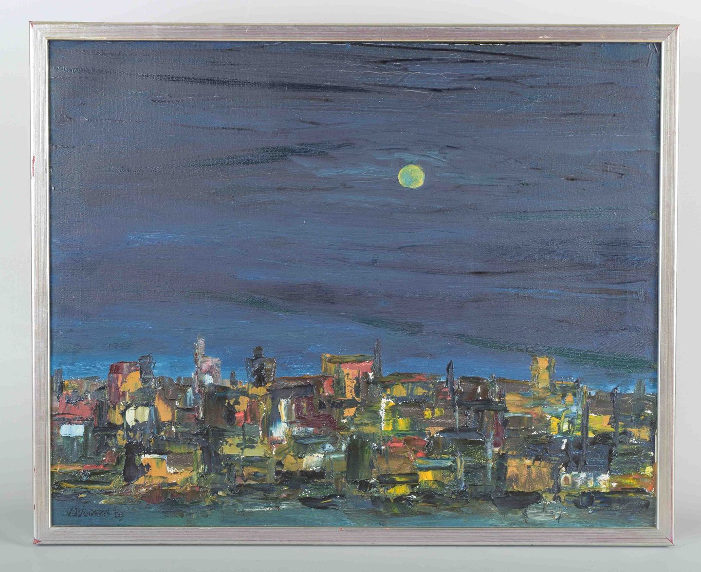Et ekspressivt nattebymotiv med måne og byens lys under en mørk himmel, skildret med kraftige penselstrøg og intens farvebrug.