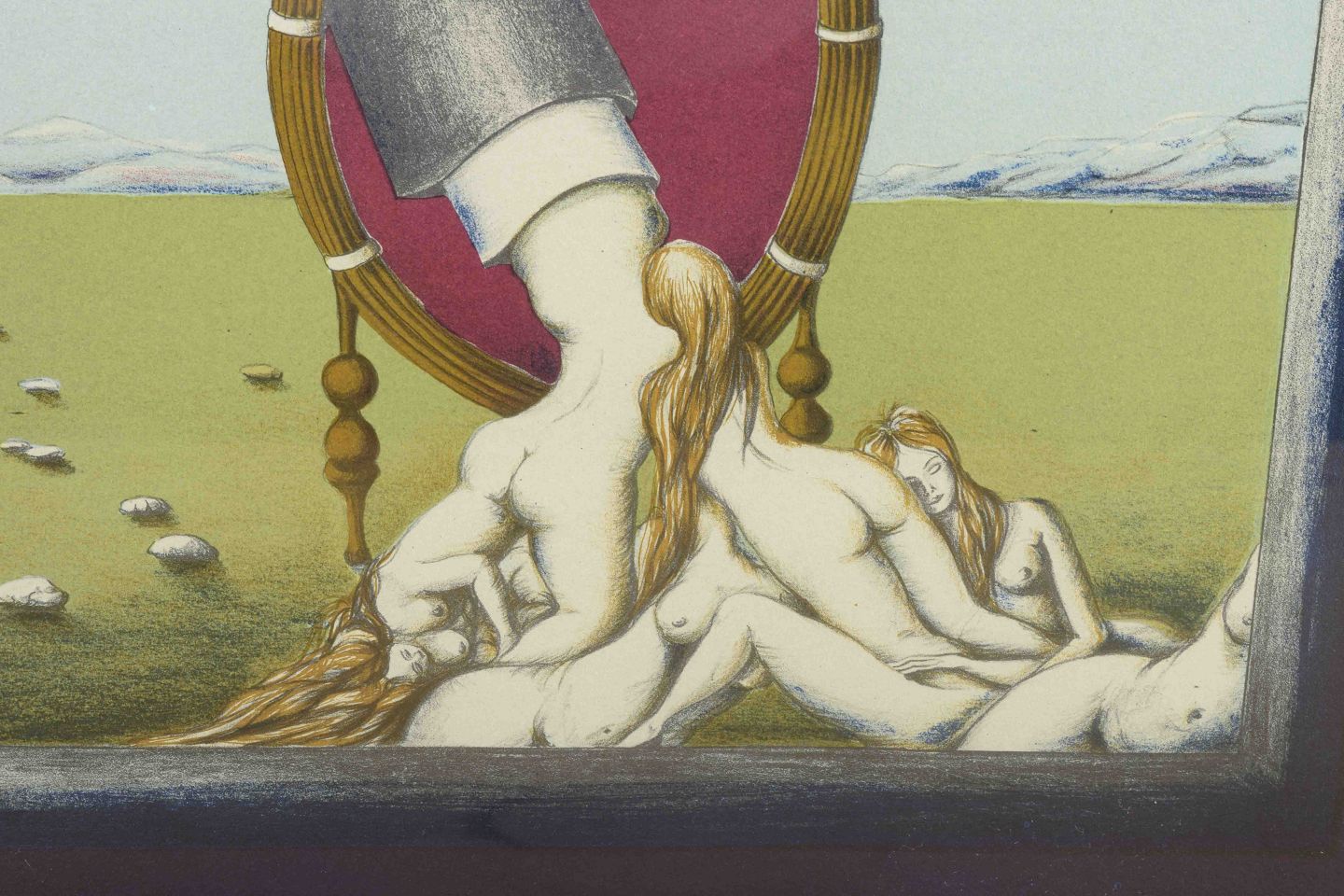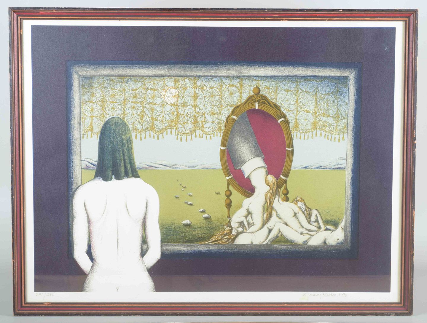 Et surrealistisk litografi af den svenske kunstner Bert Johnny Nilsson, signeret og dateret 1970, nummereret 241/275. Motivet viser en nøgen figur set bagfra foran et vindue, hvor en surrealistisk scene med spejl, kvindefigurer og landskab udfolder sig.