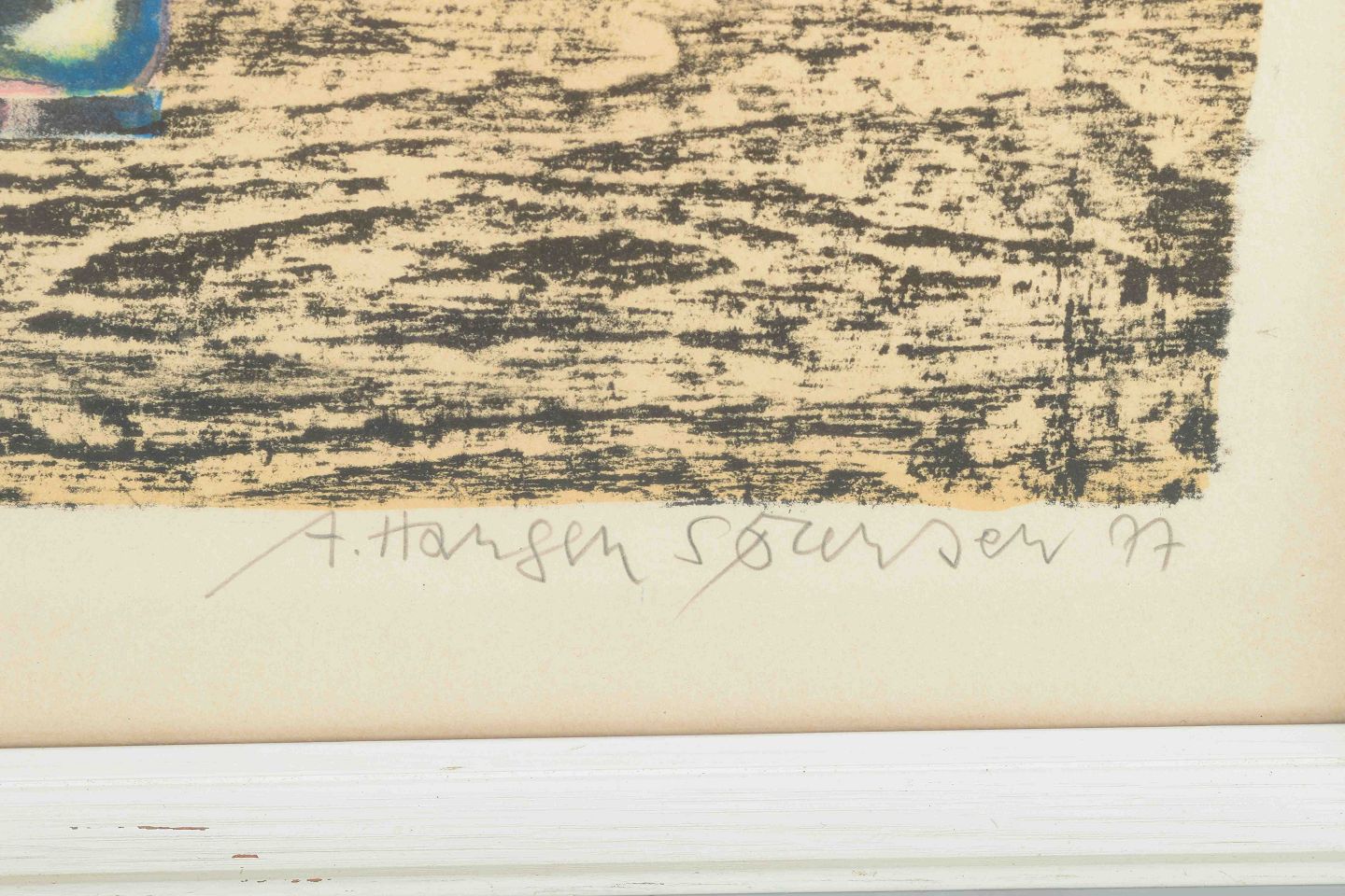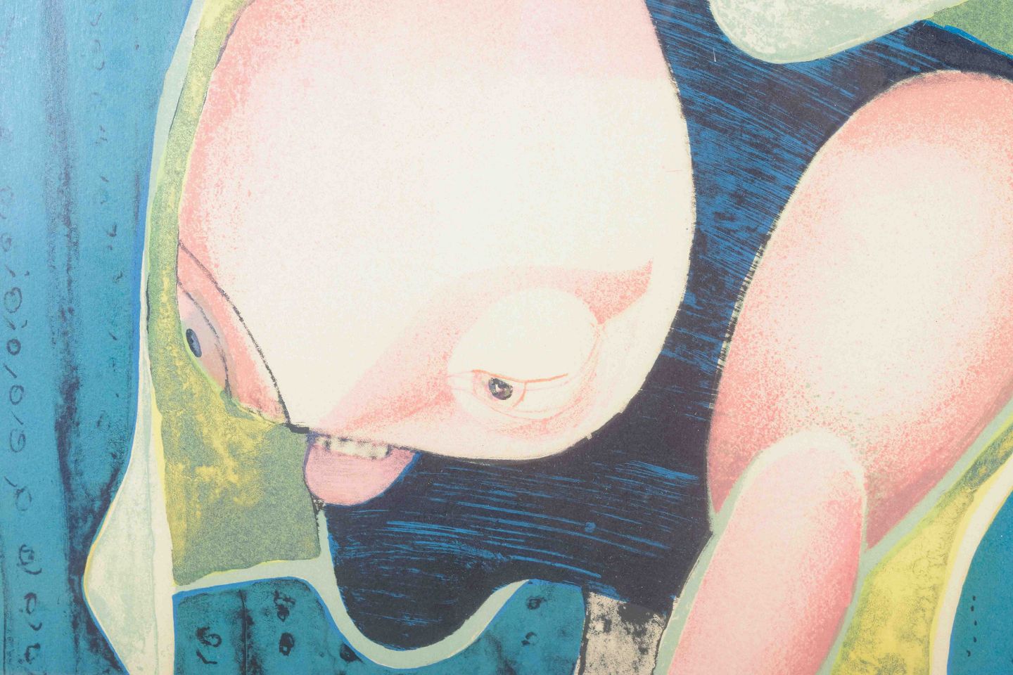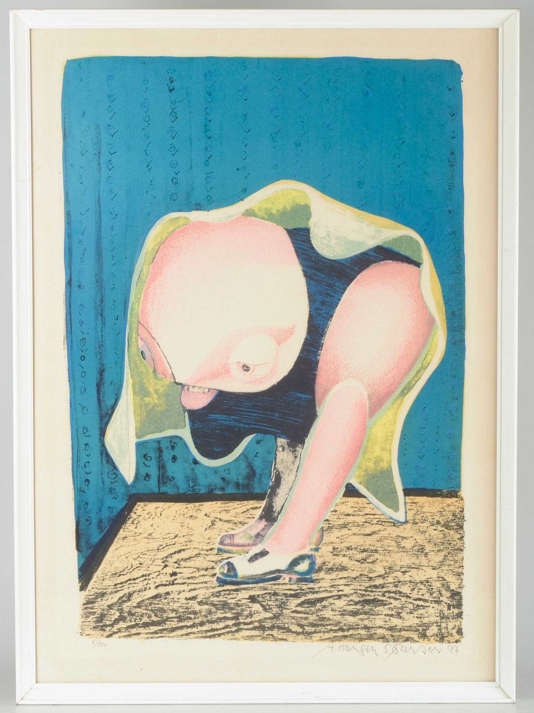 Et ekspressivt og figurativt litografi af Arne Haugen Sørensen, udført i 1977. Værket er udført i stærke kontrastfarver med kunstnerens karakteristiske surrealistiske billedsprog.