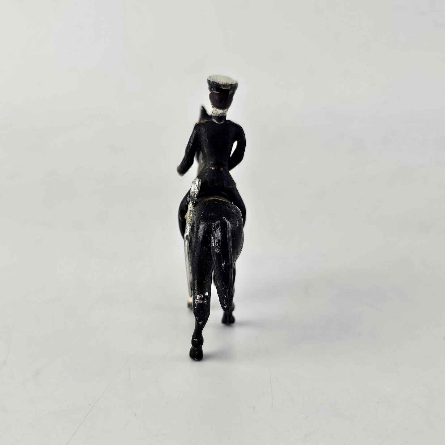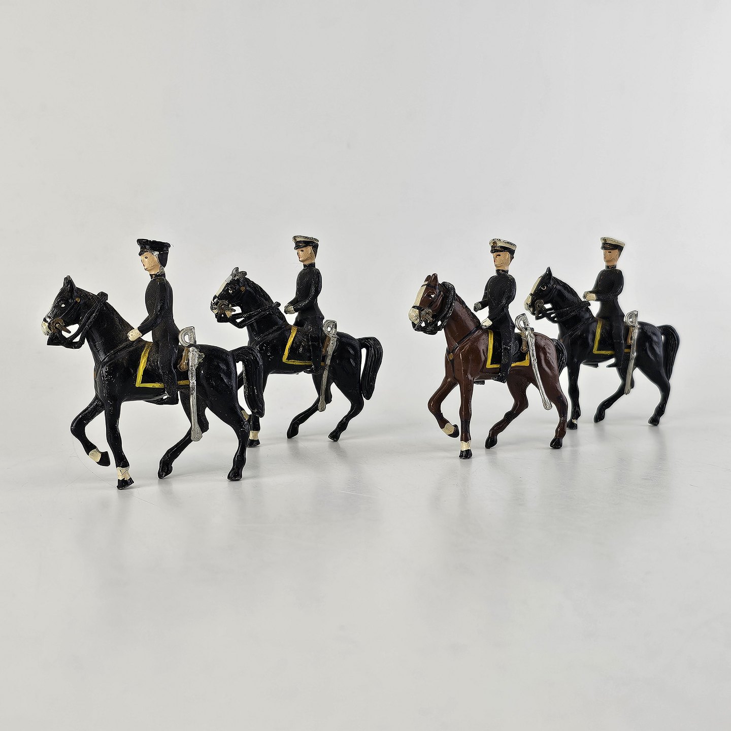 Fem figurer af politifolk i tin, én stående og fire til hestStående figur