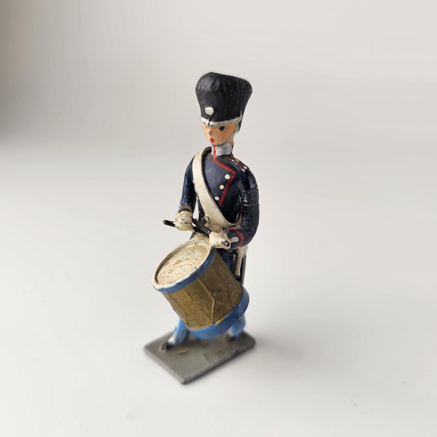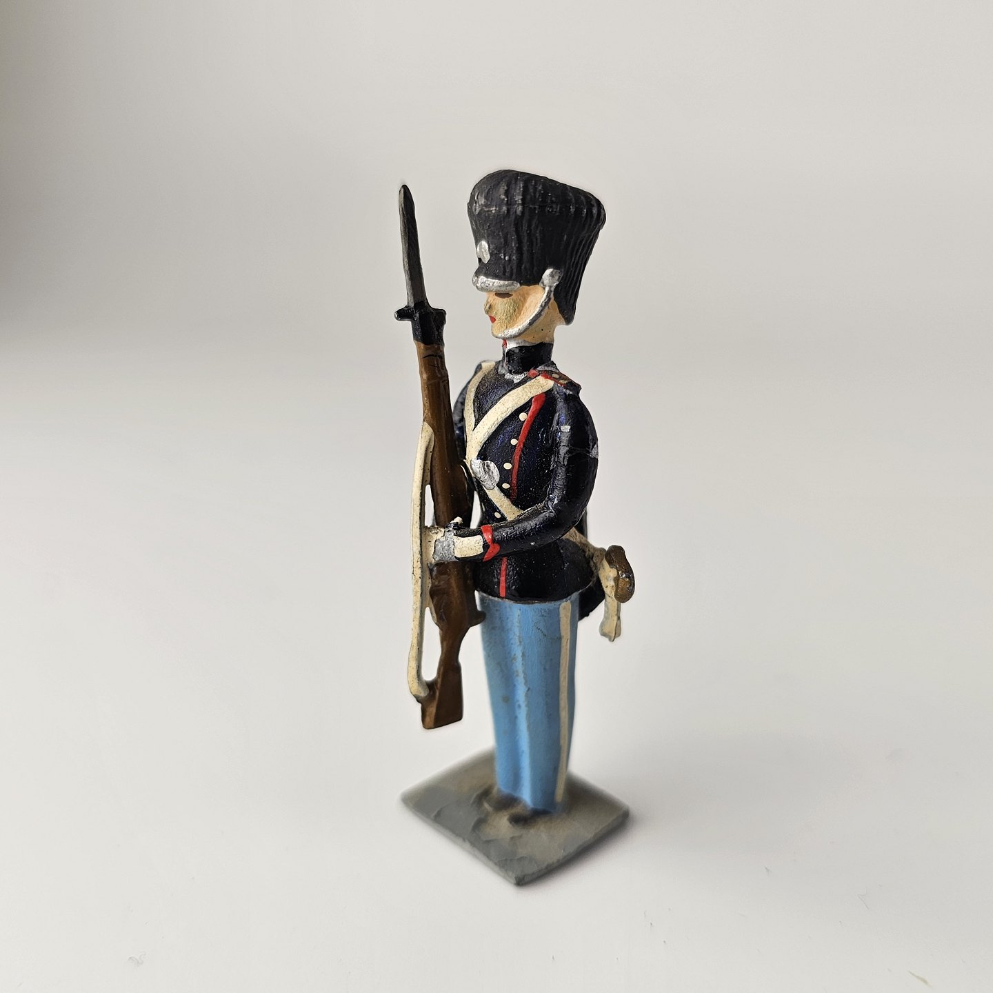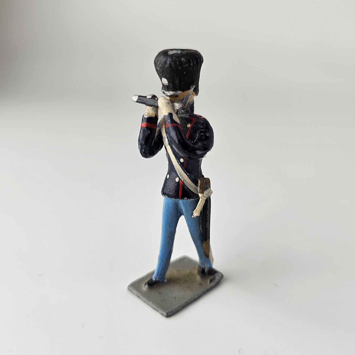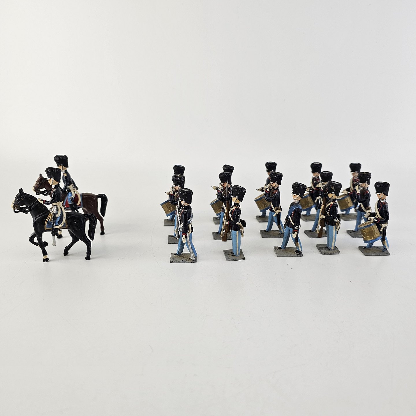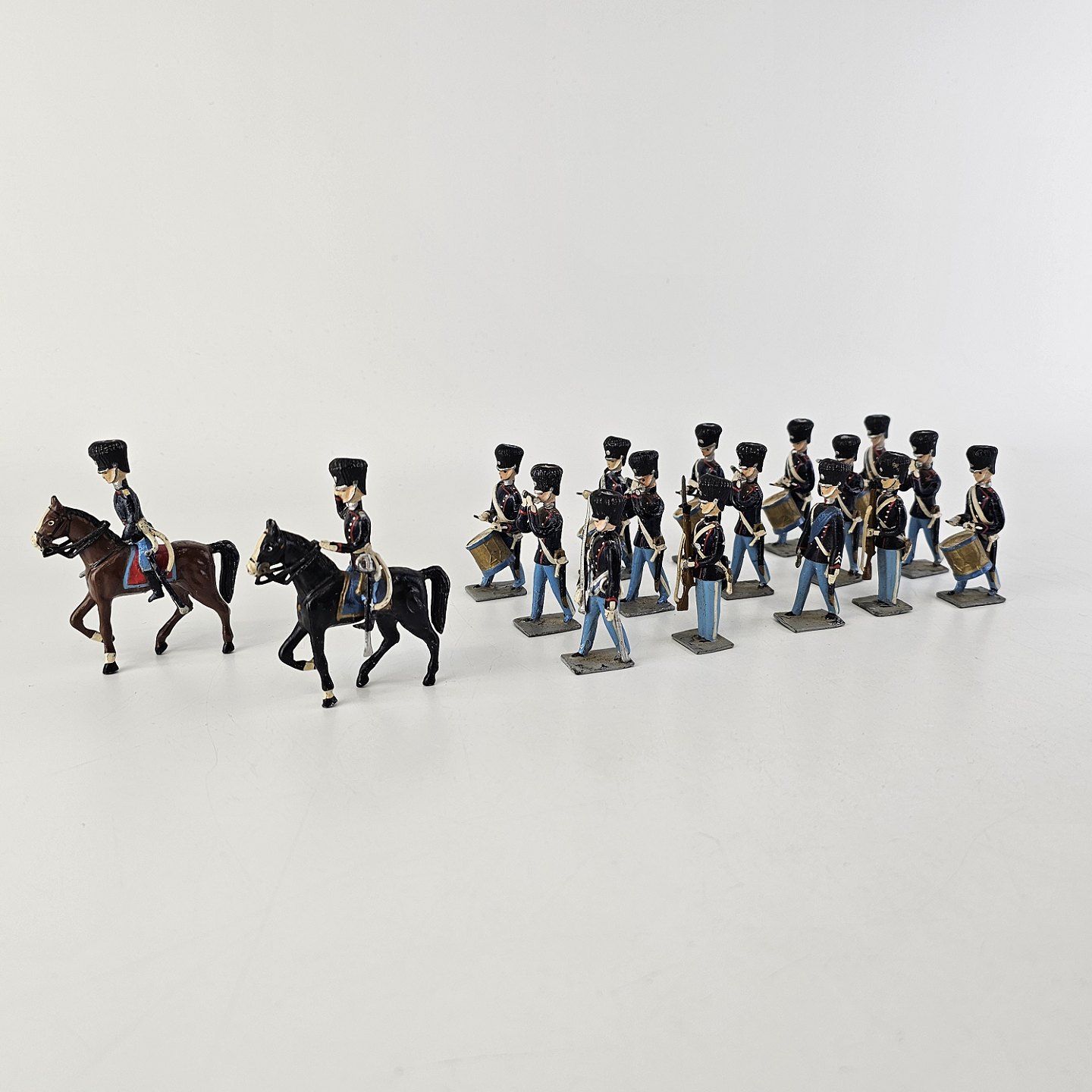 17 figurer af livgarder med bjørnehuer i tin, to til hest og 15 gående med trommer, fløjter, eller våbenStående figurer