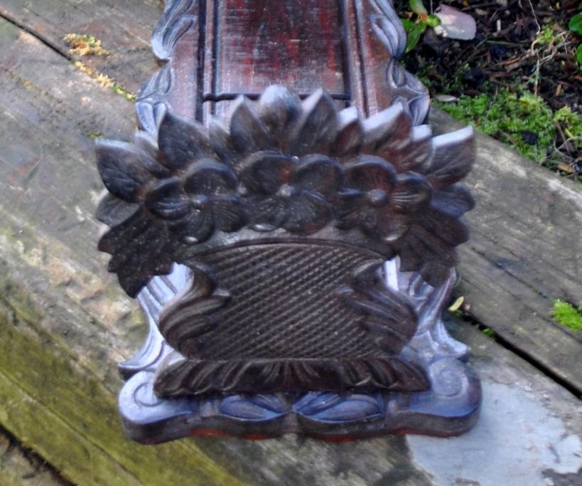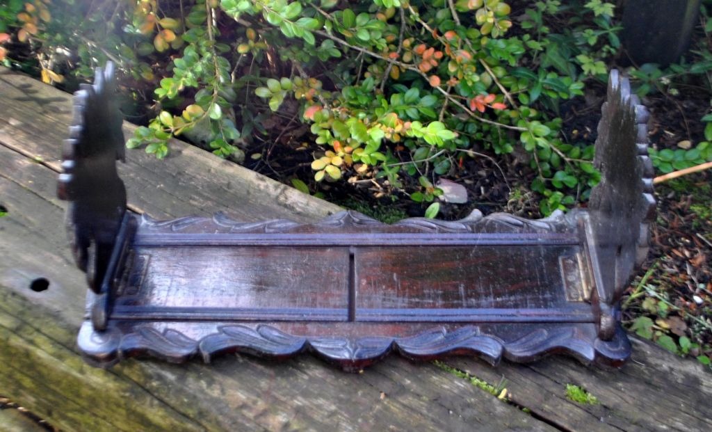 Antiker Reisebücherschrank. 19. Jahrhundert. Wohl Deutschland. Mit Schnitzereien in Form von Körben mit Blumen als Abschluss. H.: 21 cm. Länge aufgebaut: 44 cm. Länge ausgeklappt: 83 cm.Bestellnummer: 28299