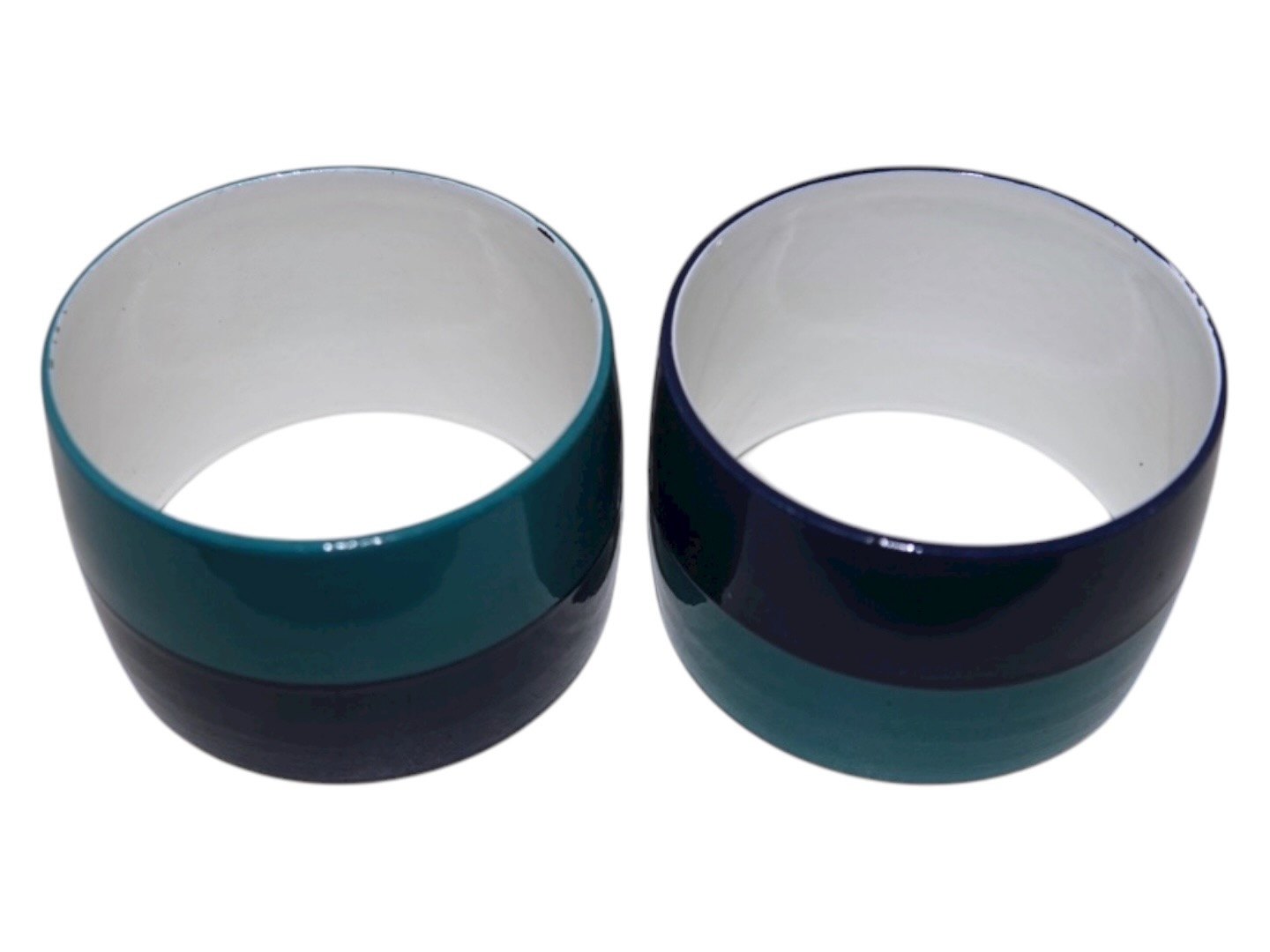 Laurids Lønborg, sæt på seks servietringe i turkis og blå fra 1970'erne. (Der er kun fem på billedet, men der er seks stk.).Diameter 5,0 cm., bredde 3,3 cm.
