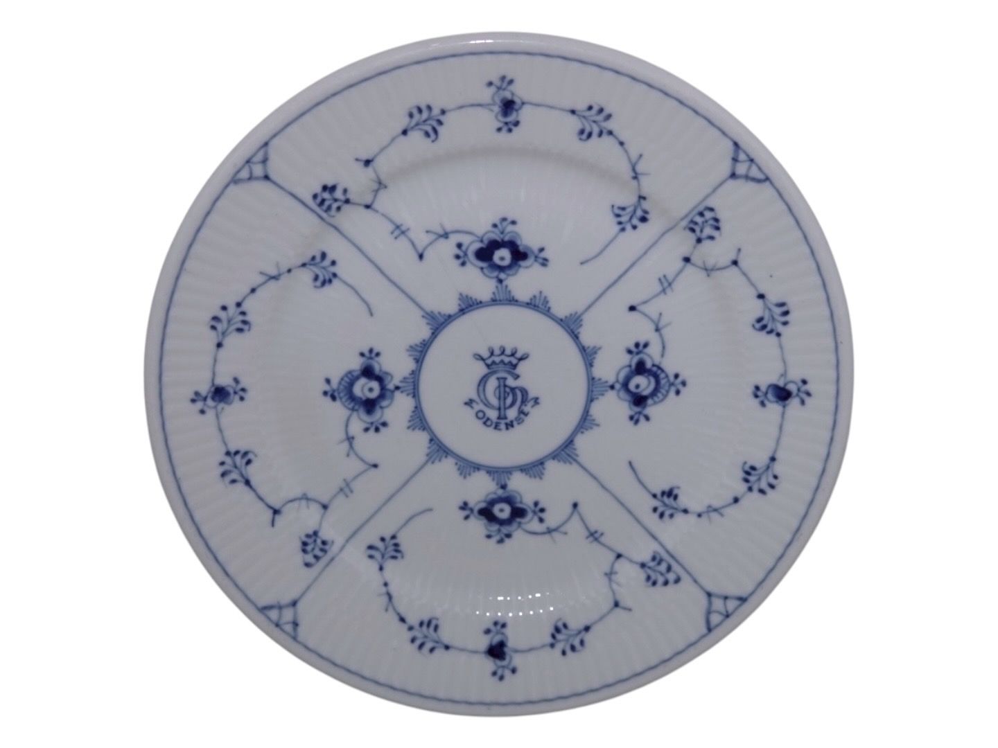Blåmalet JernporcelænSildetallerken med logo fra Odense 19,2 cm.