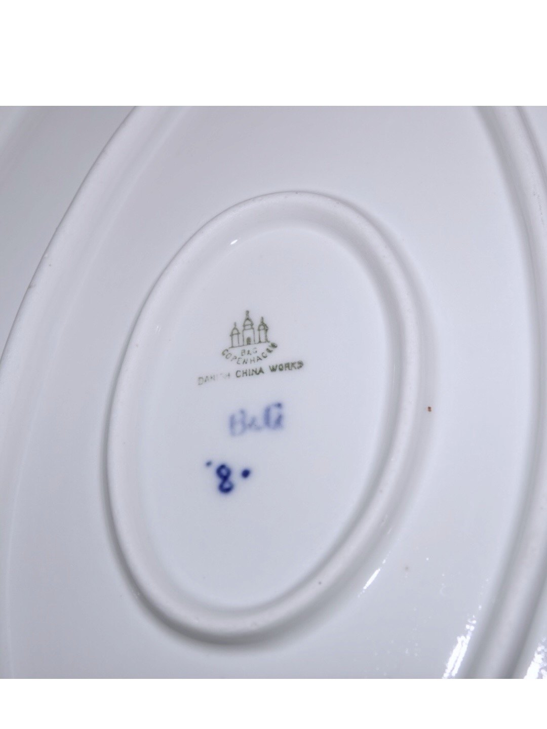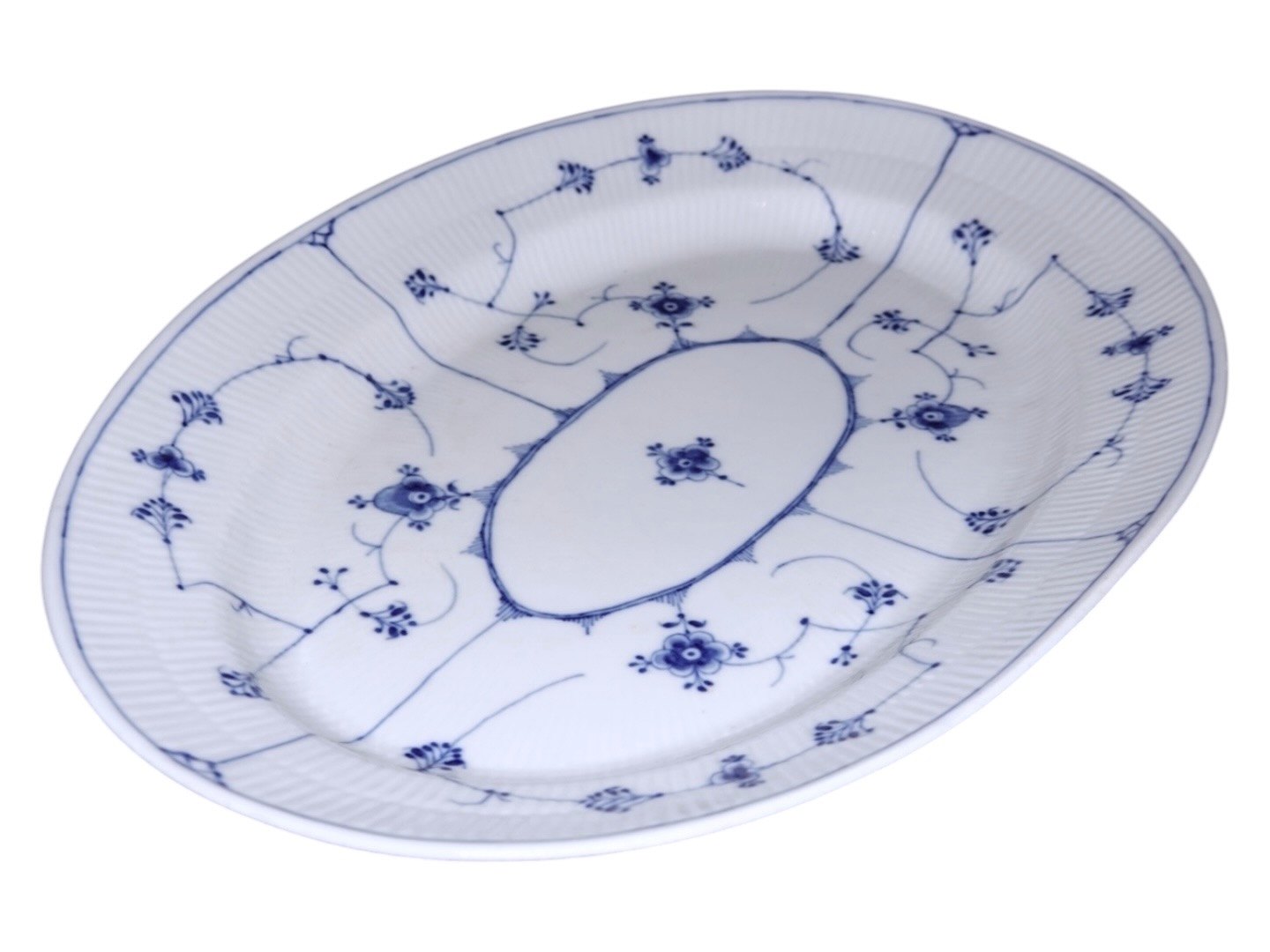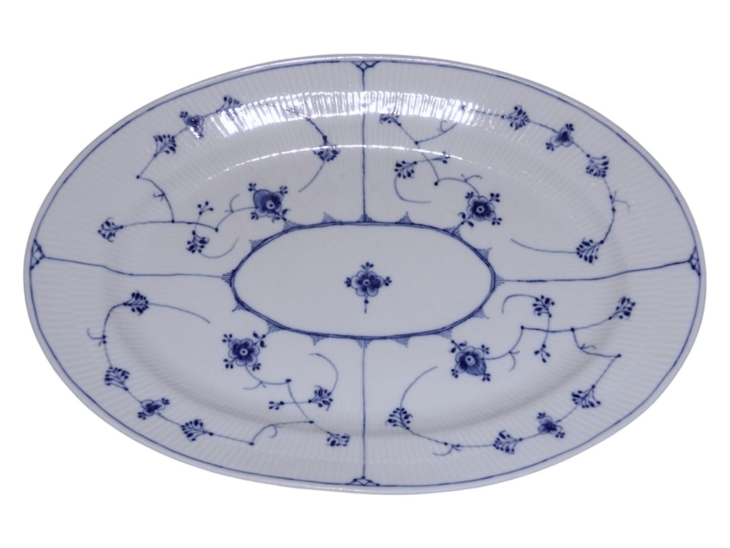 Bing & Grøndahl Blåmalet Riflet (Musselmalet Riflet), stort stegefad.Af fabriksmærket ses det, at denne er produceret mellem 1902 og 1948.