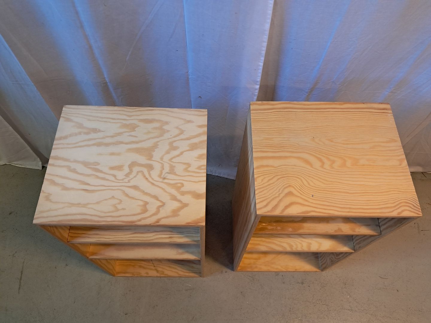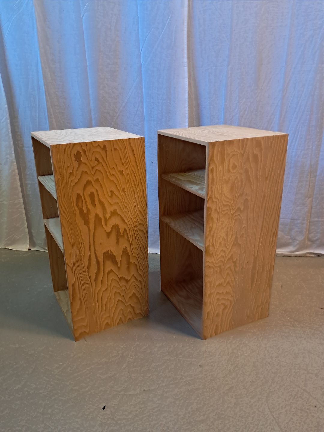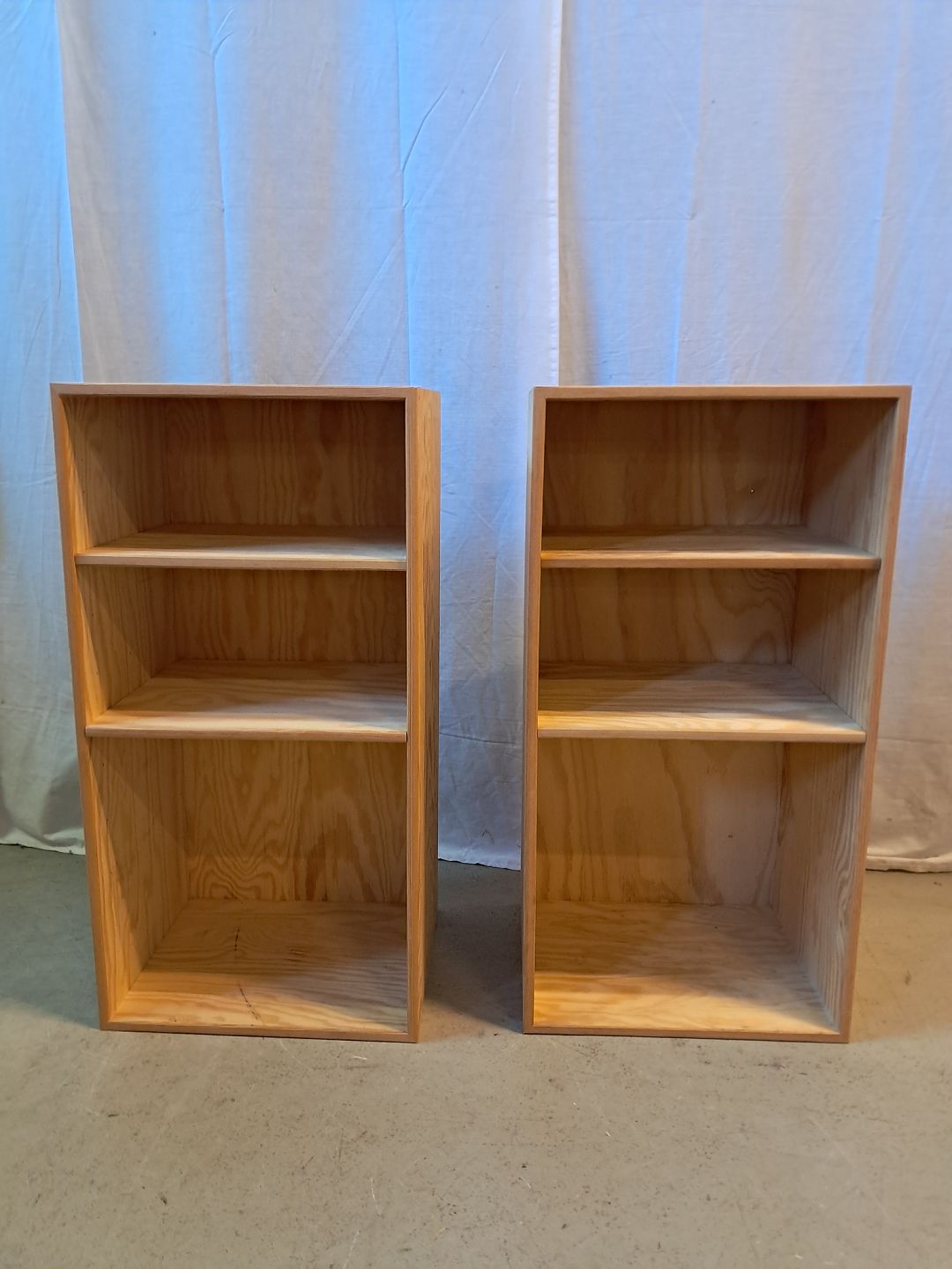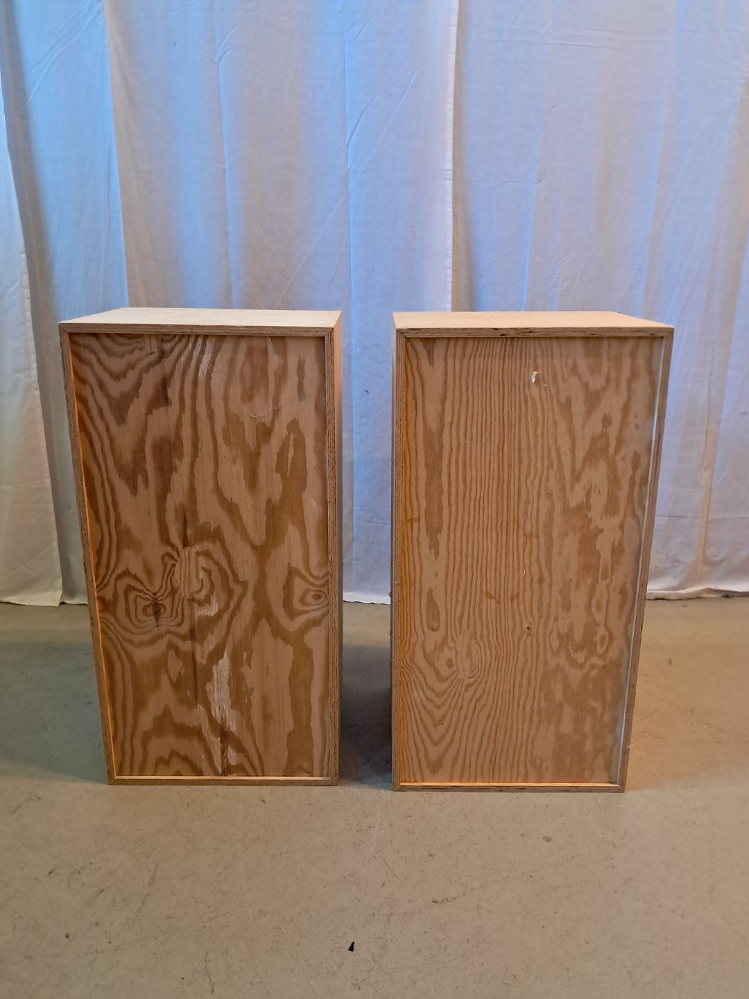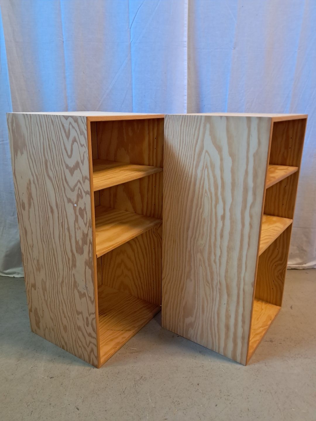 2 Reolkasser i krydsfiner, fra 2000erne.De har brugsspor og der medfølger ikke ophæng.