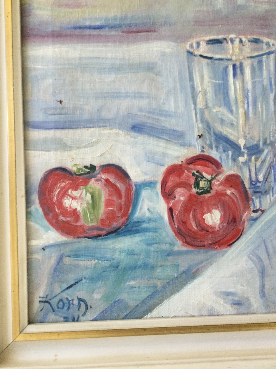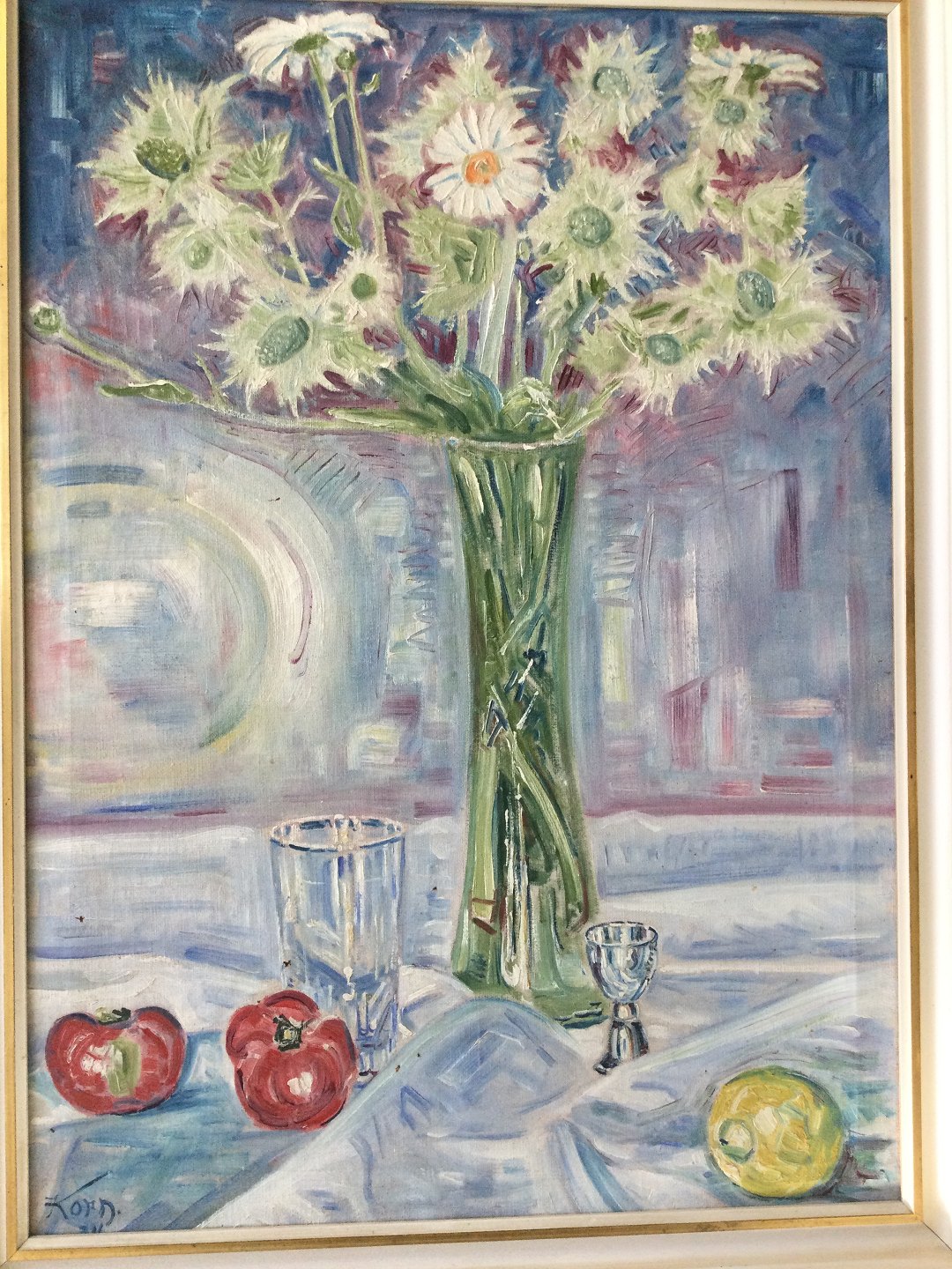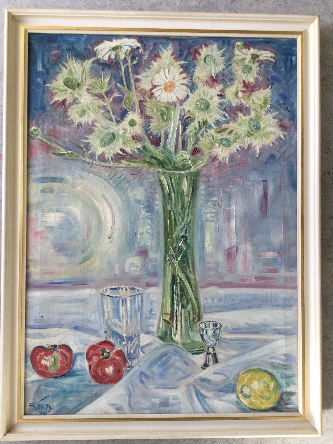 Maleri af H.J. Korn - Opstilling med blomstervase samt frugt 1934,