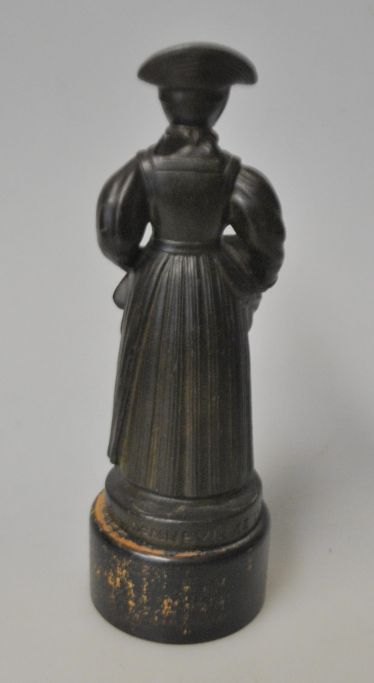 Andersen, Just (1884 - 1943) Dänemark: Dänische Nationaltracht. Frau aus Dannevirke. H.: 13 cm. Gestempelt.Disco-Metall. Montiert auf einem Sockel aus schwarz poliertem Holz.