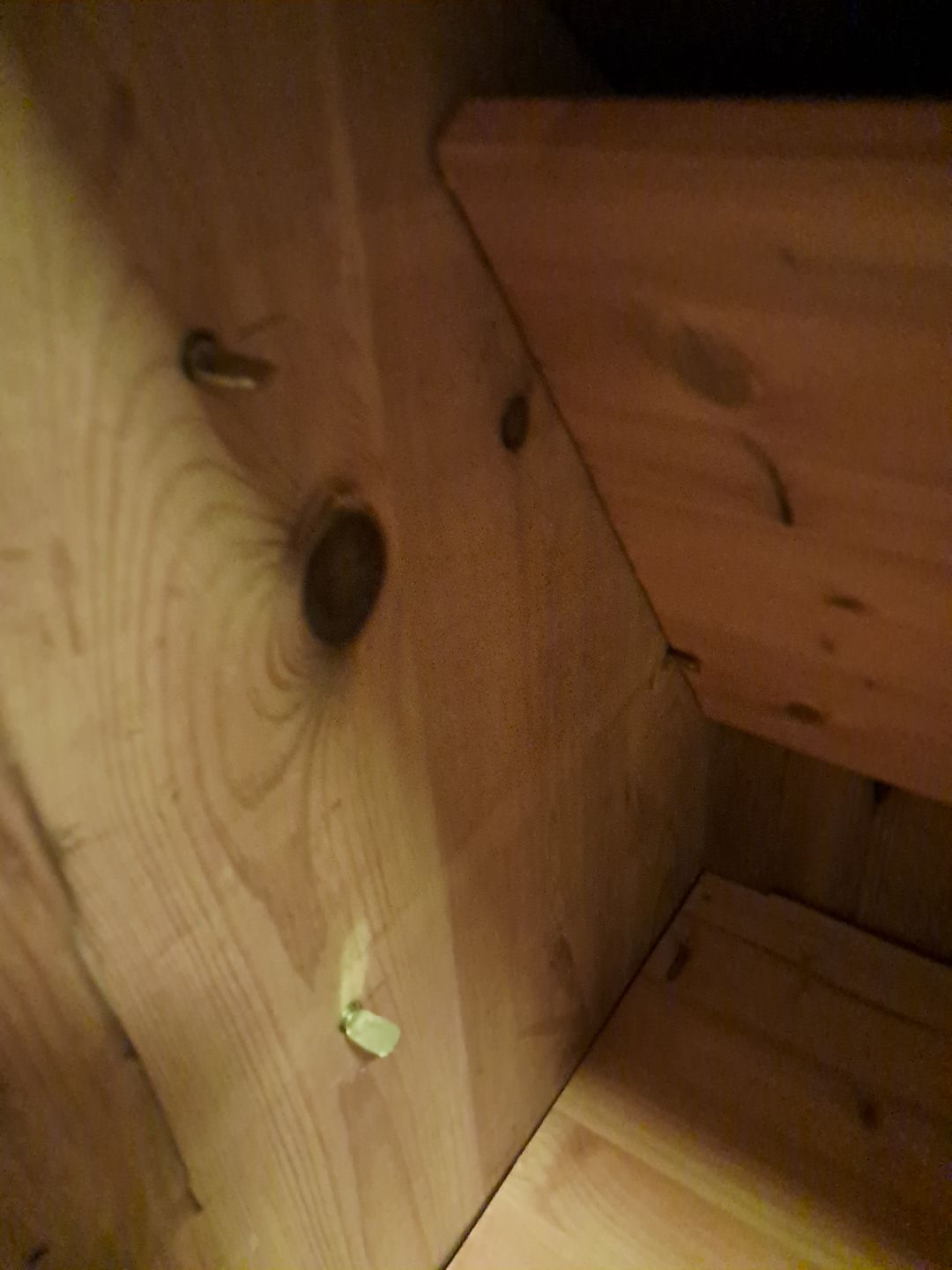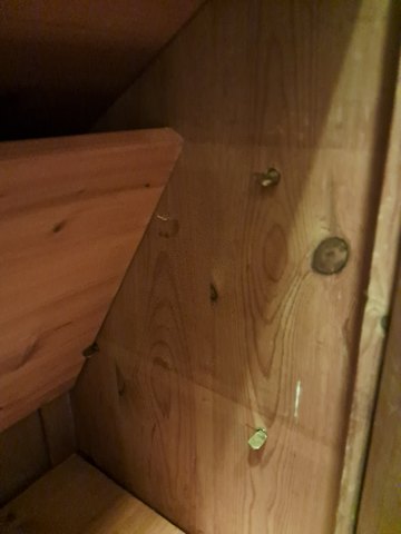 Skab i massivt fyrretræ, fra 1910erne.Det har brugsspor og defekte/mangler lister.