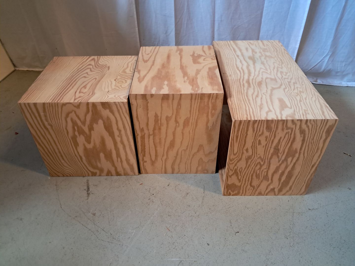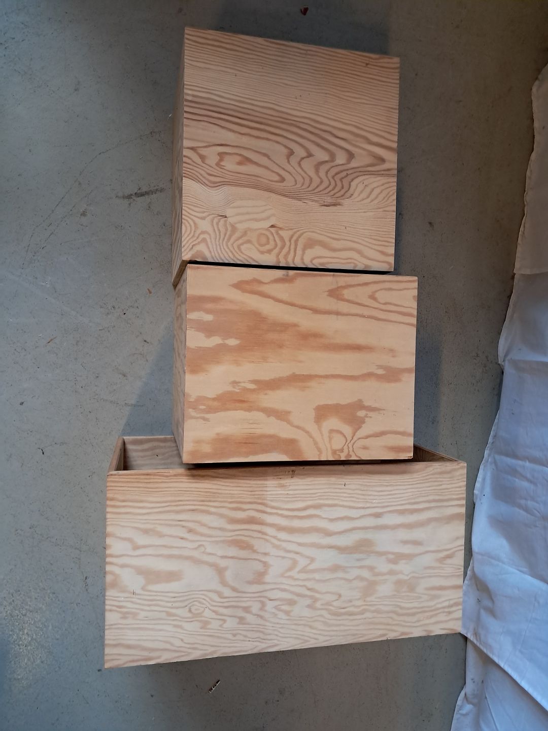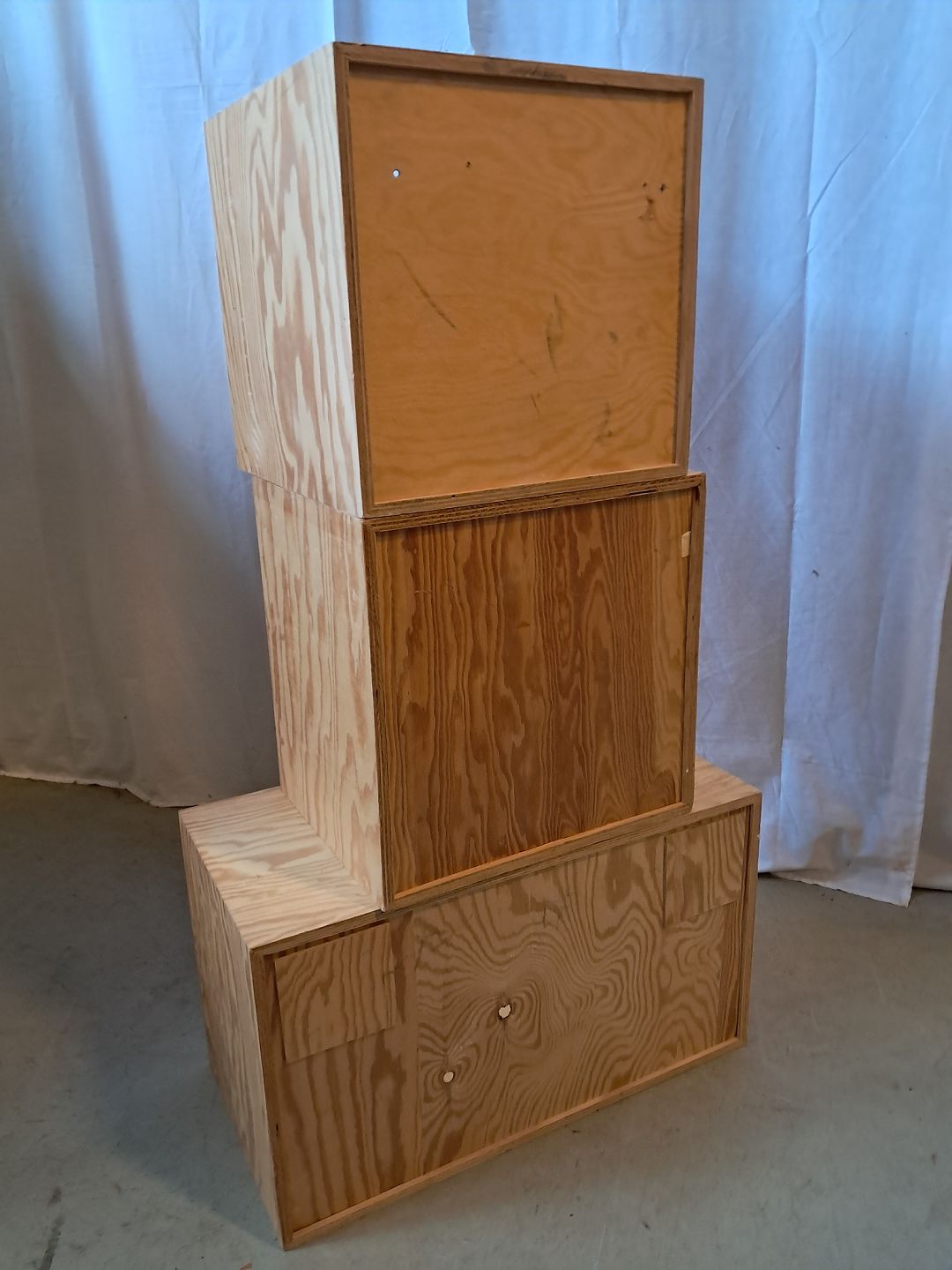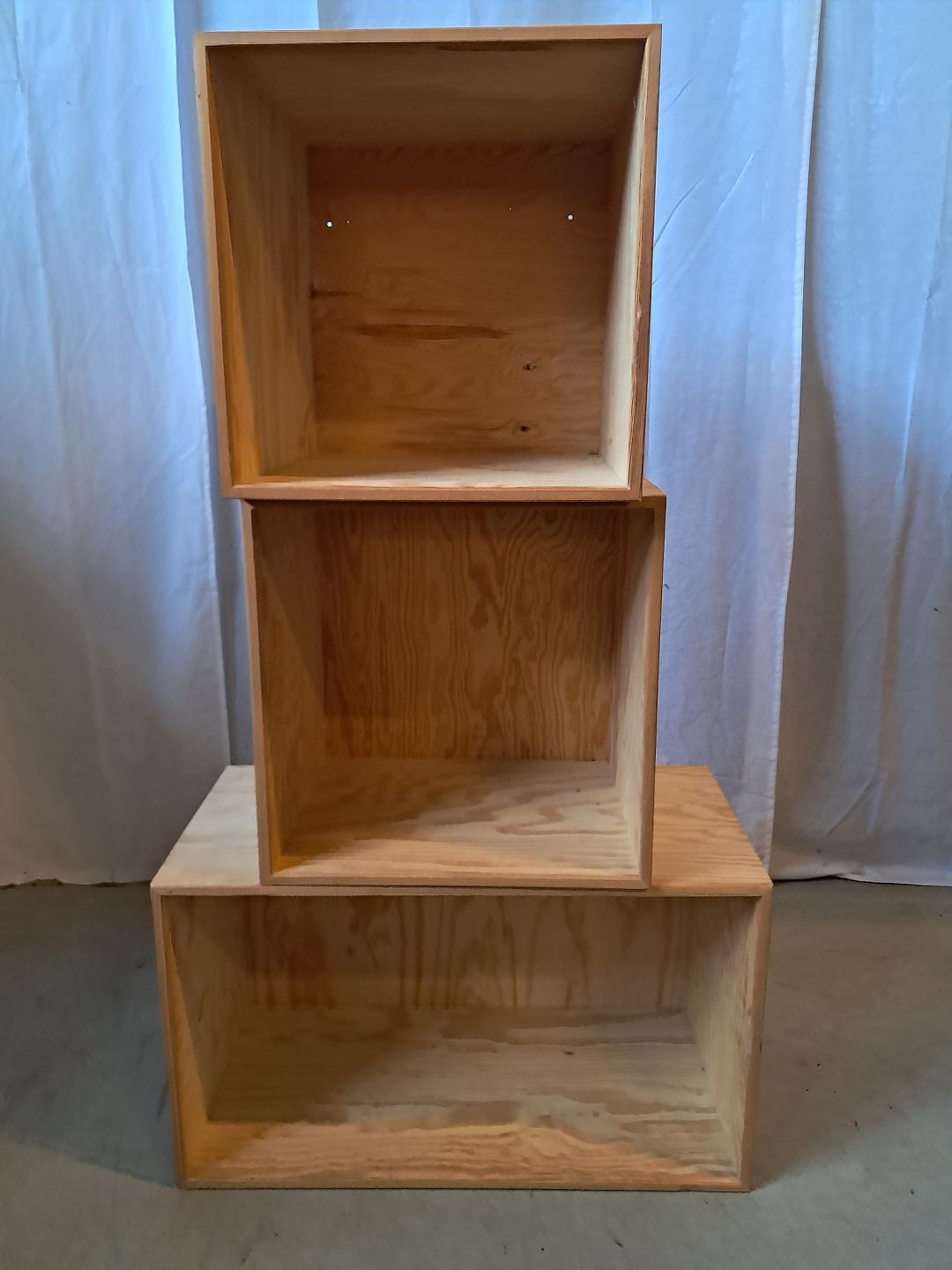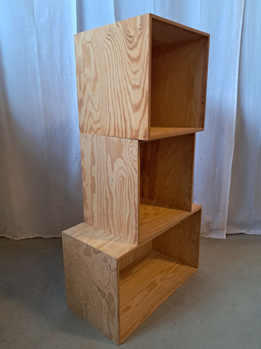 3 Reolkasser i krydsfiner, fra 2000erne.De har brugsspor og der medfølger ikke ophæng.