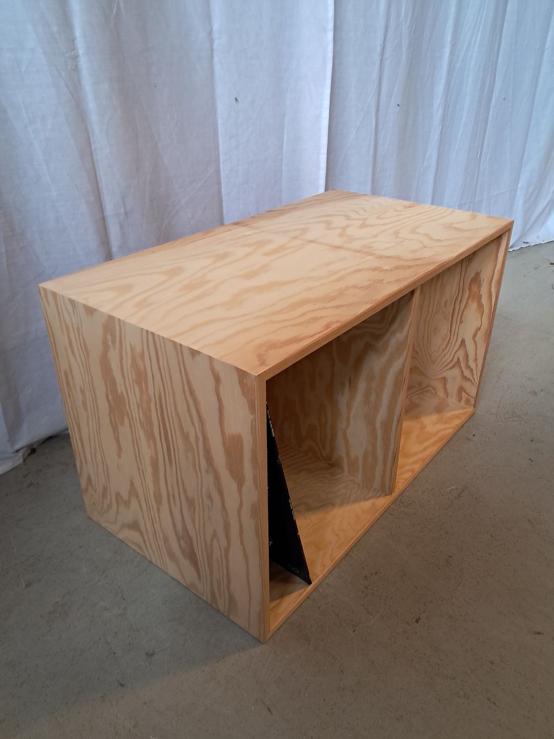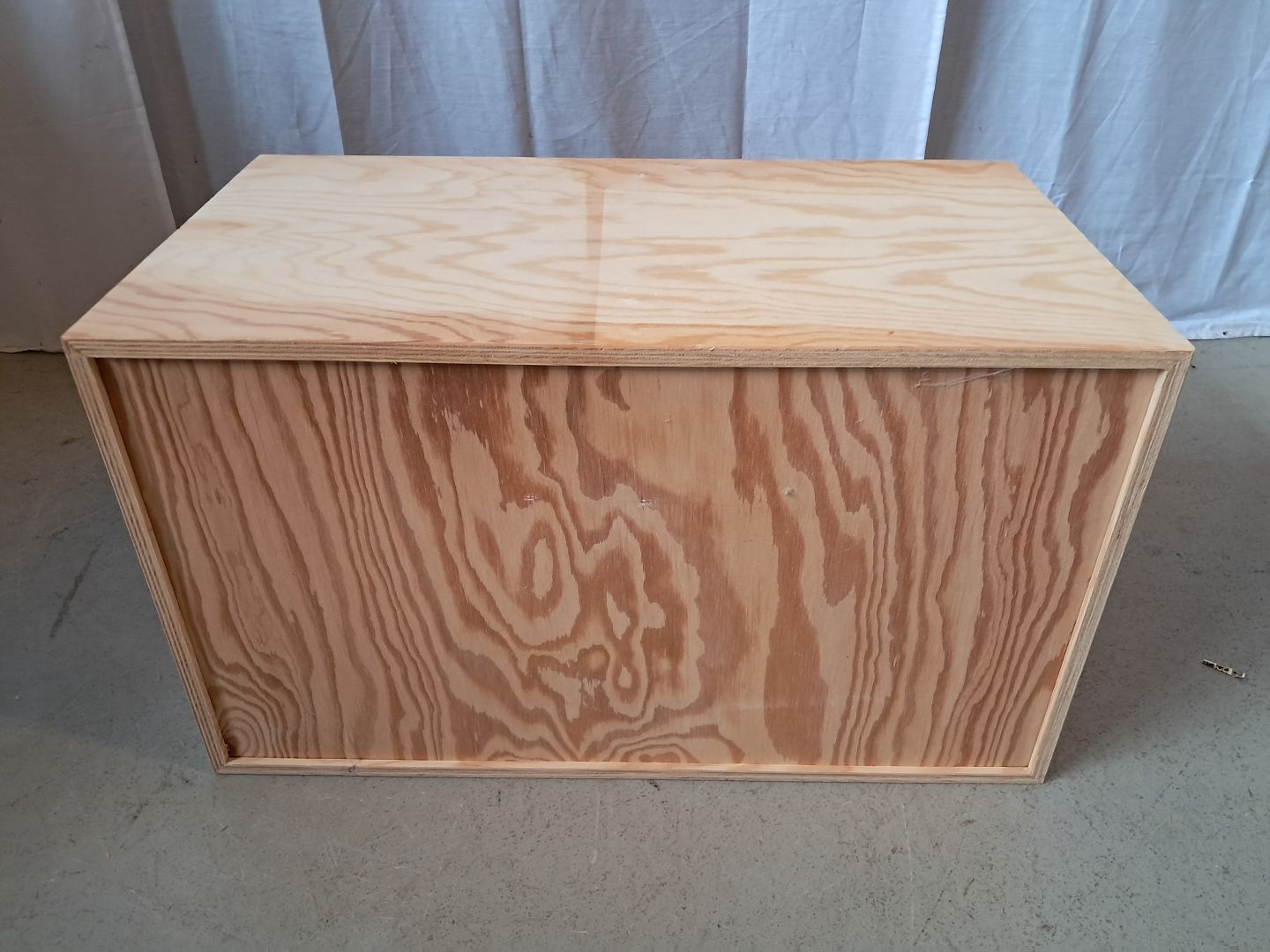 Reolkasse i krydsfiner, fra 2000erne.Den har brugsspor og der medfølger ikke ophæng.