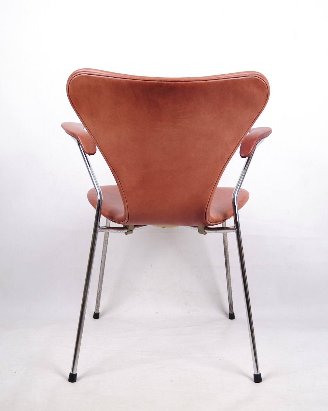 Arne Jacobsen Syverstol med armlæn, model 3207. Cognacfarvet læder og kromstel. Fritz Hansen designklassiker.— Designer: Arne Jacobsen