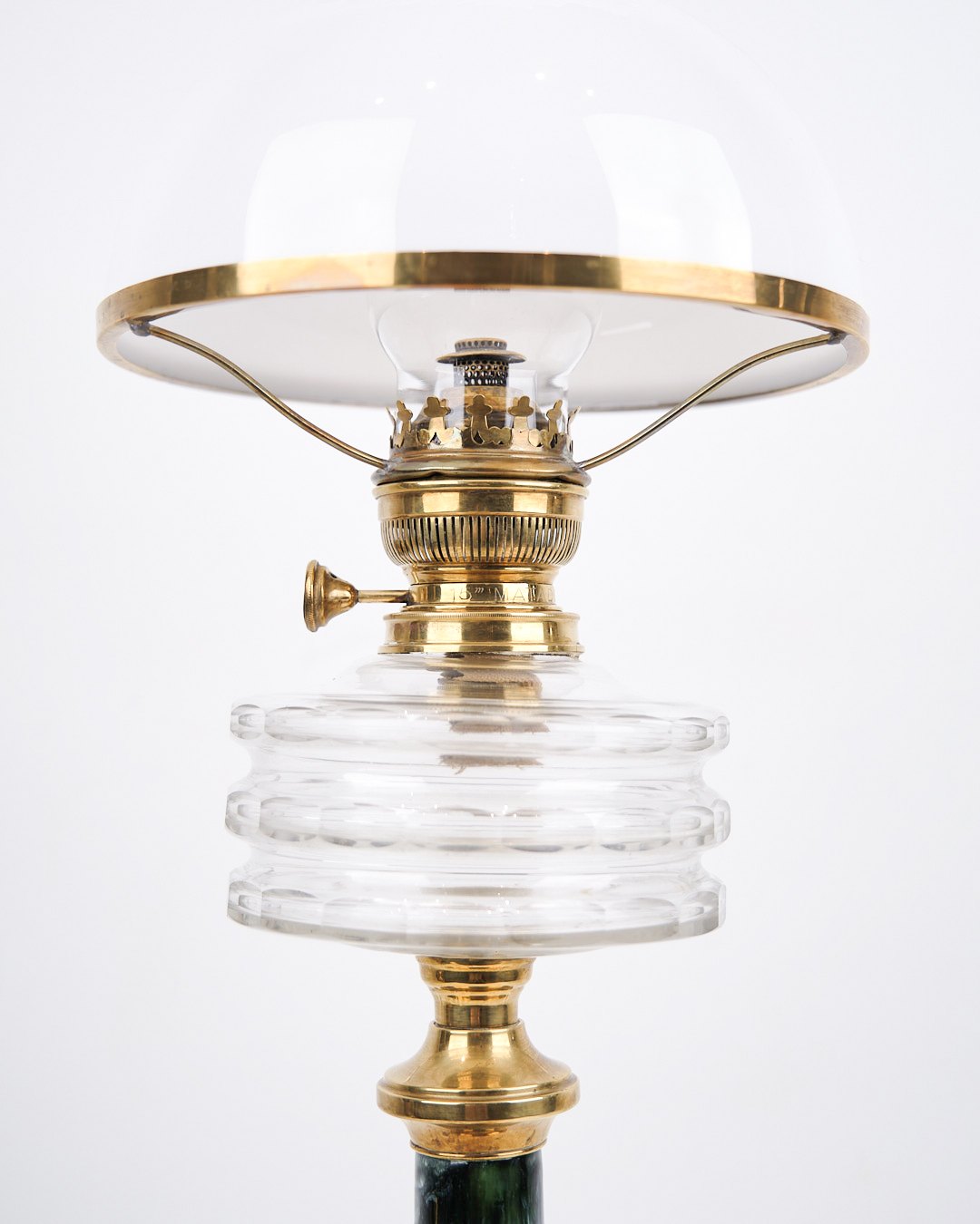 Antik petroleumslampe fra 1880’erne, fremstillet af Fynsk Glasværk. Lampen er udført i messing med marmoreret fod og hvid kuppel i opalglas, som giver et blødt og stemningsfuldt lys.— Producent: Fynsk Glasværk