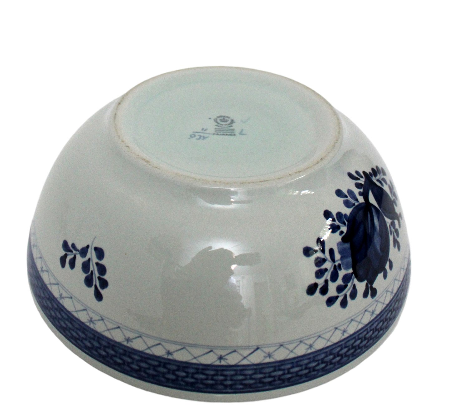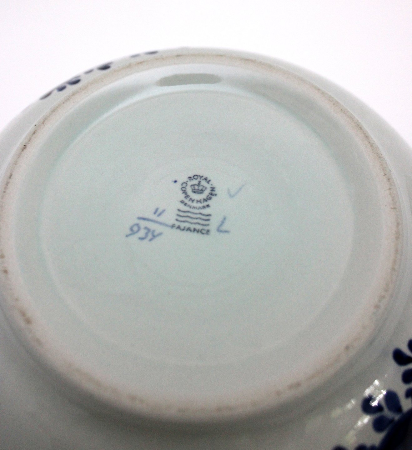 Royal Copenhagen, Tranquebar lyseblå fajance med mørkeblå tulipan og flettet bort designet af Christian Joachim. Håndmalet.Mellemstor salatskål. Nr. 11/934. Højde 8,5 cm. Diameter 21 cm. Flot stand. Pris: 350 kr. stk. Lager: 1