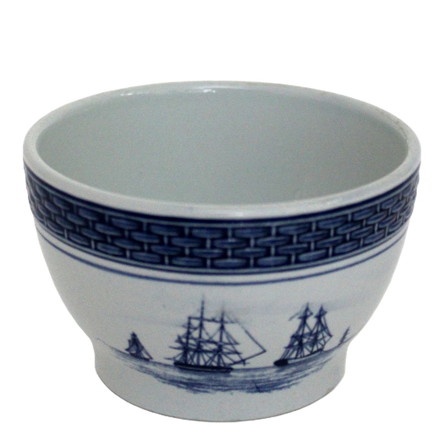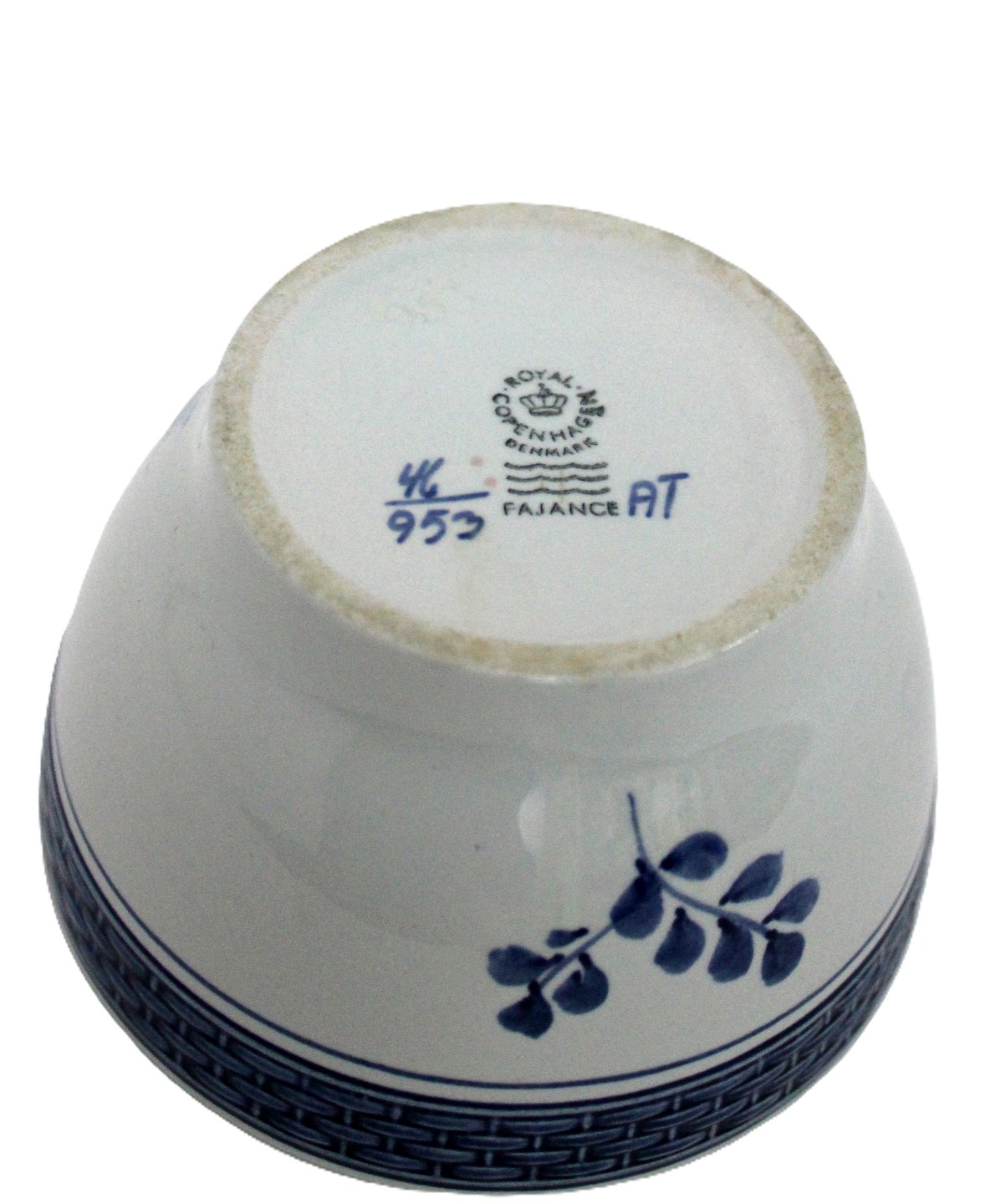 Royal Copenhagen, Tranquebar/Skibsstellet lyseblå fajance med mørkeblå tulipan og flettet bort designet af Christian Joachim. Håndmalet.Lille skål, sukkerskål med skibsmotiver. Nr. 46/953. Højde 6 cm. Diameter 10 cm. Flot stand. II. sortering. Pris: 225 kr. stk. Lager: 1