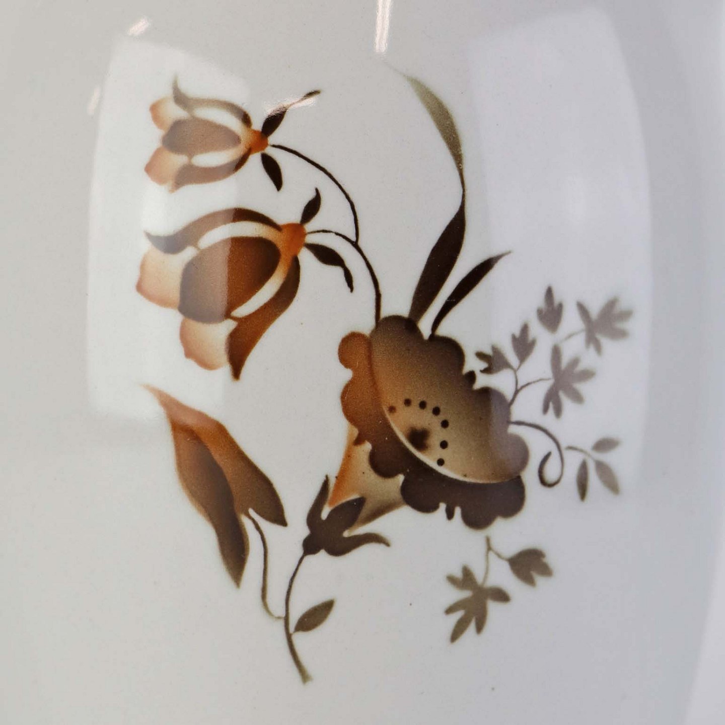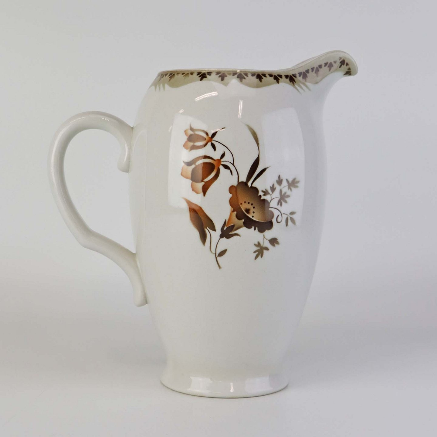 Stel i glat hvid fajance i stelform C med dekoration af brune snerleblomster og lysebrun kant med bladmotiv. Stellet blev produceret i perioden år 1930-1941