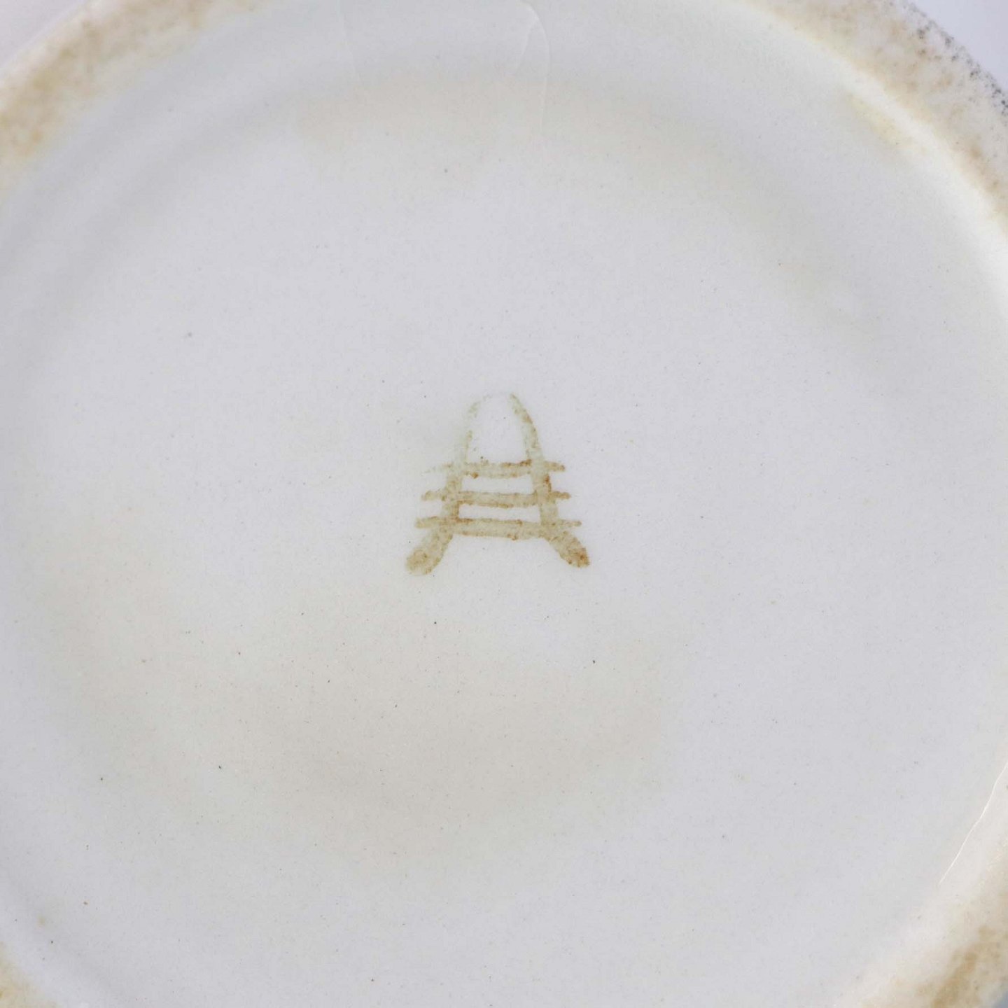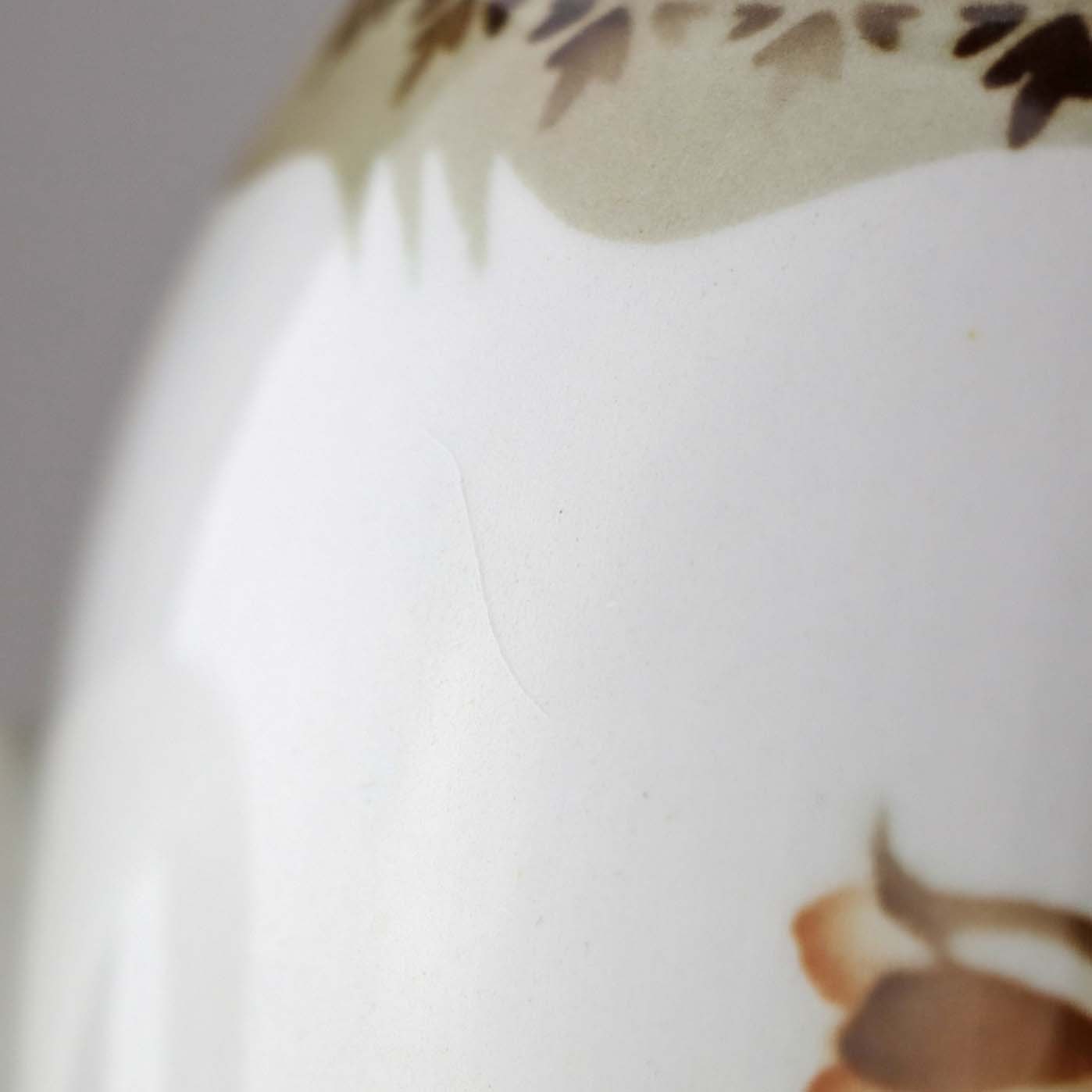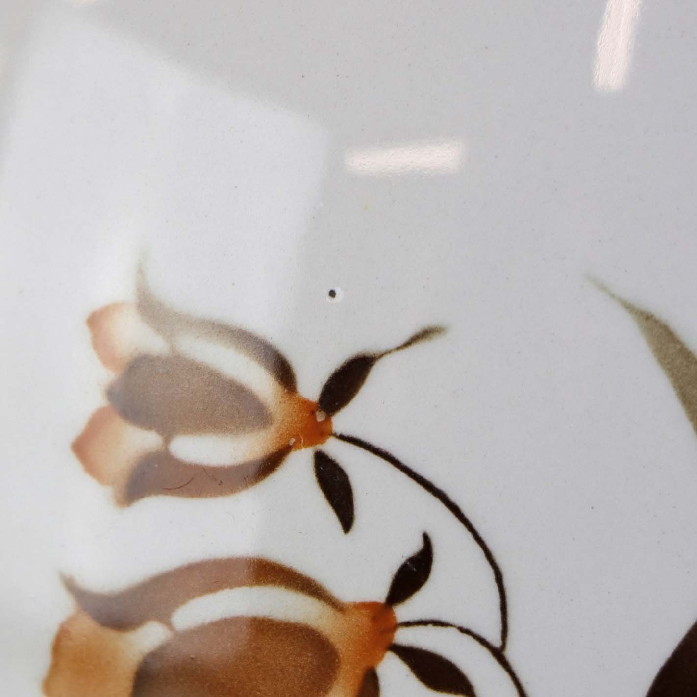 Fremstår med ujævnheder i glasuren, en mindre overfladisk ridse på fronsiden samt brugsspor under bunden og ved tuden.