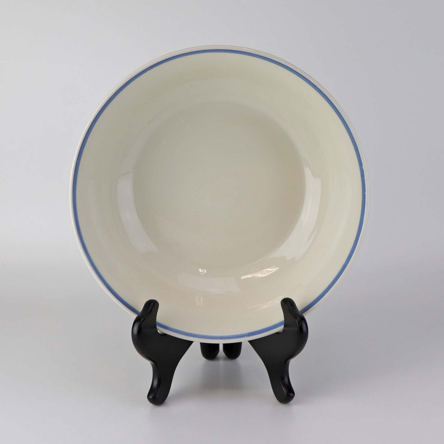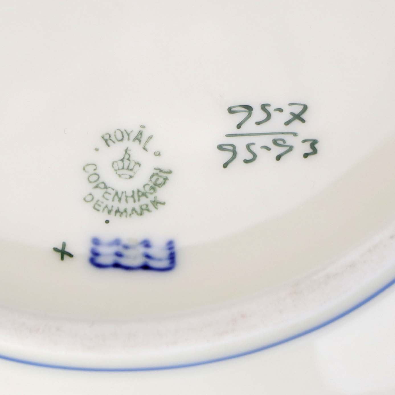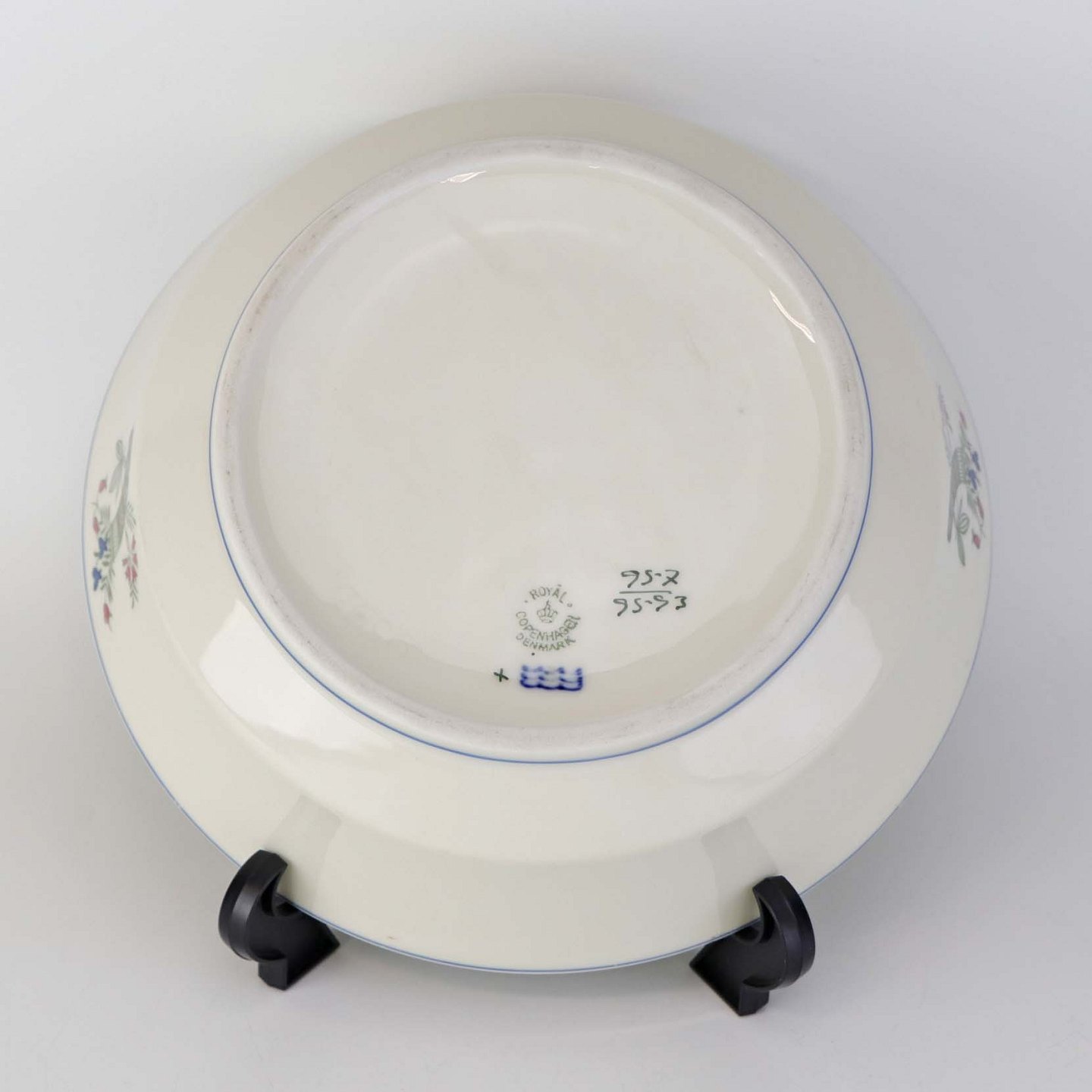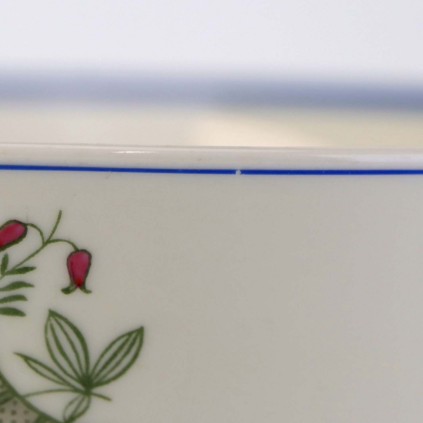 Service i glat lyst porcelæn med blå kantstreg og dekoration med horn samt blå og røde blomster.