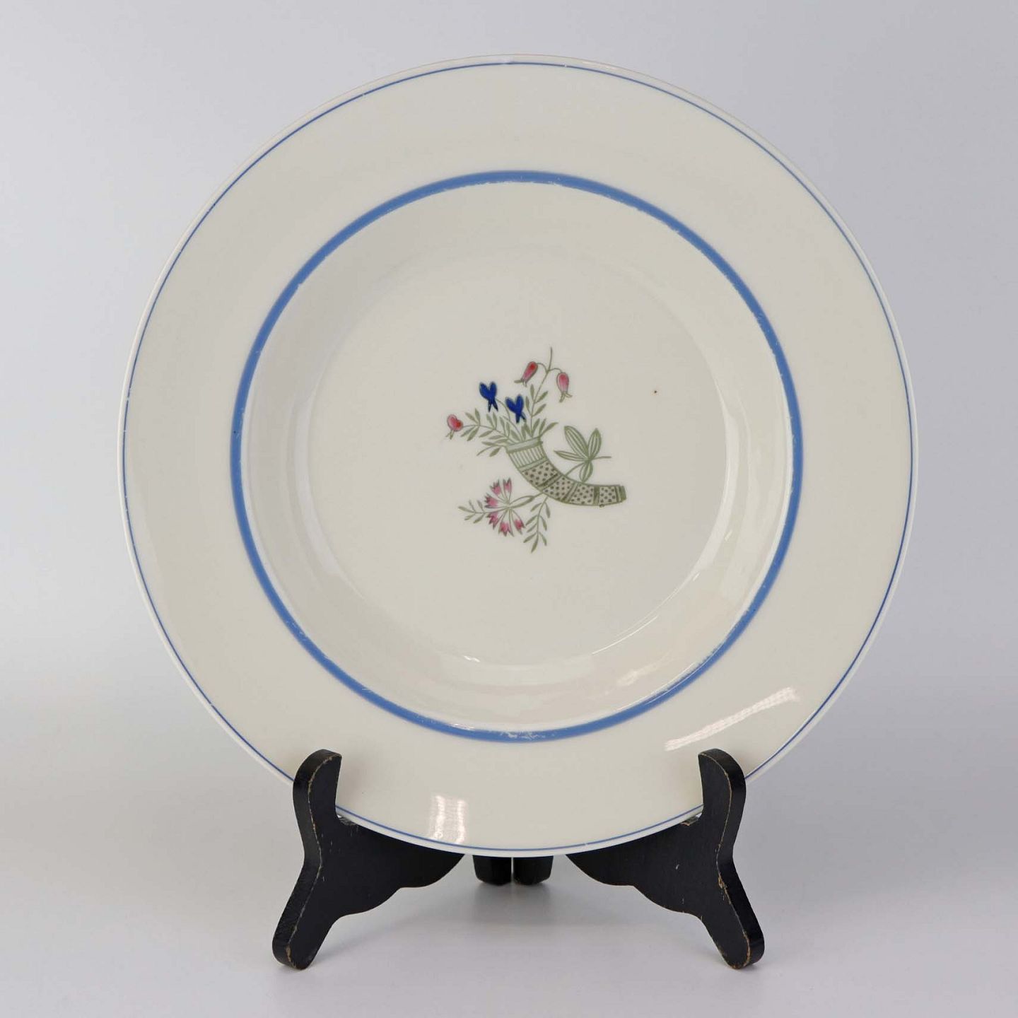 Service i glat lyst porcelæn med blå kantstreg og dekoration med horn samt blå og røde blomster.