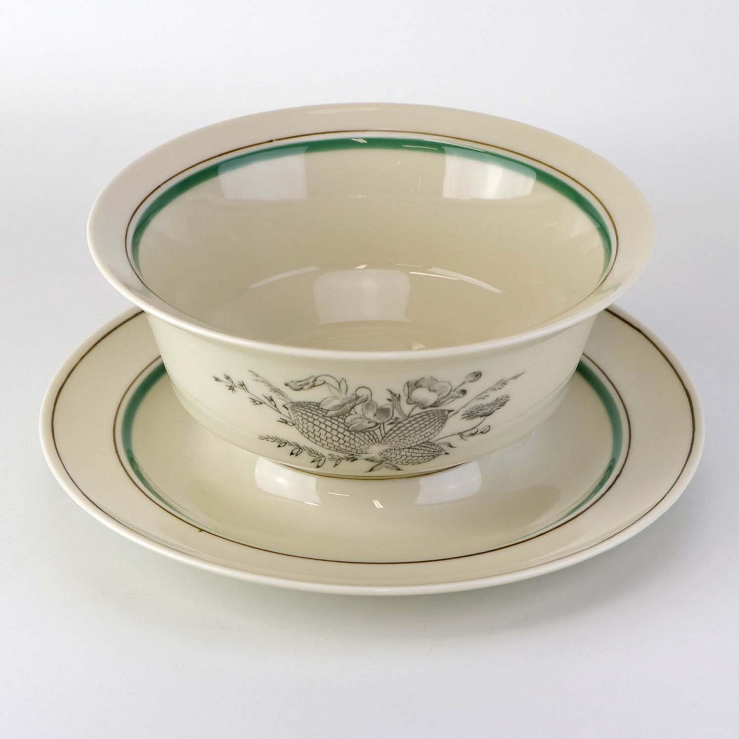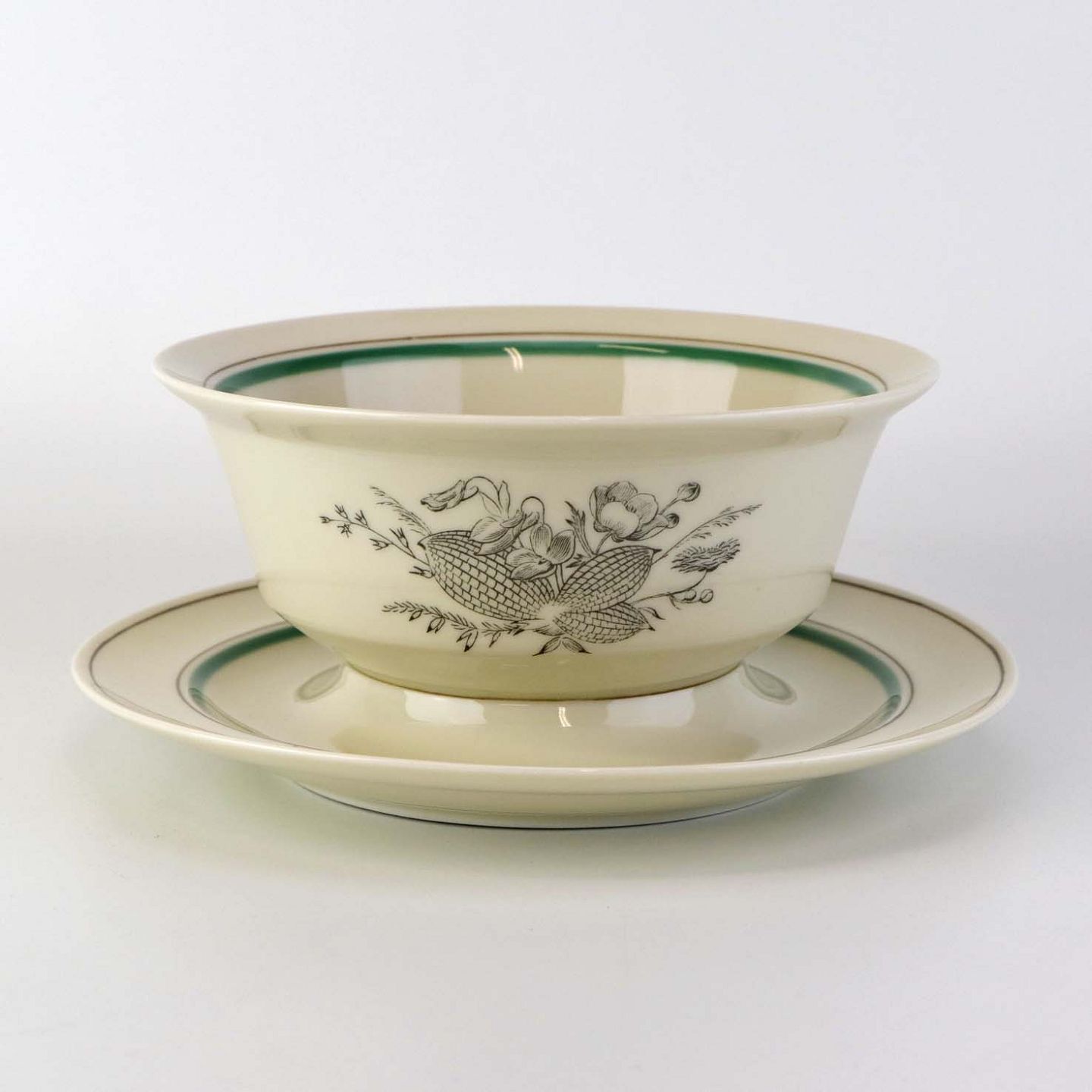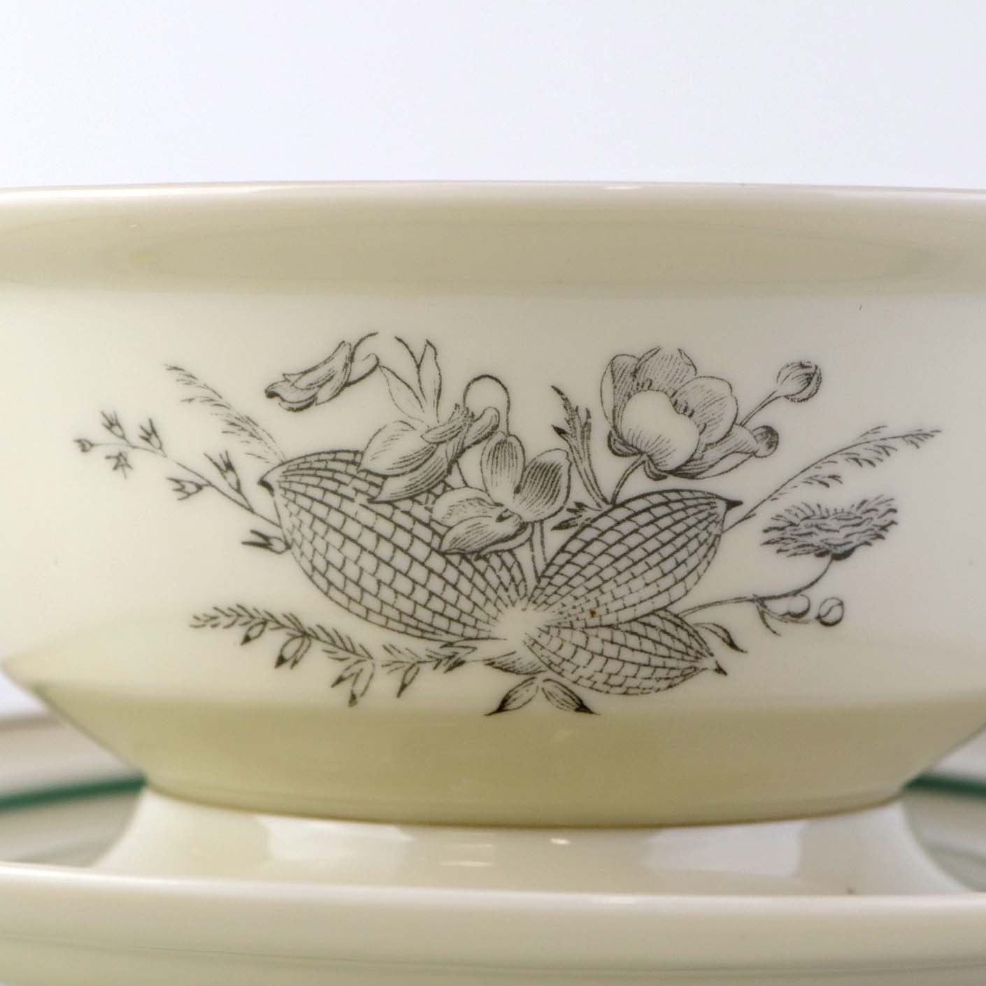 Service i glat cremefarvet porcelæn med grøn og sort kantstreg samt dekoration af blomster og grene i sort streg.