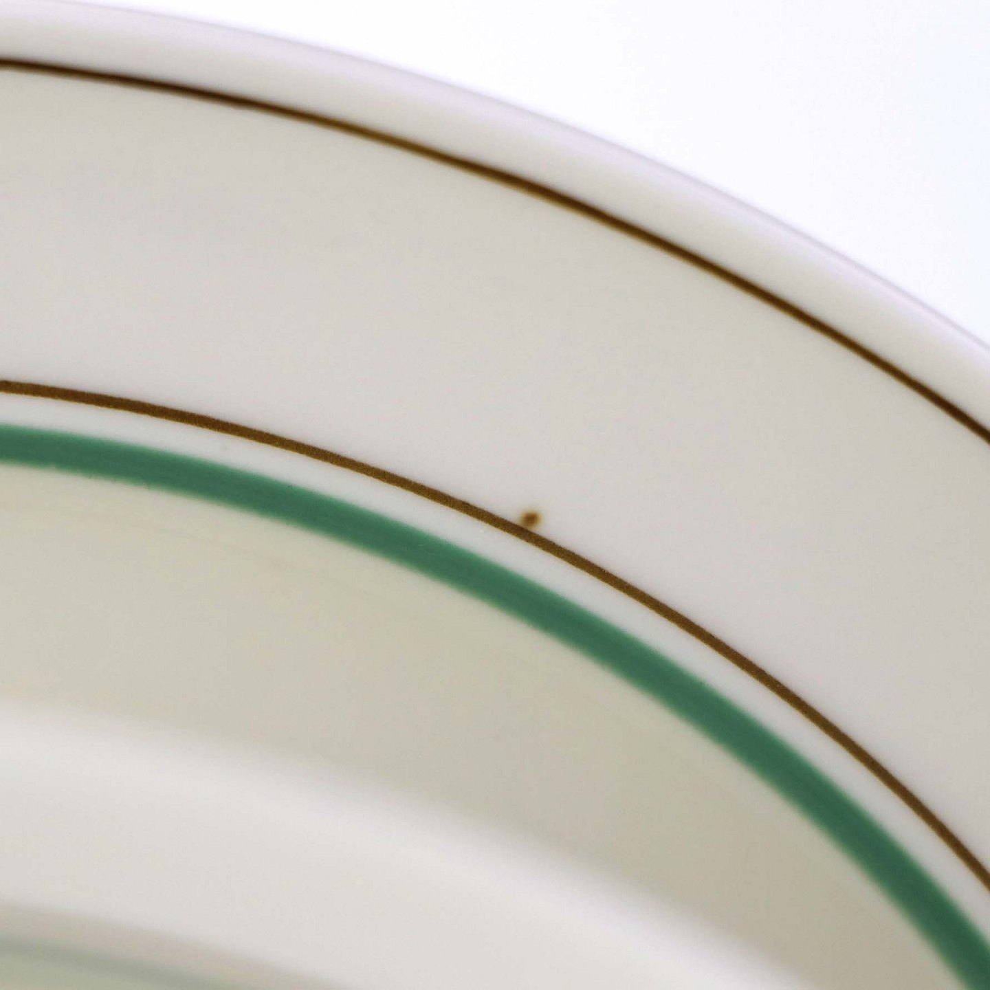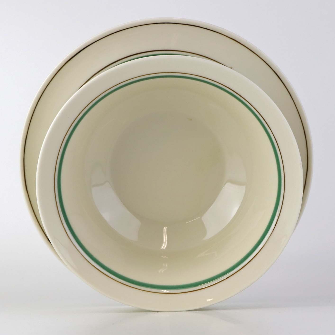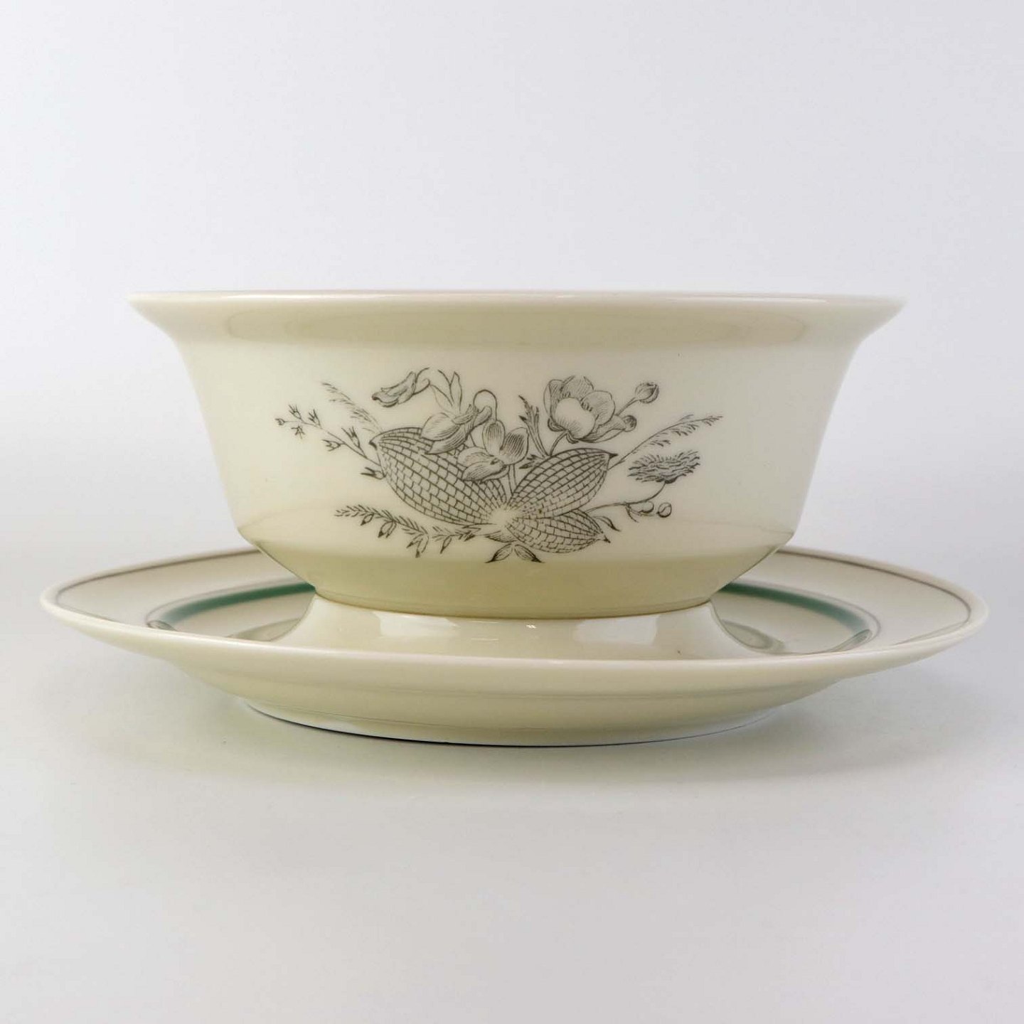 Service i glat cremefarvet porcelæn med grøn og sort kantstreg samt dekoration af blomster og grene i sort streg.