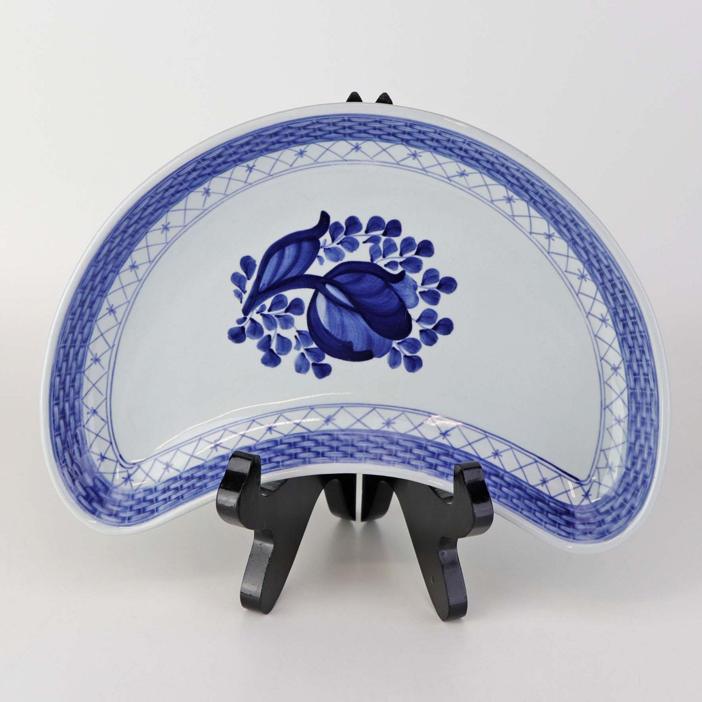 Halvmåneformet kagefad i fajance fra stellet Blå Tranquebar. Nr. 11/1115Formgiver Hans Christian Joachim