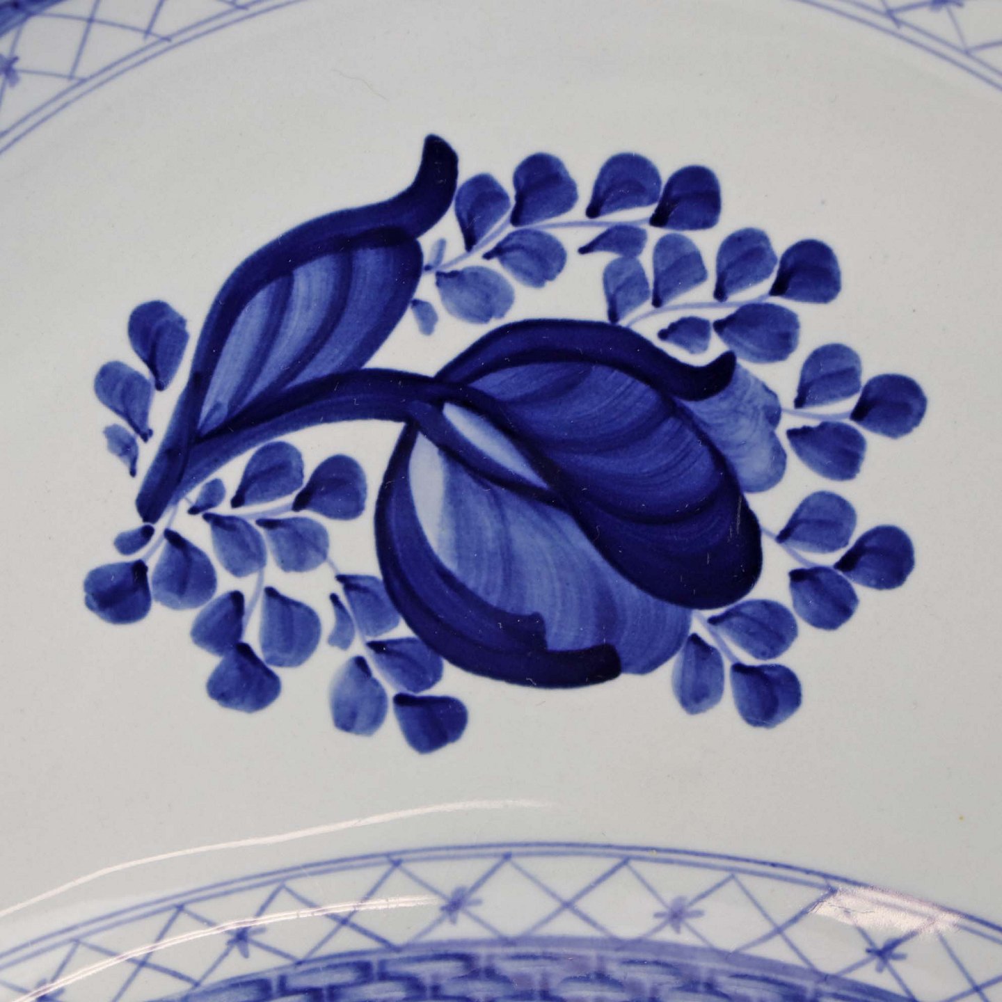 Glat Lyst fajance med blå dekoration af blomster og blå bort.