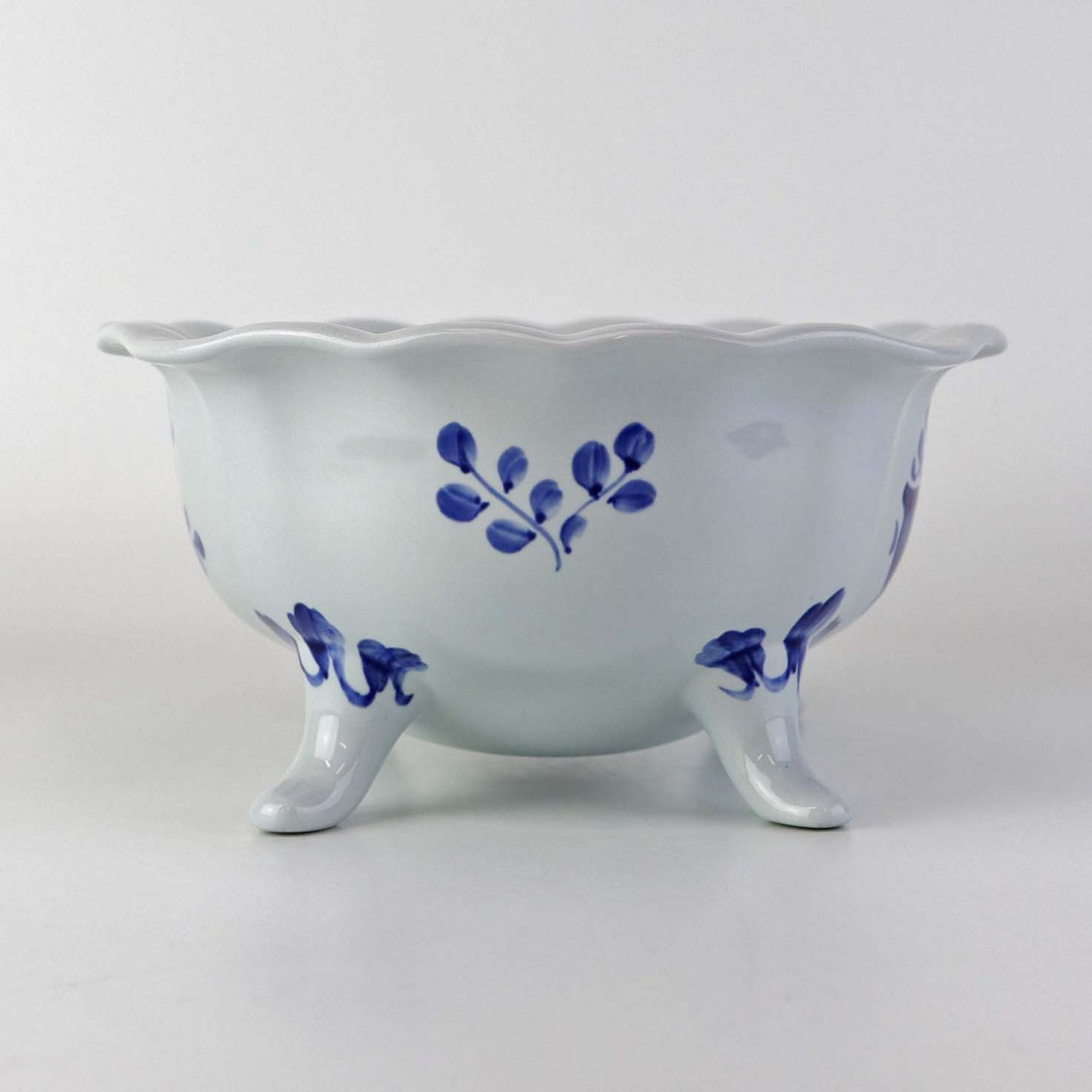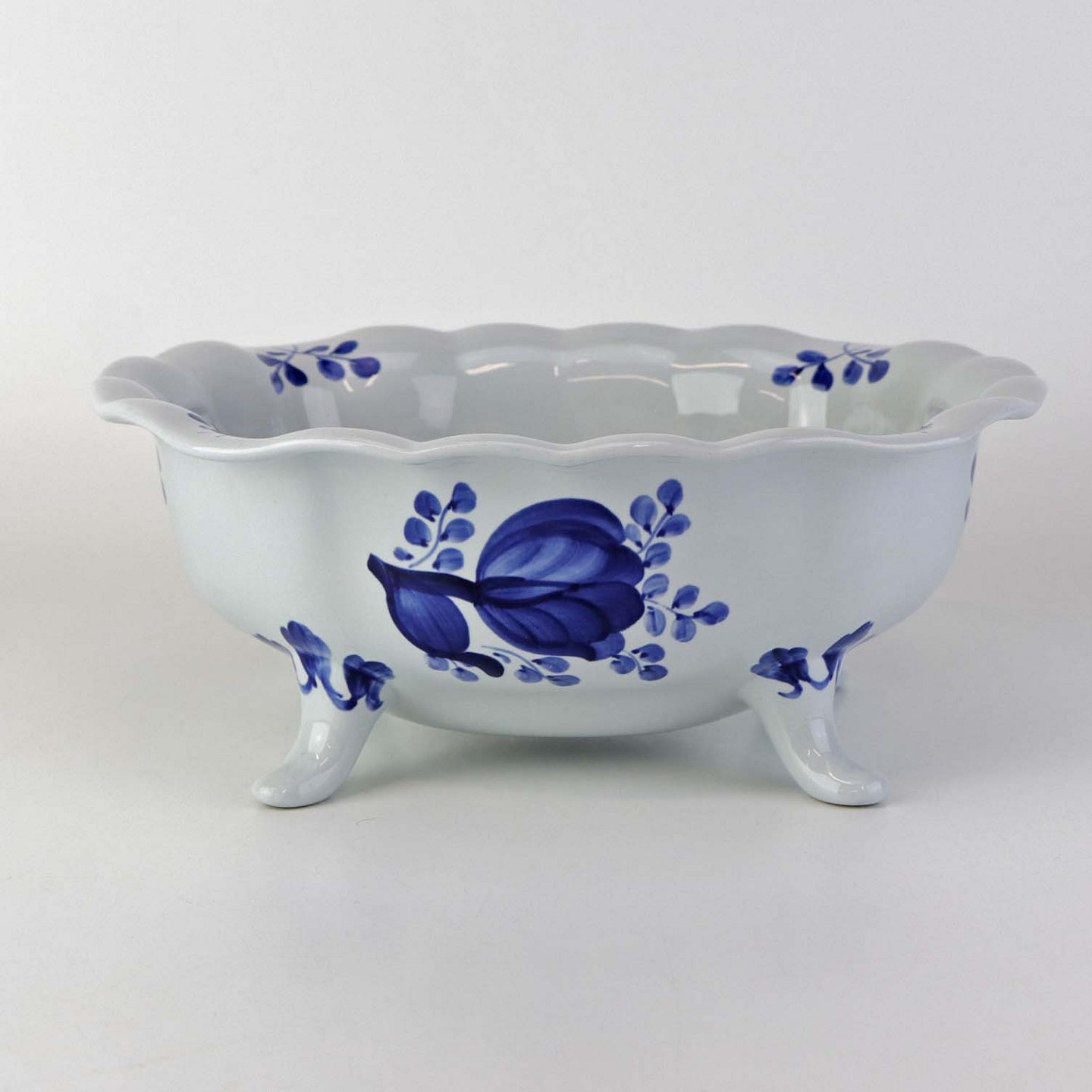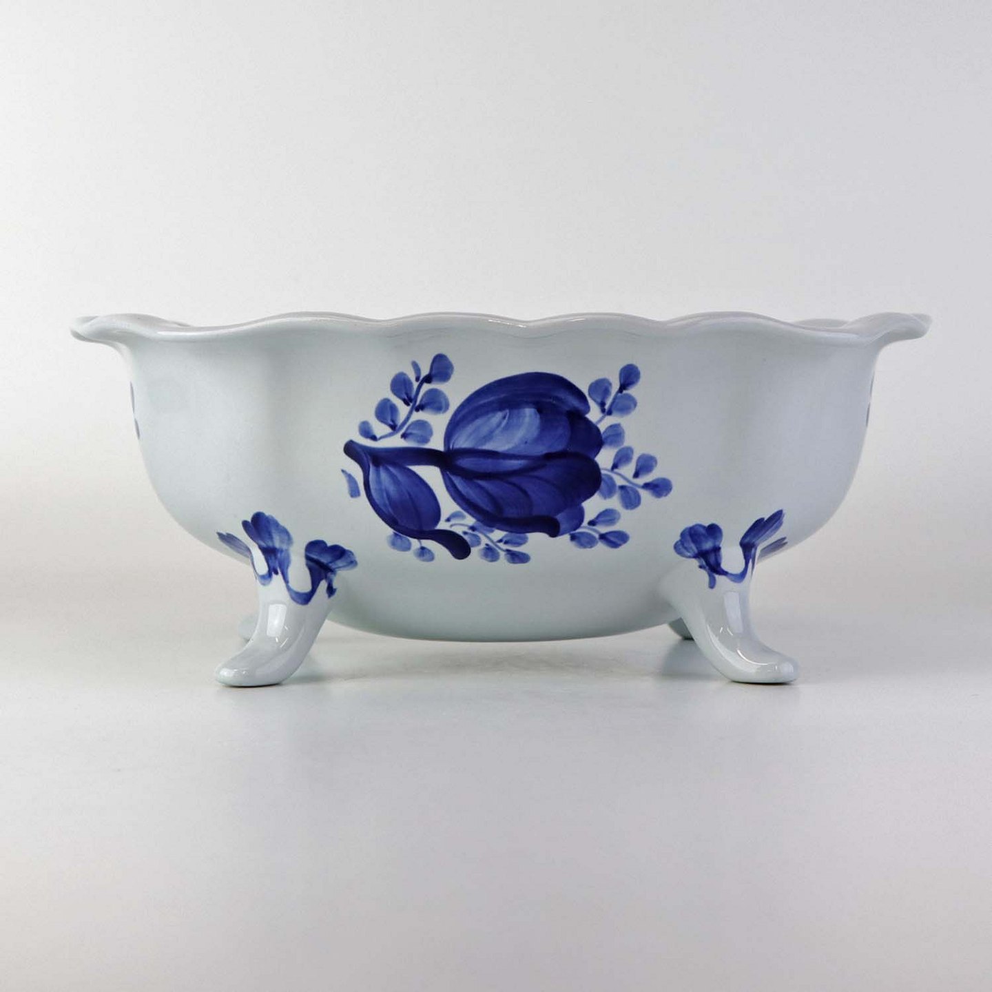 Skål på fire fødder i fajance fra stellet Blå Tranquebar. Nr. 11/1048Formgiver Hans Christian Joachim