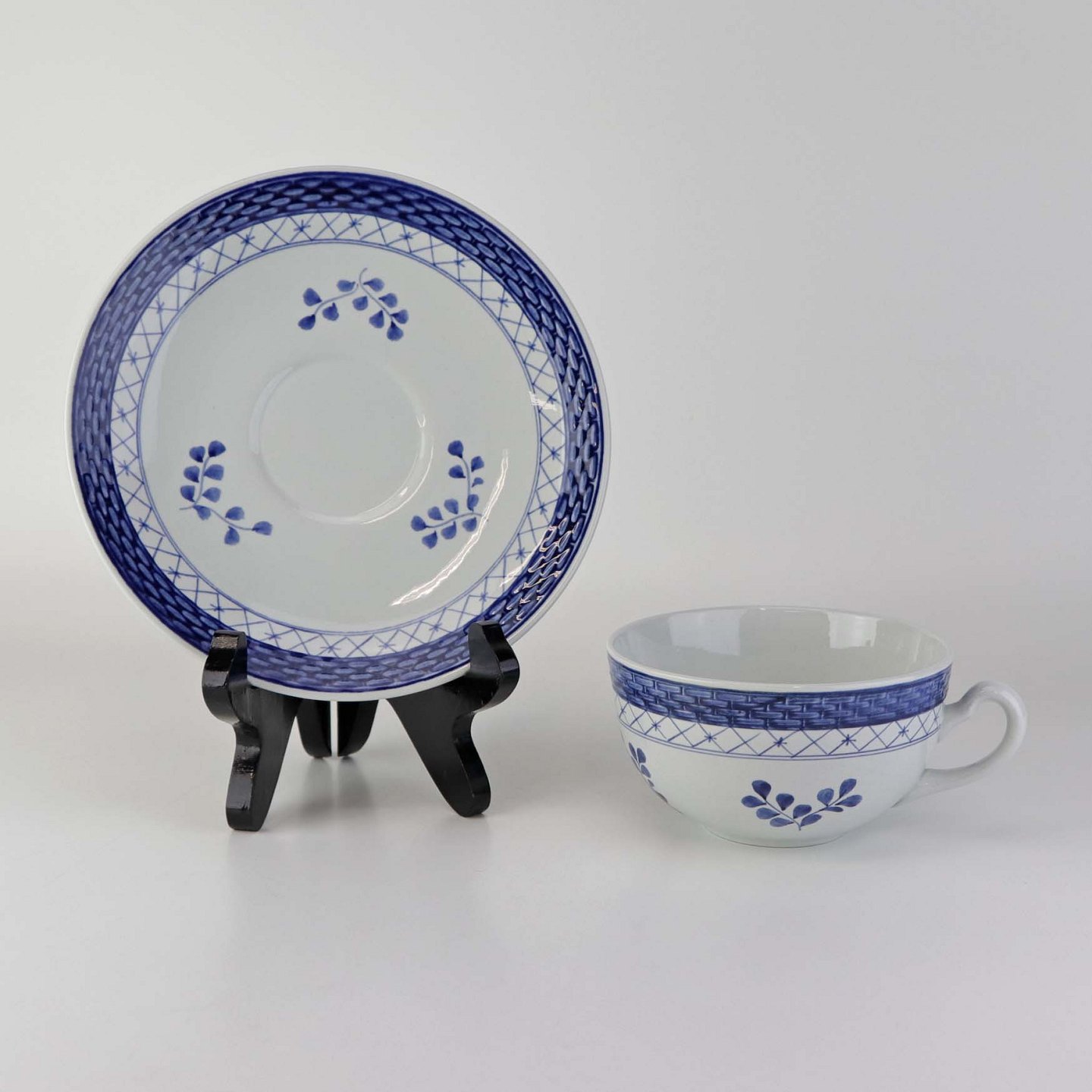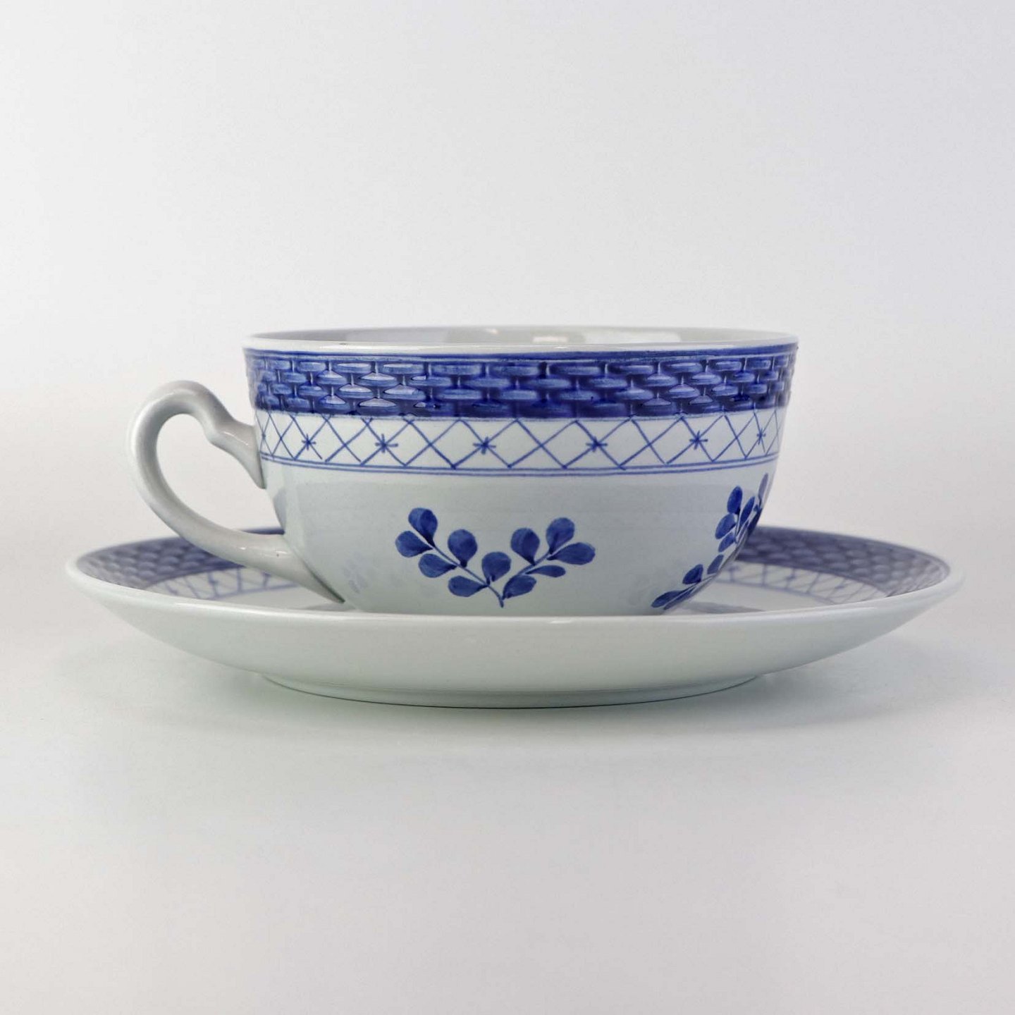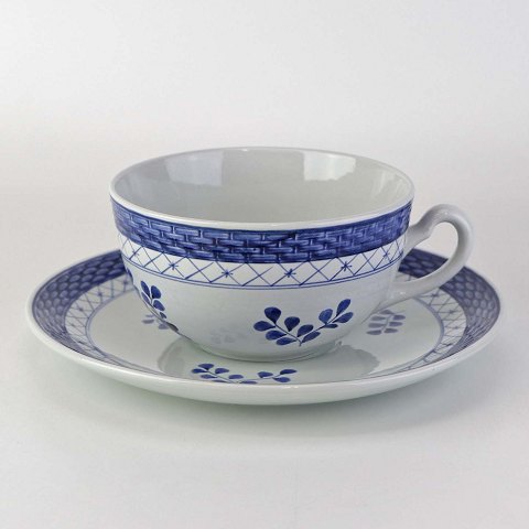 Tekop med underkop i fajance fra stellet Blå Tranquebar. Nr. 11/1115Formgiver Hans Christian Joachim