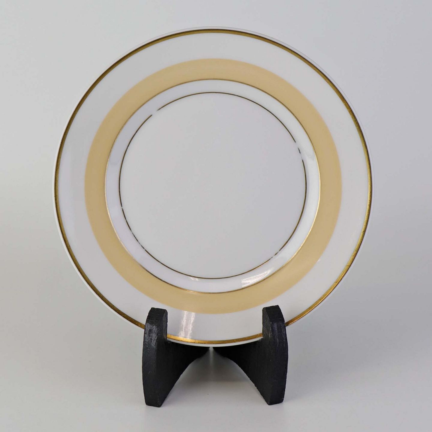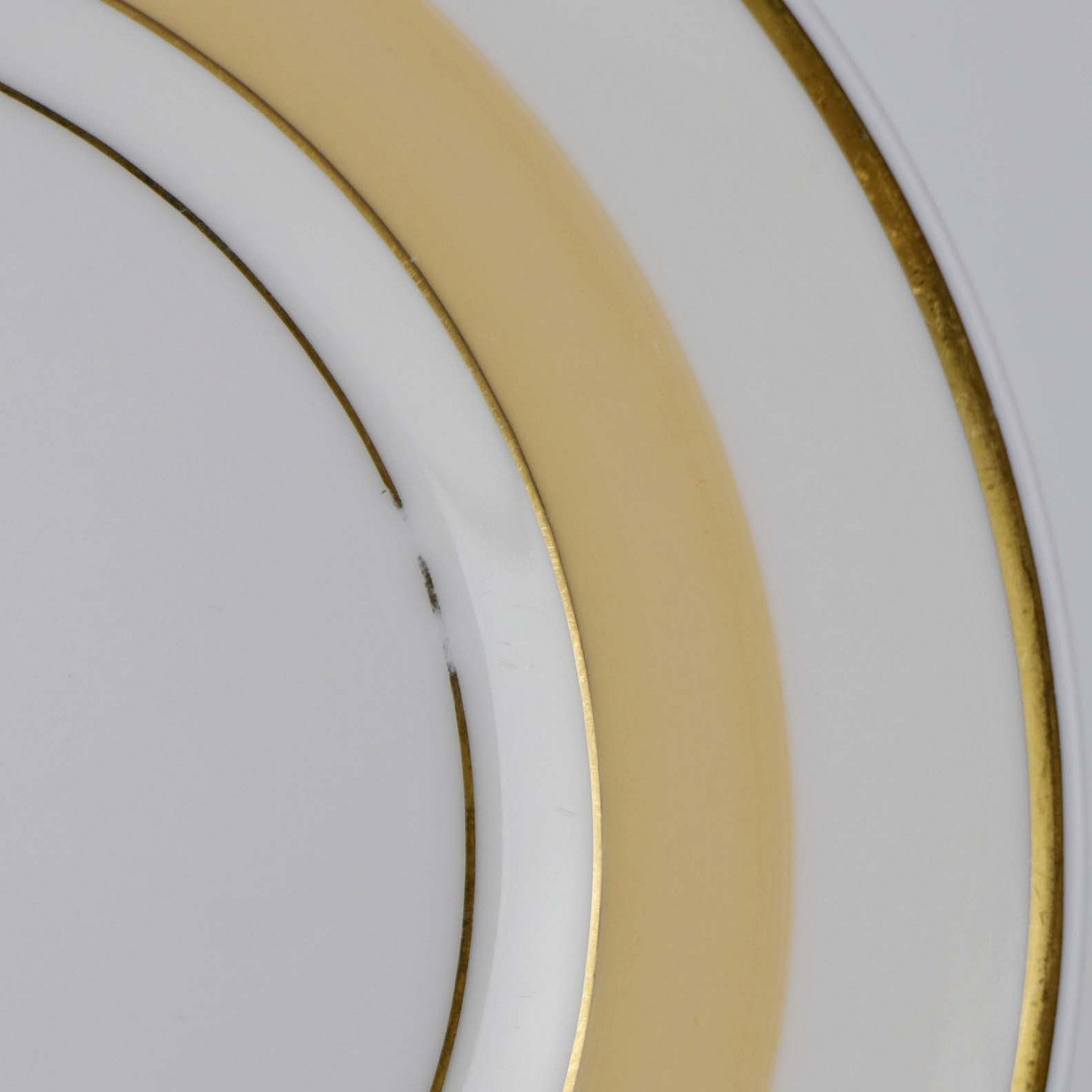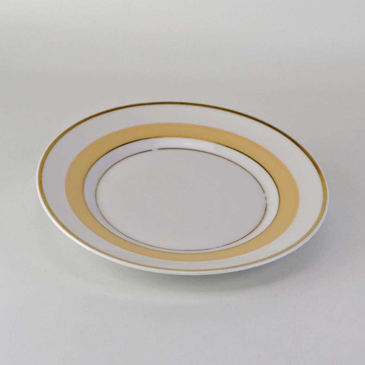 Service i glat hvid porcelæn med sandfarvet dekoration og gylden kant.