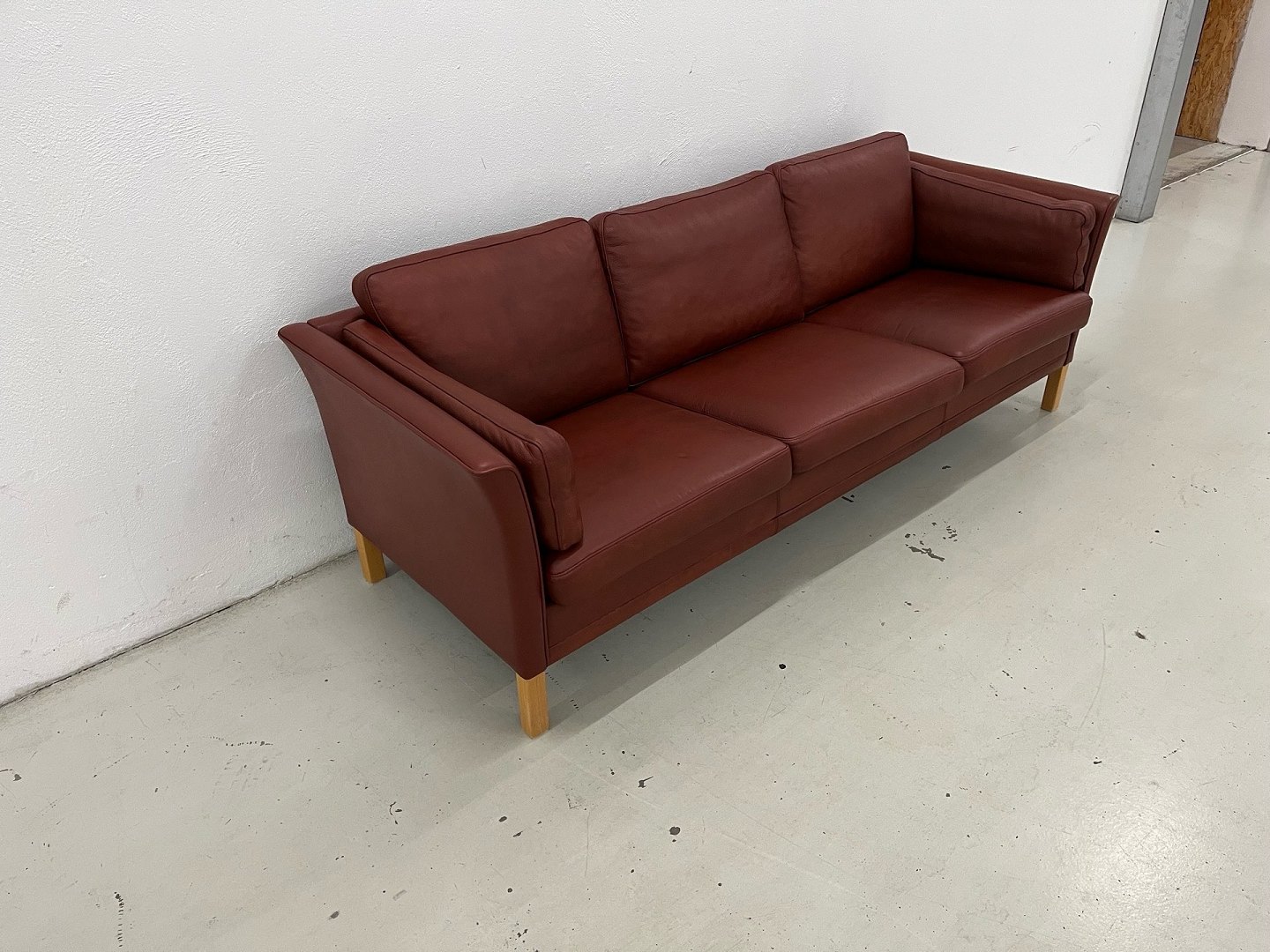 Von einem Architekten entworfenes 3-Sitzer-Sofa Mogens Hansen MH2225 in Gefion-Leder Cognac und Beinen 40-40 in Buche. Neupreis: 42.339,-. Das Sofa hatte 1 Besitzer, wurde kaum benutzt und ist in wirklich tollem Zustand. Das Sofa ist in einem super Zustand und wurde wenig benutzt. MH 2225, 1971 auf den Markt gebracht, ist noch immer eines der beliebtesten Londoner Sofas von Mogens Hansen. Die leicht geschwungene Armlehne, die einfachen und klaren Linien und die relativ geringe Sitztiefe bieten einen einzigartigen Sitzkomfort, wodurch das Modell auch heute noch seine offensichtliche Berechtigung im Sortiment von Mogens Hansen hat. Schönes und klassisches Sofa von Mogens Hansen. Ausgestattet mit Daunen-Sitzeinsätzen und Rückenkissen mit Polydaunen, die genau den richtigen Komfort und die richtige Optik bieten. Hier können Sie den ganzen Morgen bequem sitzen und bei einer guten Tasse Kaffee lesen. Der Look ist, wie immer bei Mogens Hansen, stilvoll, einfach und minimalistisch mit einer Eleganz, die in die meiste Händler