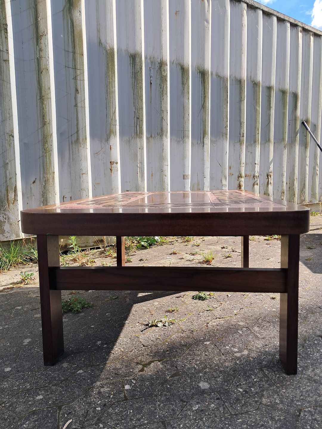Kakkel sofabord i fineret palisander, fra 1970erne.Det har brugsspor.