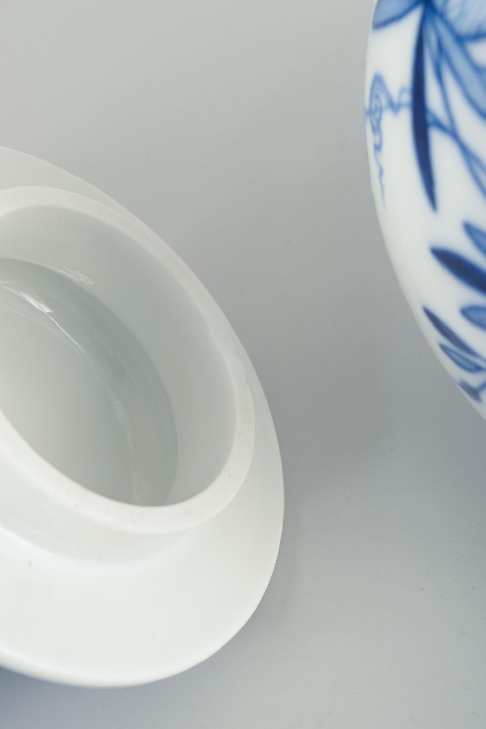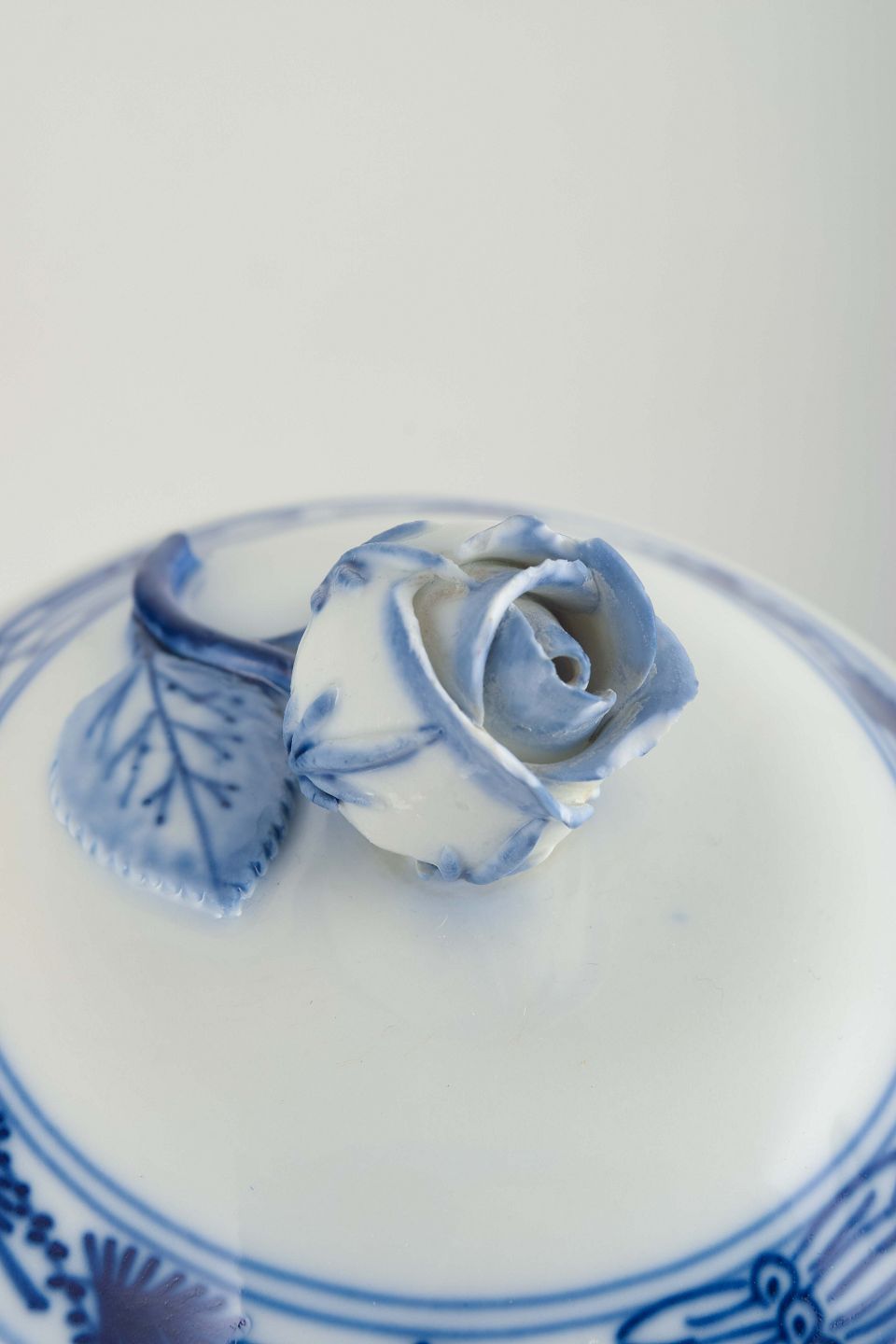 Meissen løgmønstret kaffekande, tidligt 1900-talOrganisk formet lågkande i hvidt porcelæn med underglasur-blå dekoration i det klassiske “Zwiebelmuster”-mønster. Låget er prydet med en naturalistisk modelleret porcelænsrose i blå og hvid.