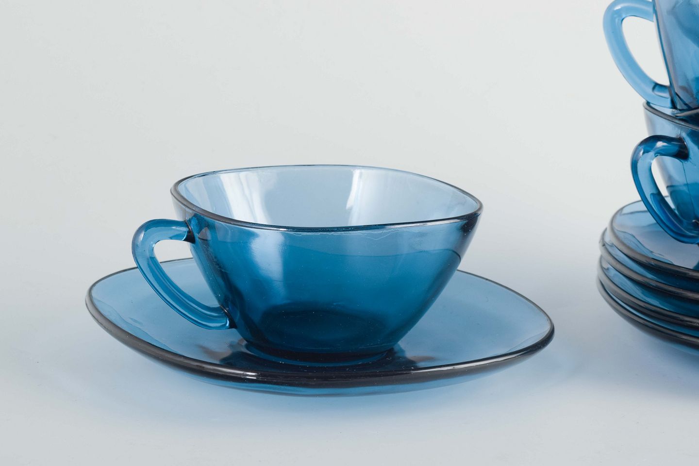Vereco, 5 kaffekopper med underkopper, 1970/80’erne.Sæt med fem blå kaffekopper i presset glas med tilhørende underkopper.
