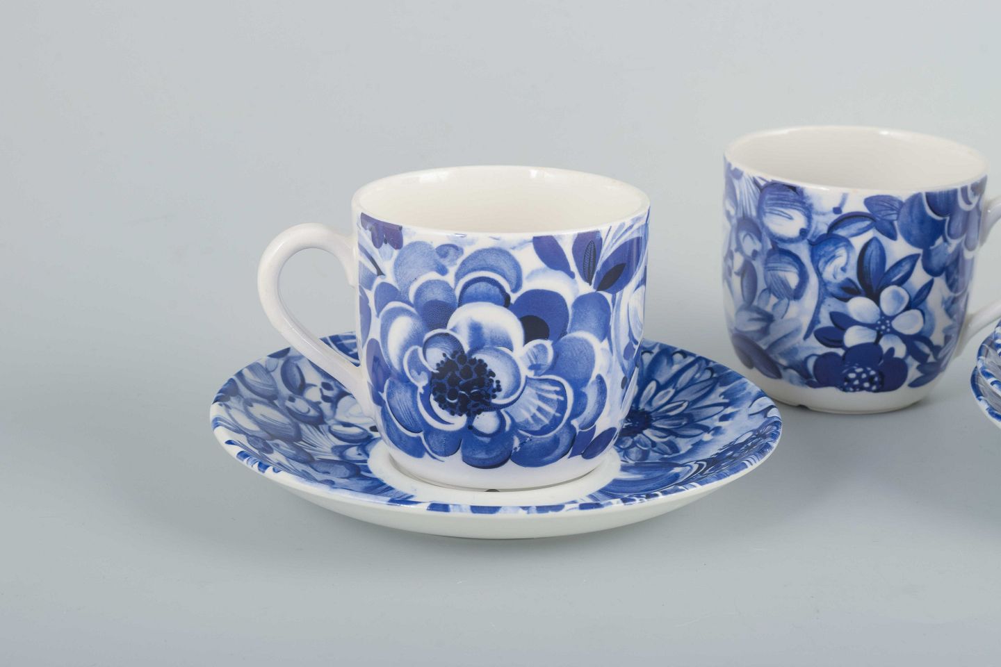Porcelæn med håndmalet blomstermotiv i blå toner.