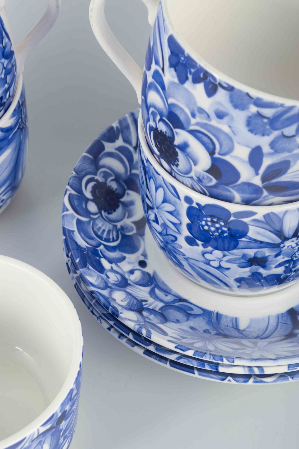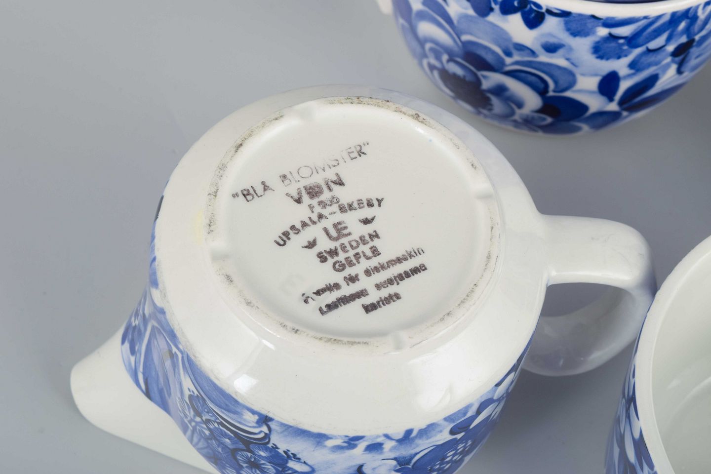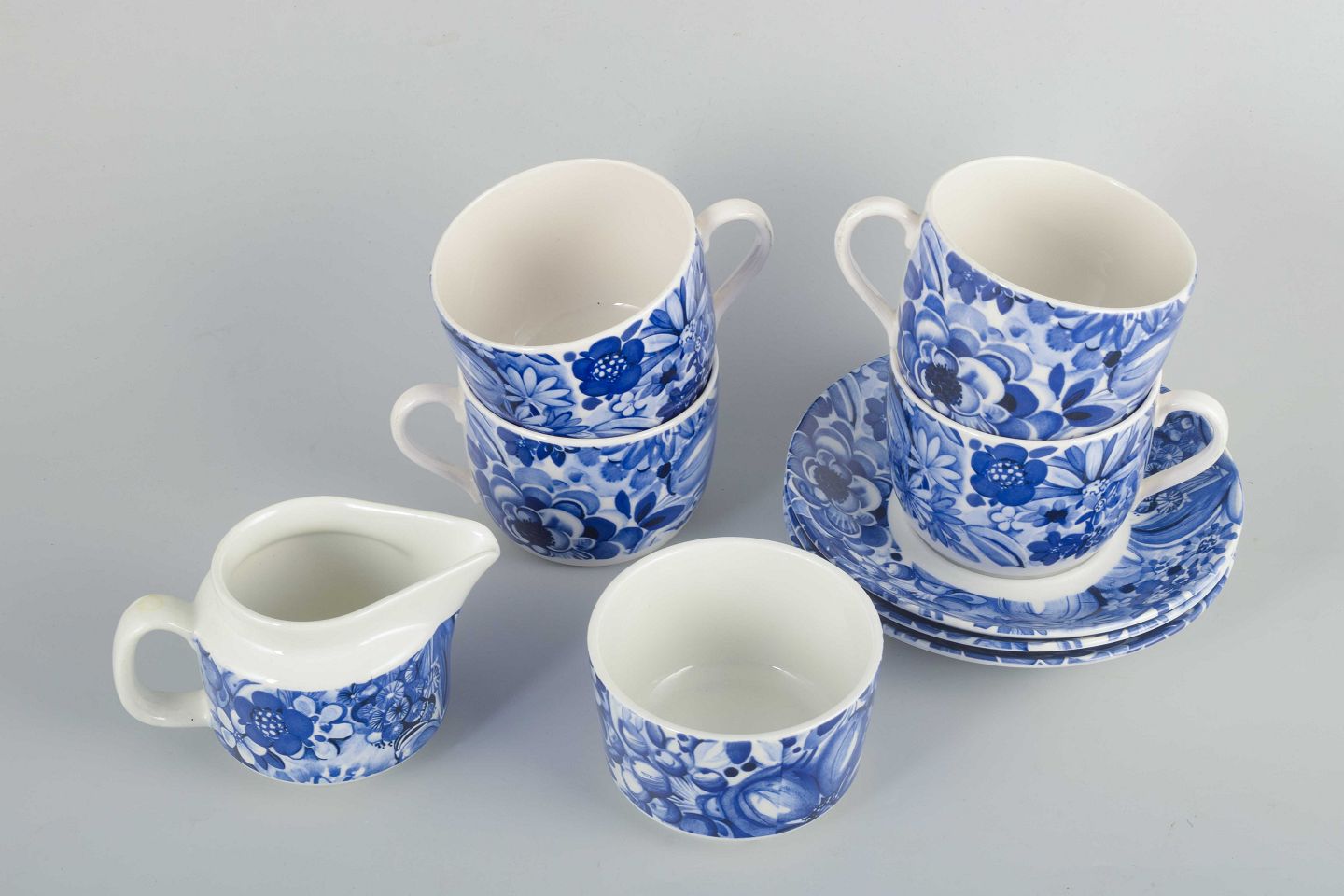 Gefle, "Blå Blomster"4 tekopper med underkopper, sukkerskål og flødekande, midt 1900-tallet.
