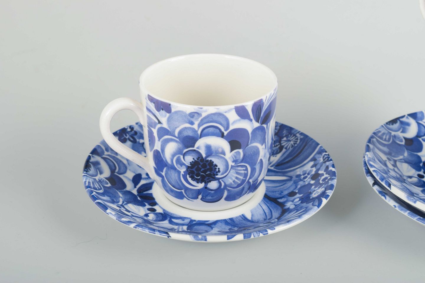 Porcelæn med håndmalet blomstermotiv i blå toner.
