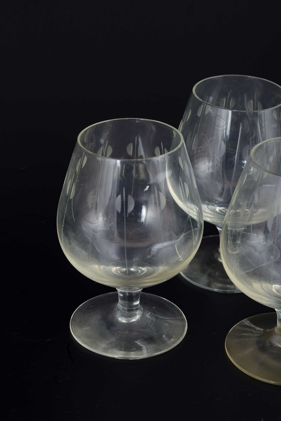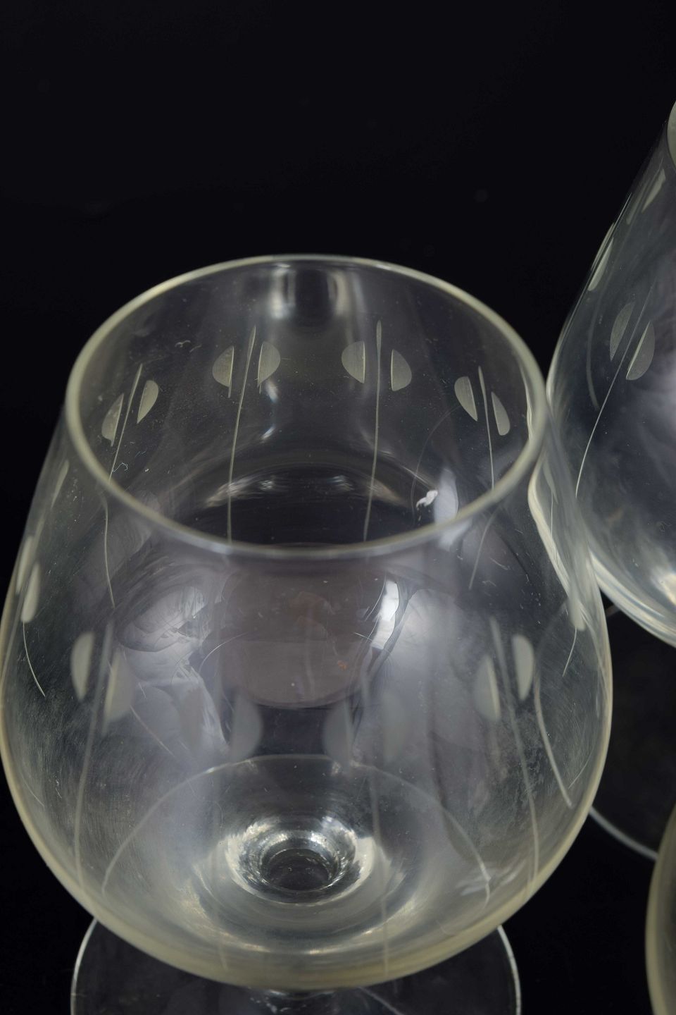Mundblæste glas med kort stilk og rundet bowle. Dekoreret med indgraveret mønster i form af lodrette linjer med ovale elementer.