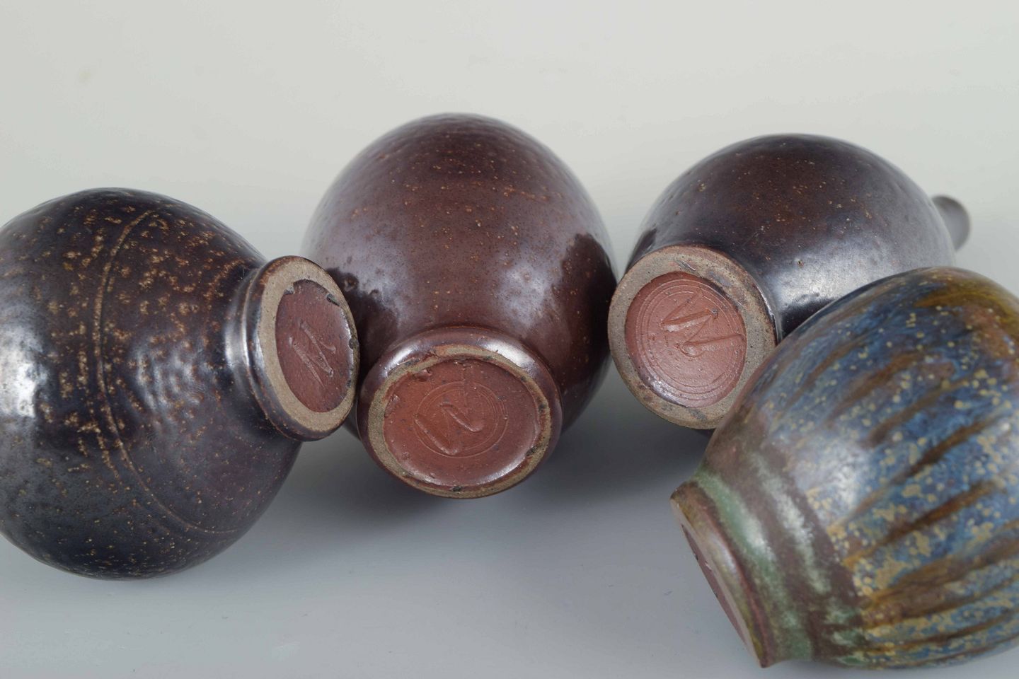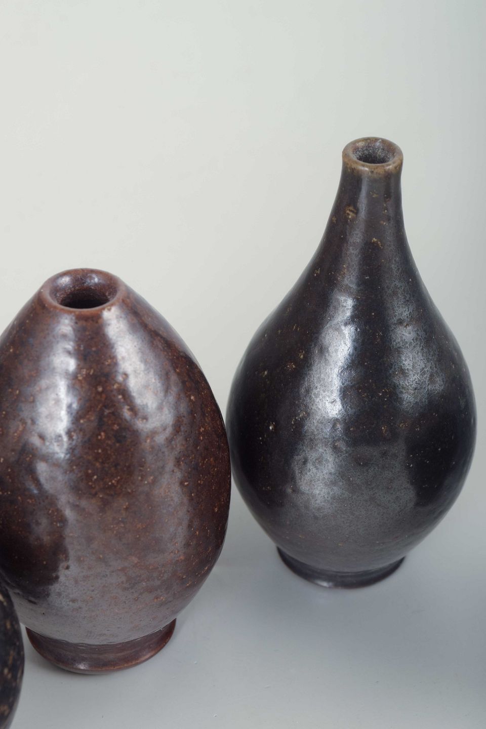Organisk formede vaser i drejet stentøj med rå overflader og glasurer i brune, sorte og blå-grønne toner.