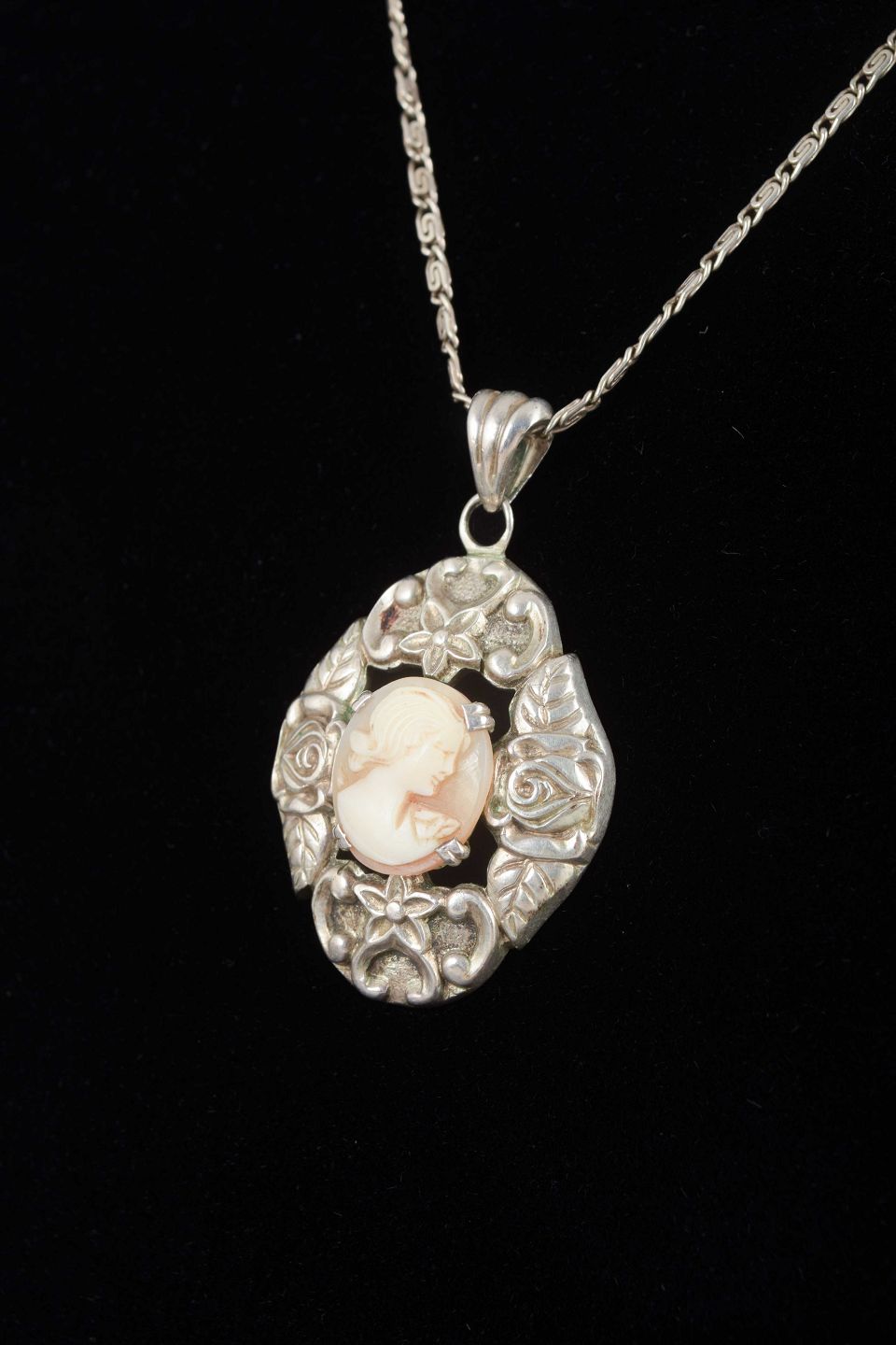Svensk sølvhalskæde med cameo, 1920/30’erneSølvhalskæde med vedhæng, smukt udført med en klassisk cameo og blomsterornamentik.
