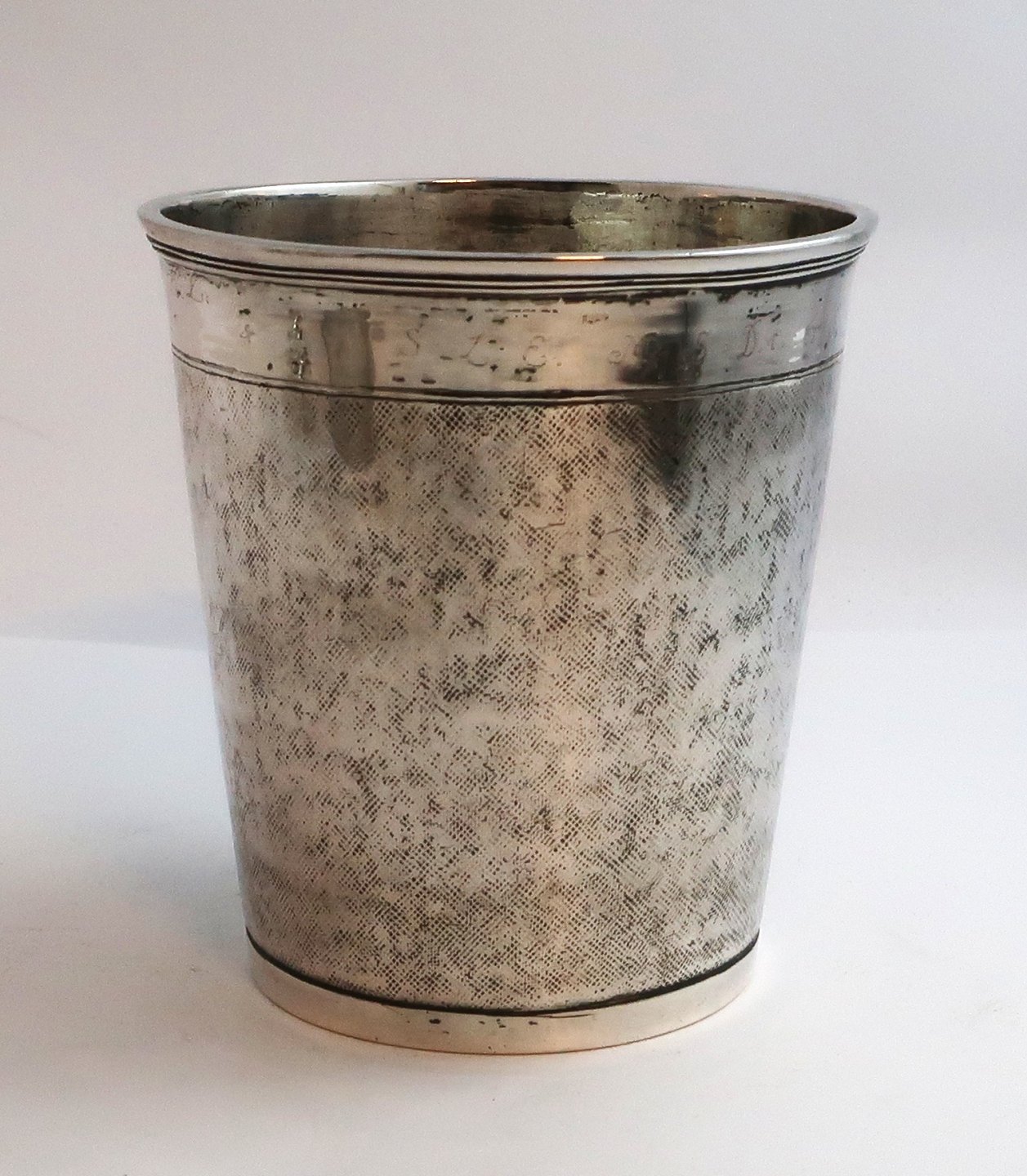 Großer Silberpokal. Silbermeister unbekannt. Gravur von 1756. Höhe 11 cm. Durchmesser 10 cm. Händler