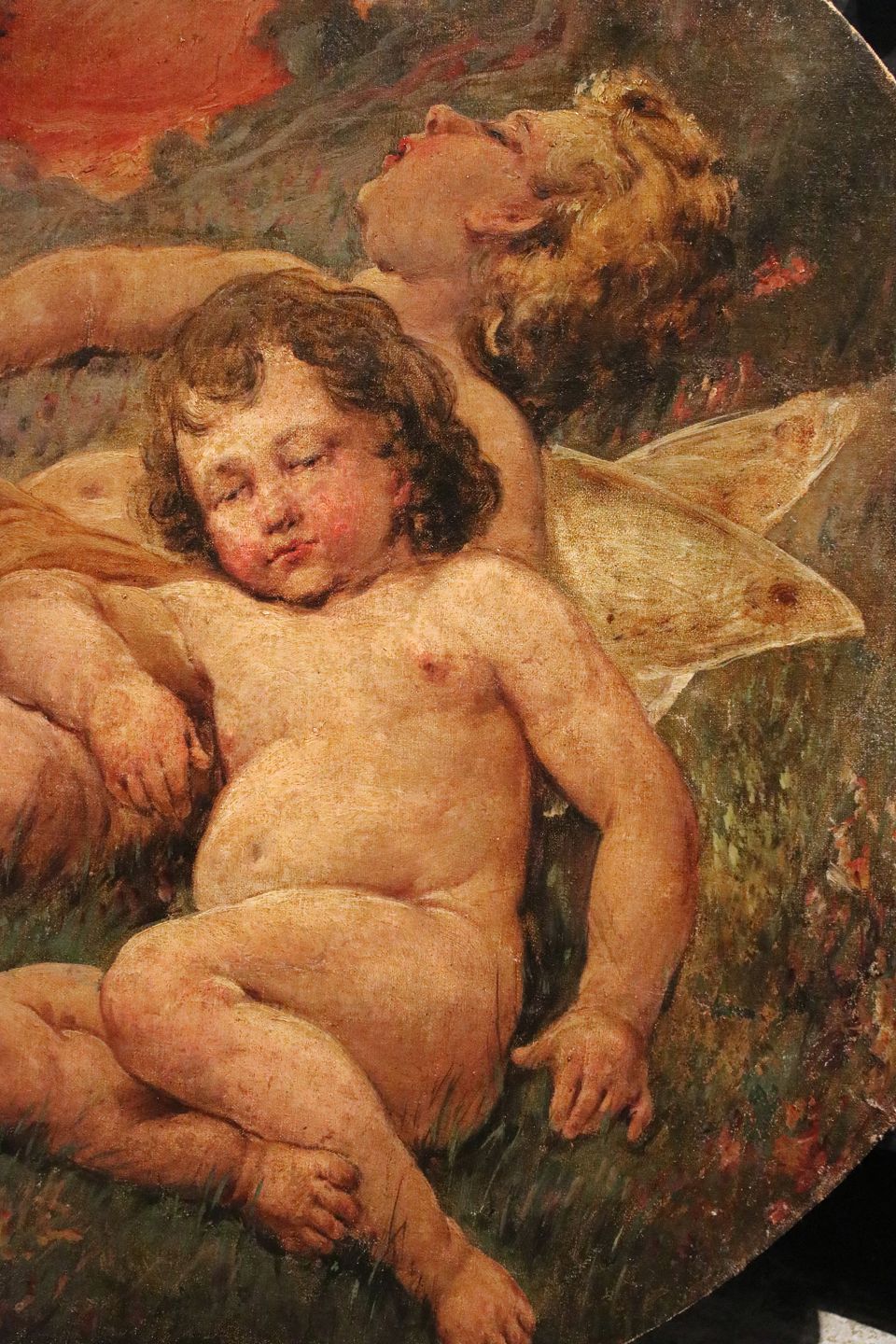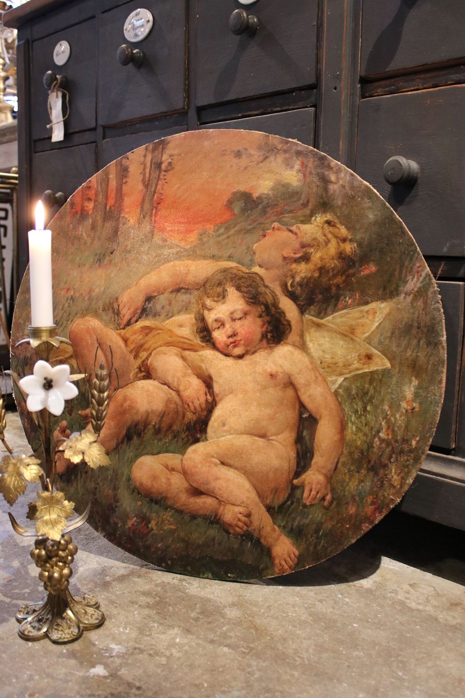 Gammelt fransk 1800 tals olie maleri på lærred med motiv af 2 små engle...
