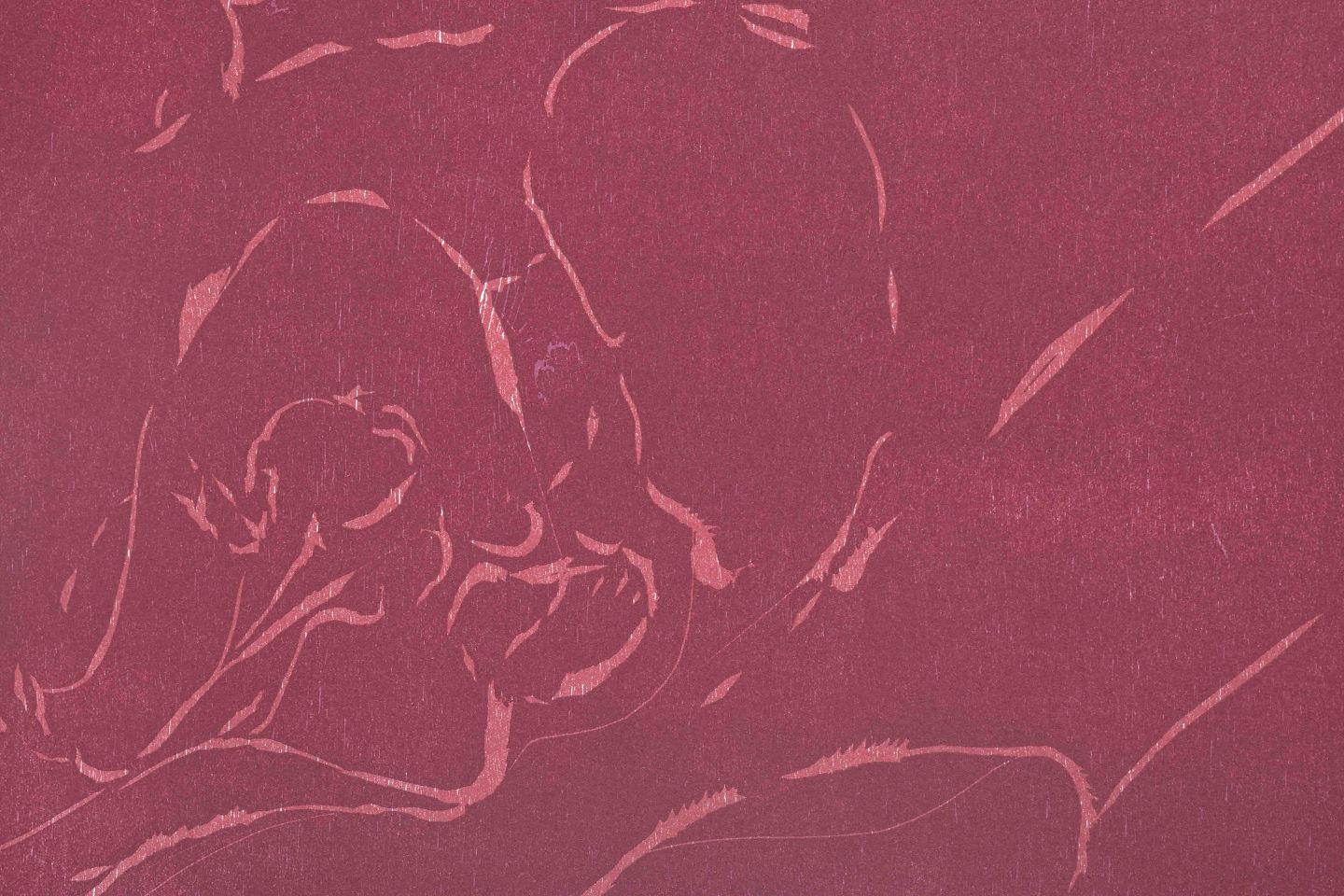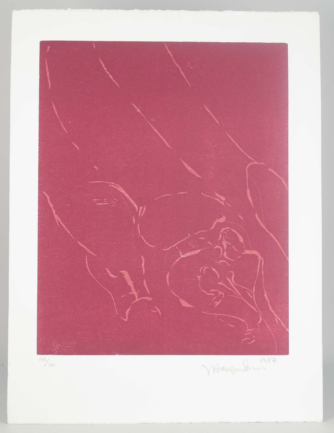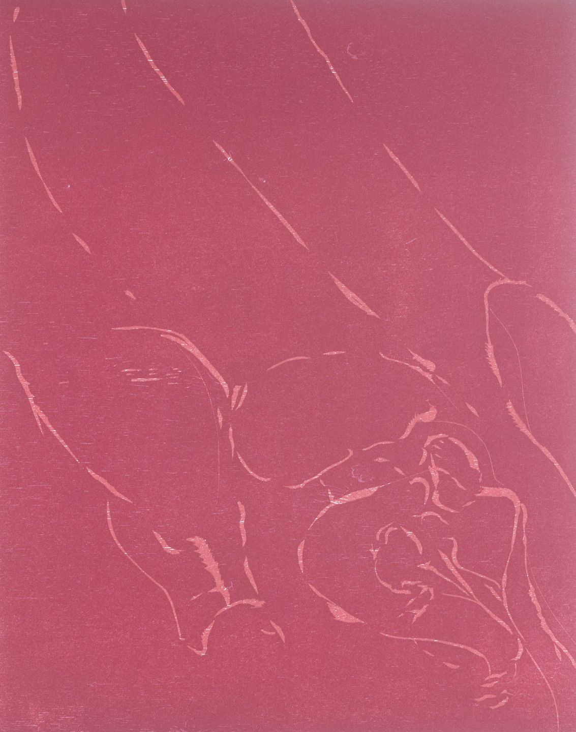 Abstrakt komposition i rødlige toner, hvor enkle konturer antyder menneskelige former i et stramt, ekspressivt udtryk. Et grafisk blad, der viser kunstnerens særlige evne til at skabe nærvær og dramatik med få virkemidler.